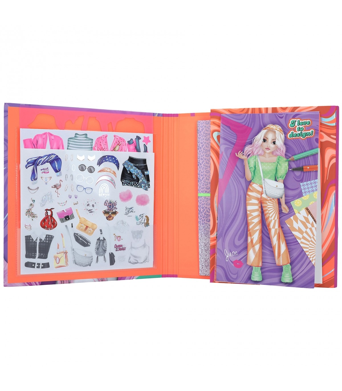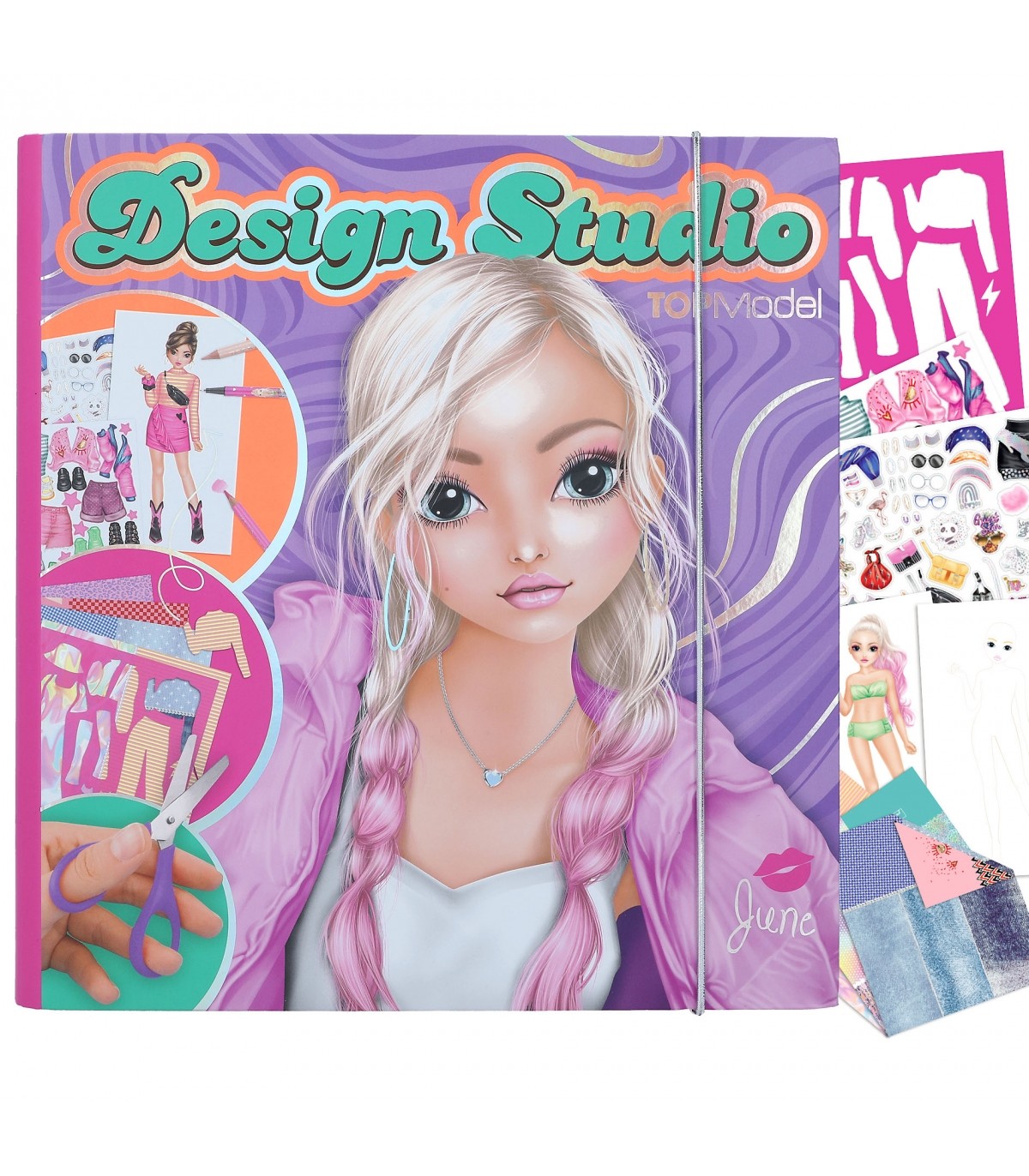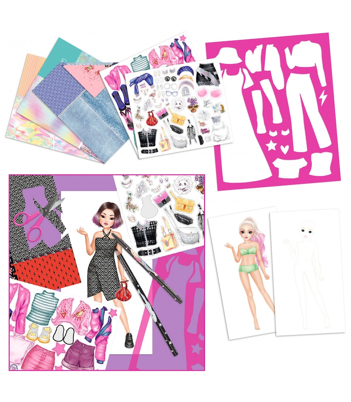 Dibujar y crear como una auténtica diseñadora. El cuaderno de dibujo TOPModel Design Studio consta de 30 páginas con figurines de modelos, 1 plantilla, 10 páginas con 20 estampados de estilos diferentes, 2 hojas de pegatinas y muchos ejemplos fáciles de diseño para poder inspirarse.