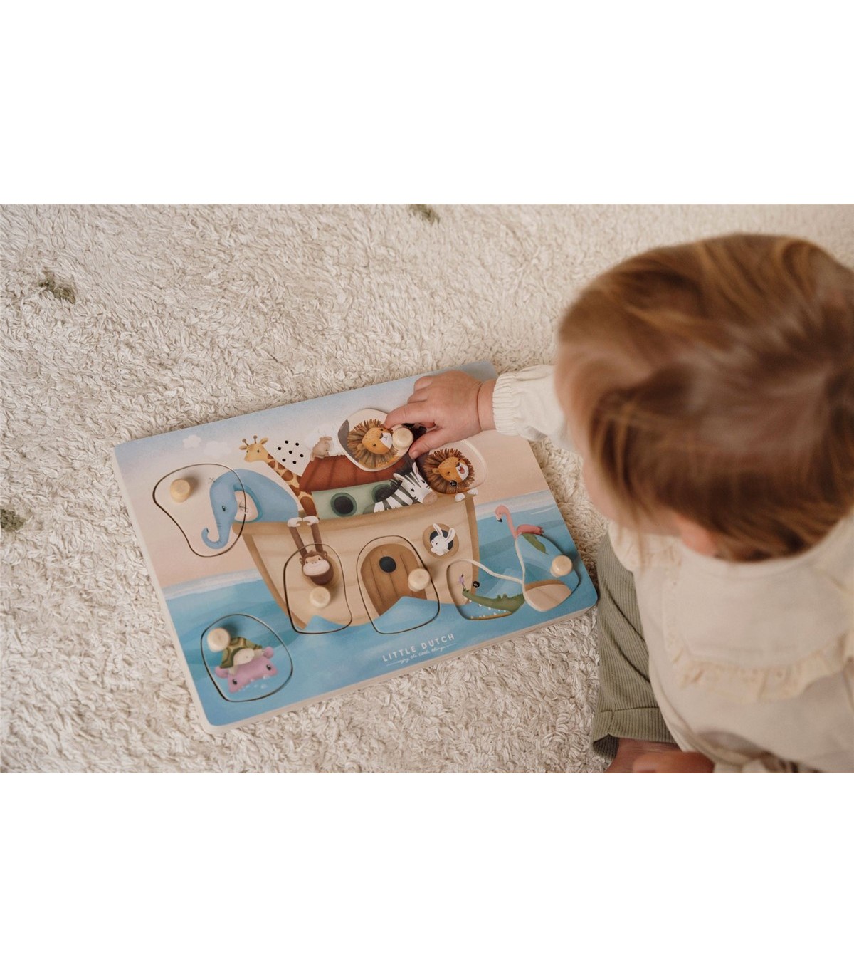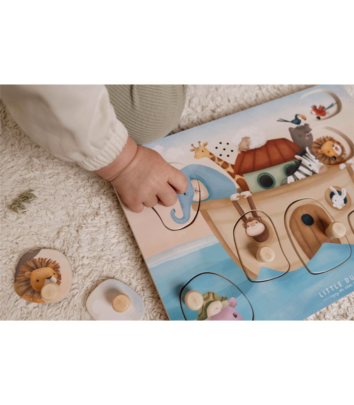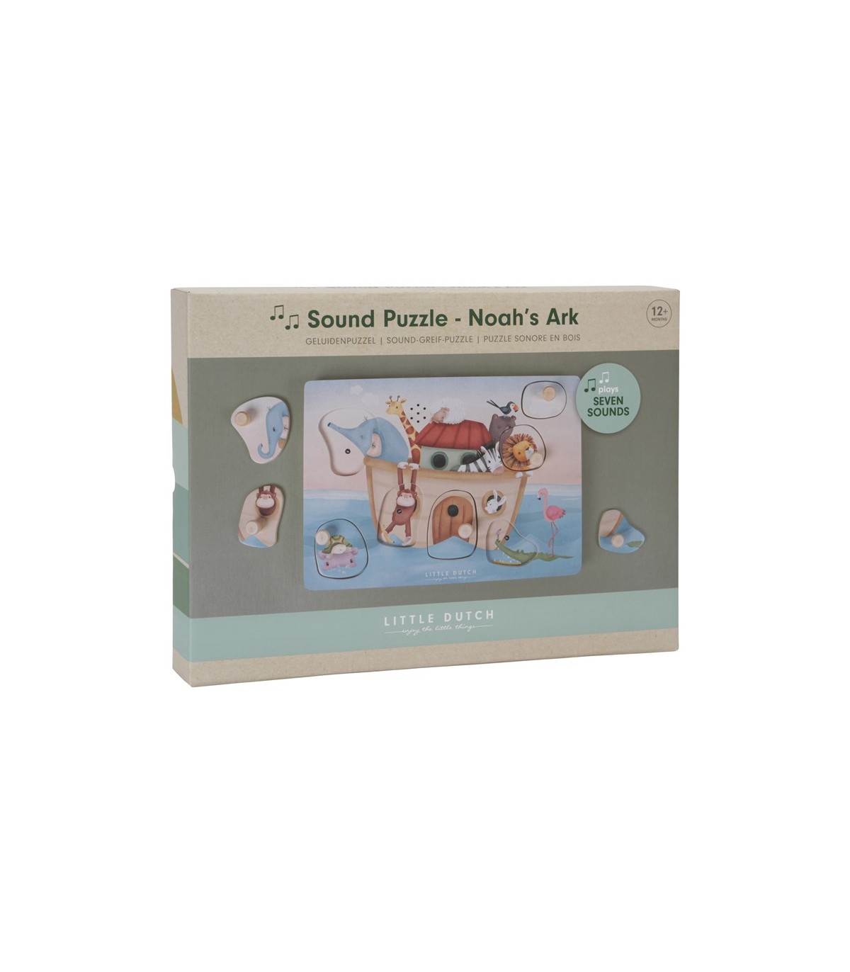 ¿Qué animales puedes encontrar en el Arca de Noé? Levanta las piezas del puzle y descubre uno por uno los sonidos de los animales. Al cocodrilo le gusta estar cerca del barco para atrapar algún pez, ¿sabes quién se esconde detrás de la puerta? Este divertido puzle con 7 sonidos diferentes alienta la coordinación y el vocabulario. Los sensores reaccionan cuando las piezas del puzle se levantan. Viene SIN pilas AAA.