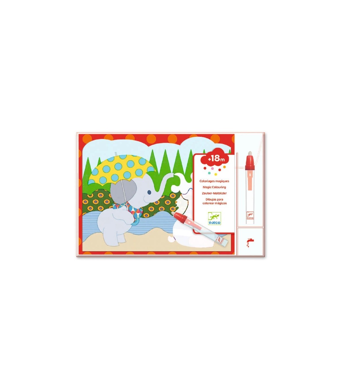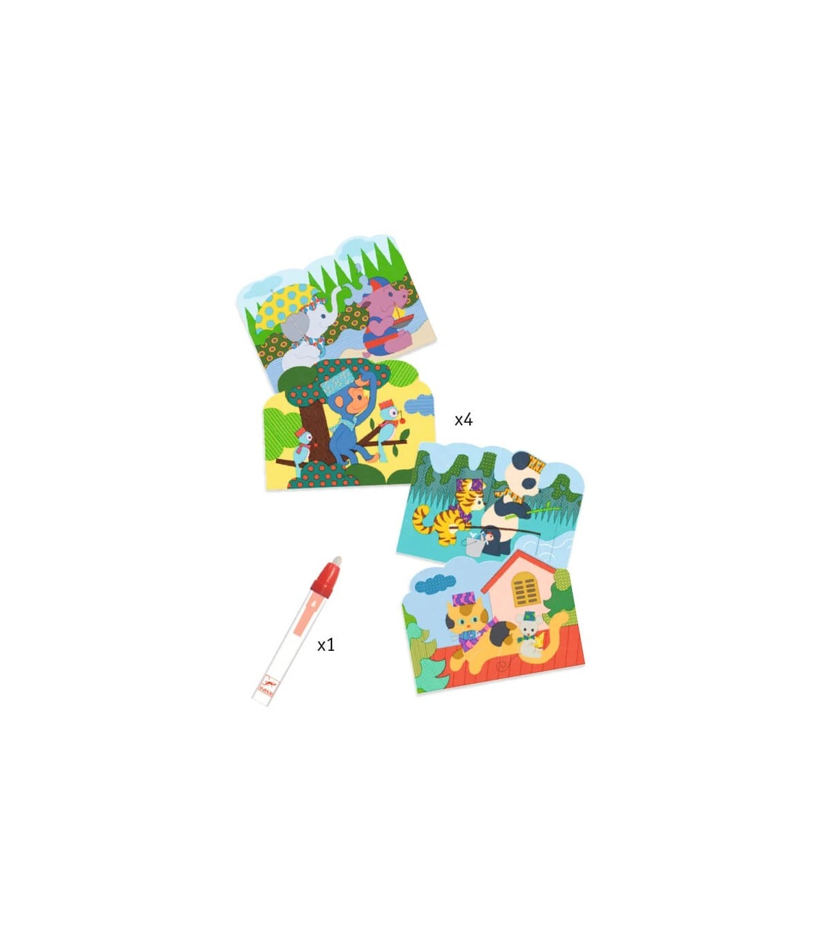 -Un pack de acuarelas adecuado para niños a partir de 18 meses. El niño colorea las partes blancas con el lápiz de agua para descubrir lo que se esconde en el cielo. Es mágico: los dibujos aparecen y cambian de color. Las tablas se secan y el niño vuelve a empezar.