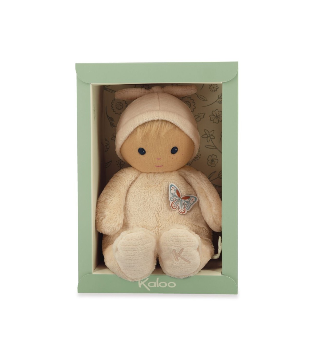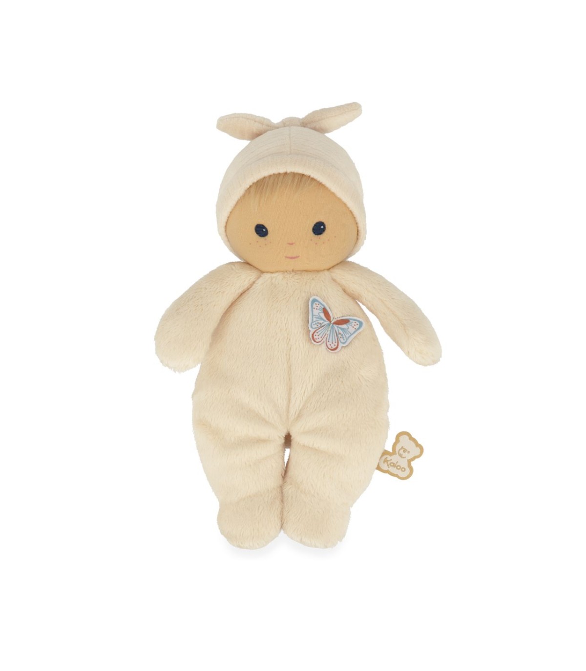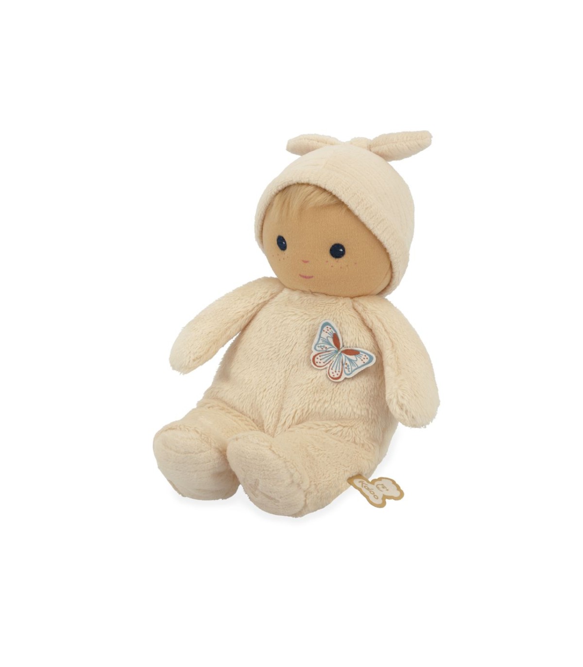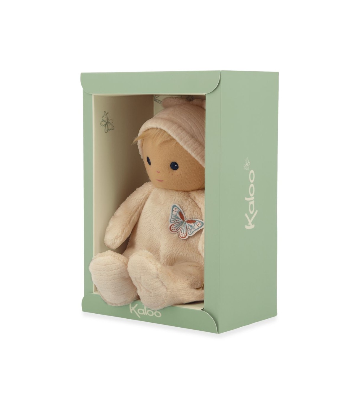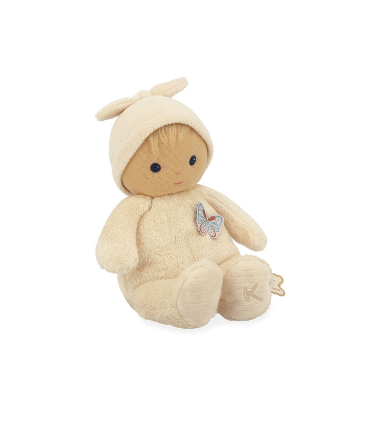 Bienvenida Baby Jasmin, una maravillosa muñeca de tela, perfecta como edredón o primera muñeca para los más pequeños. Esta encantadora muñeca bebé de 24 cm, con cautivadores ojos azules, está vestida con un elegante tono crema que evoca pureza y ternura. El suave microterciopelo y la pana, enriquecidos con poliéster reciclado, brindan una textura lujosa y reconfortante, perfecta para abrazar. Su cuerpo está decorado con una bonita mariposa, que recuerda la ligereza y delicadeza de las flores, un detalle encantador que seguro te encantará. La etiqueta con forma de mariposa es también una invitación a desarrollar la destreza y la curiosidad sensorial del bebé. Cada interacción con Bébé Jasmin estimula suavemente los sentidos y apoya el desarrollo táctil de los niños pequeños.