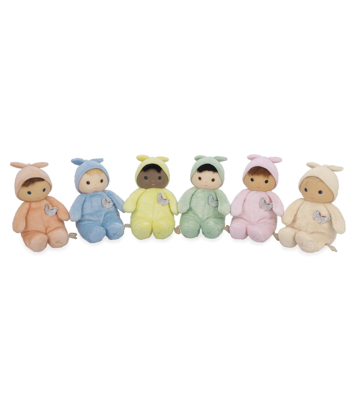Enamórate de Baby Camelia: una encantadora y reconfortante muñeca de tela, ideal como edredón o como primera muñeca del bebé. Esta adorable muñeca marrón de 24 cm se distingue por su pijama rosa y sus bonitos ojos verdes. Fabricada en microterciopelo extrasuave, pana y rellena de poliéster reciclado, esta muñeca de tela ofrece una textura exquisita que invita a más abrazos.