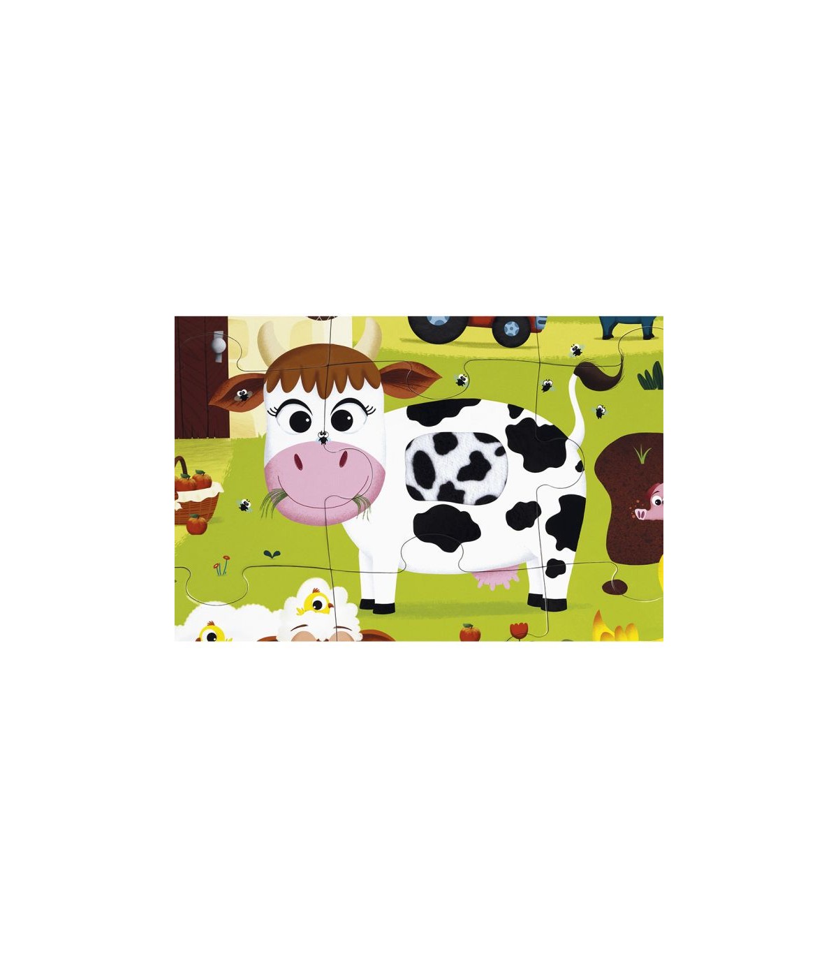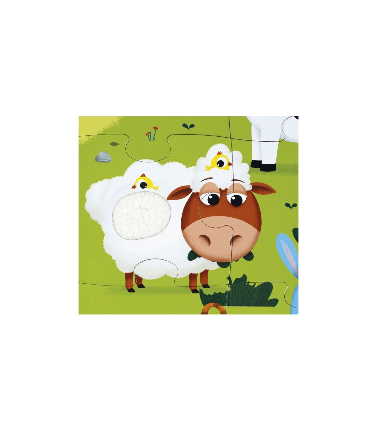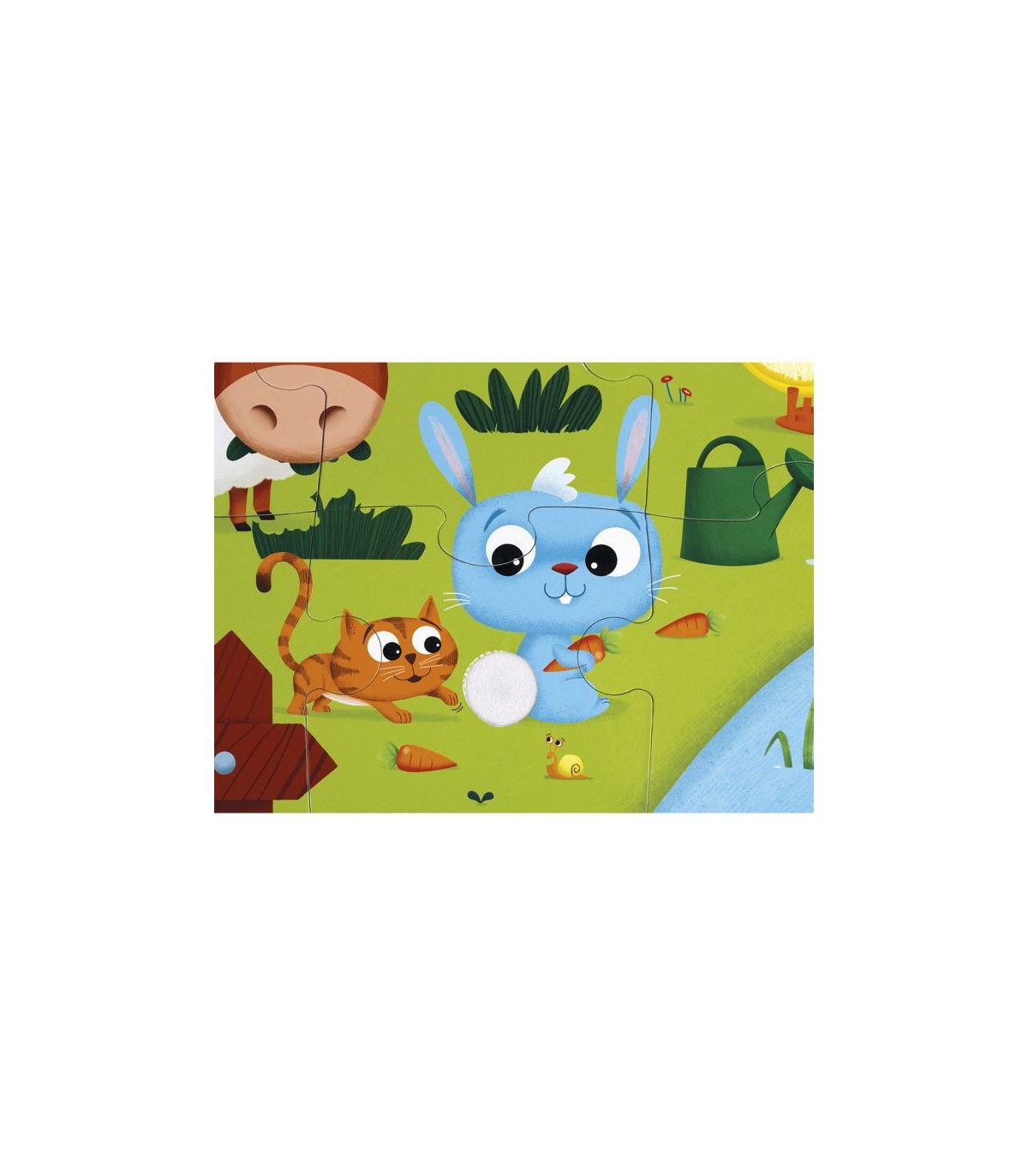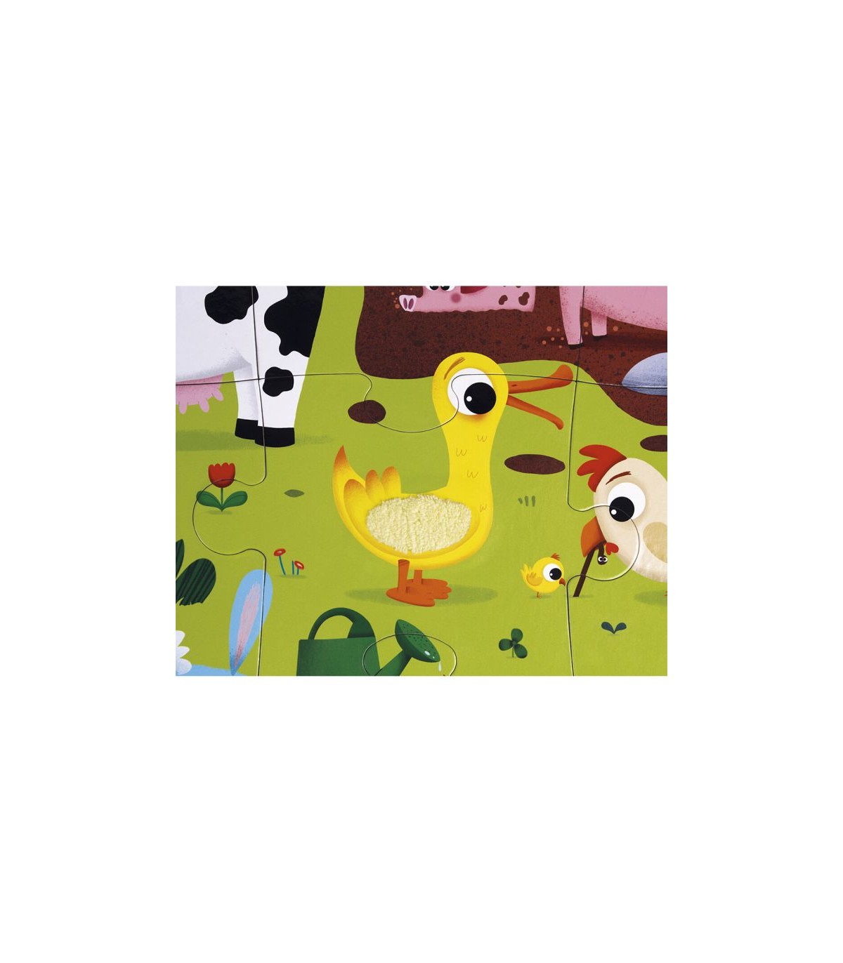 Puzle gigante con piezas de cartón rígido texturizado (pelo de la vaca, de la oveja, imitación de la cola del conejo, cerdo, pato, cresta del gallo, rana). Ilustraciones en colores suaves y adaptadas para niños sobre el tópico de la granja. Contiene un poster a utilizar como modelo. Número de piezas : 20. Este producto está hecho de material certificado FSC® y otro material controlado.