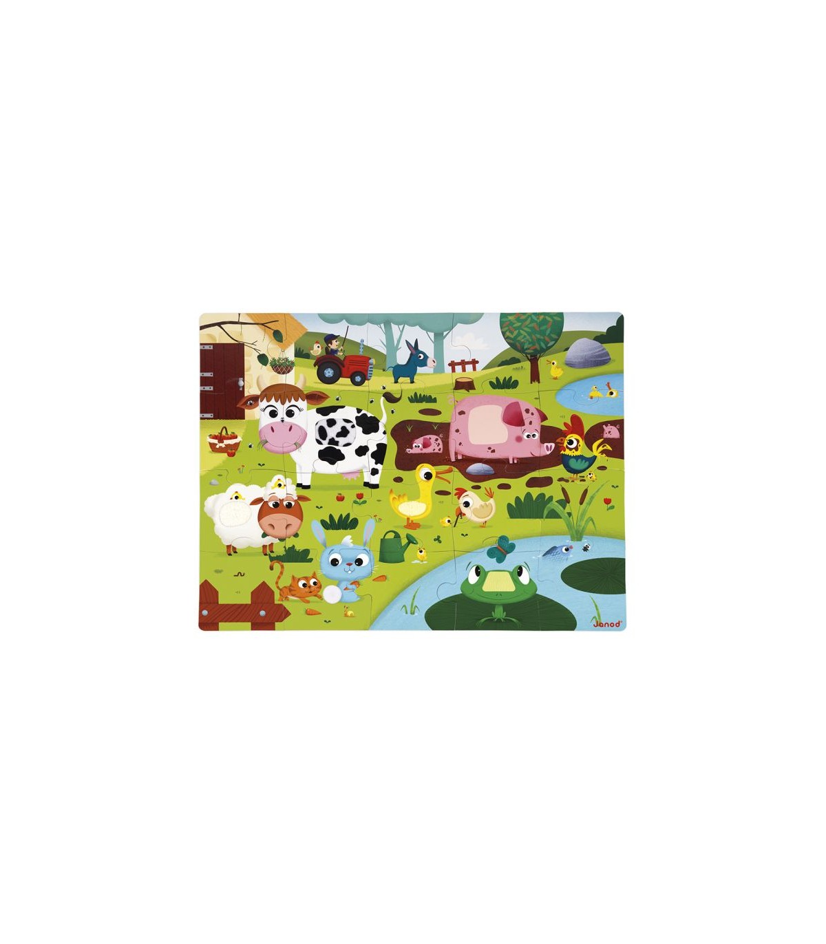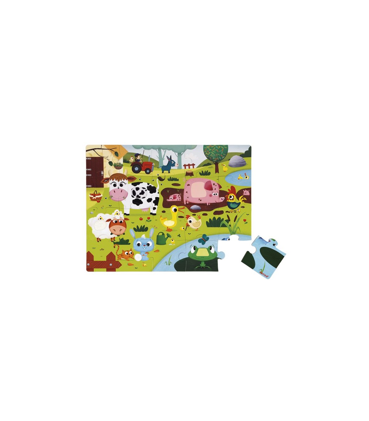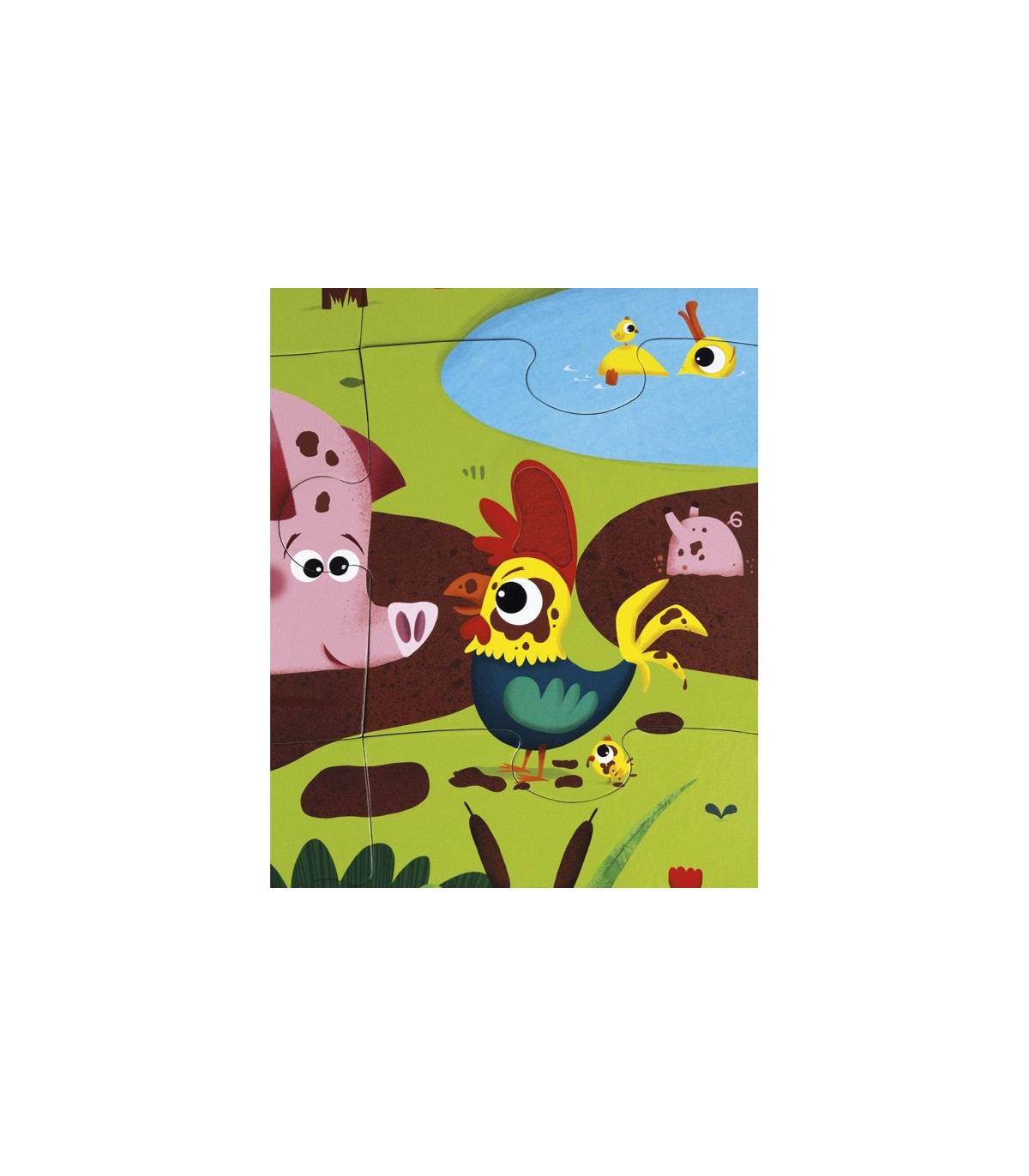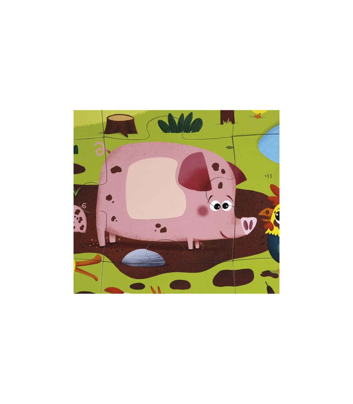 Puzle gigante con piezas de cartón rígido texturizado (pelo de la vaca, de la oveja, imitación de la cola del conejo, cerdo, pato, cresta del gallo, rana). Ilustraciones en colores suaves y adaptadas para niños sobre el tópico de la granja. Contiene un poster a utilizar como modelo. Número de piezas : 20. Este producto está hecho de material certificado FSC® y otro material controlado.