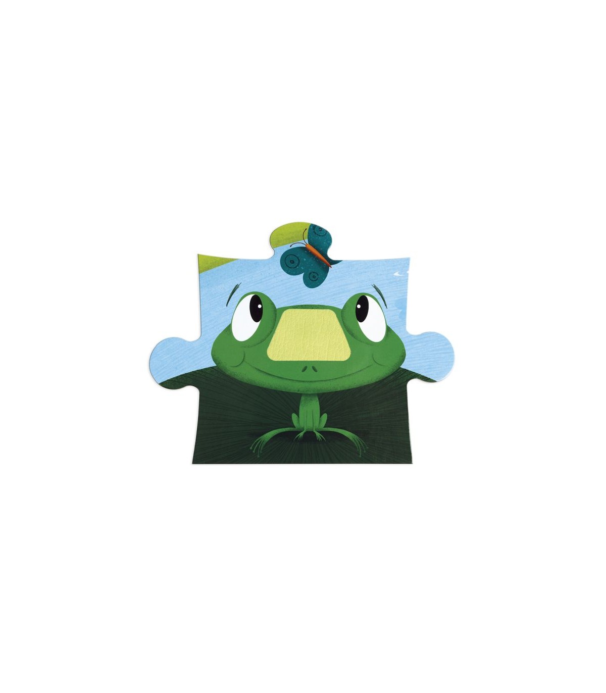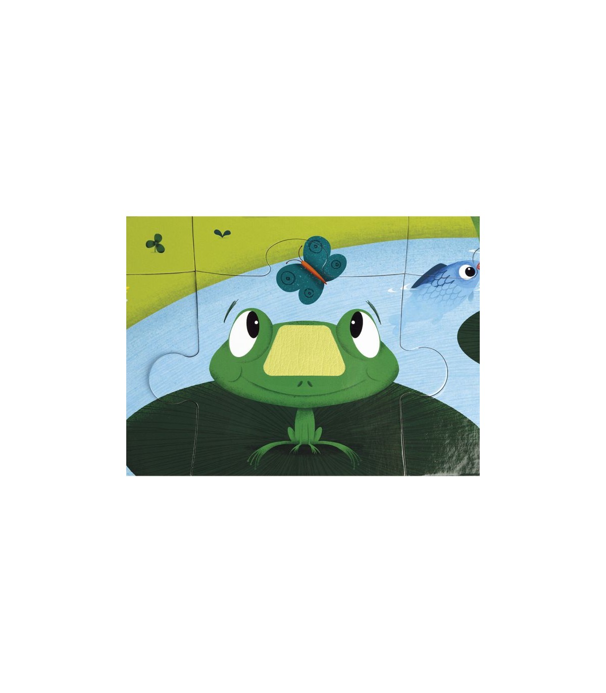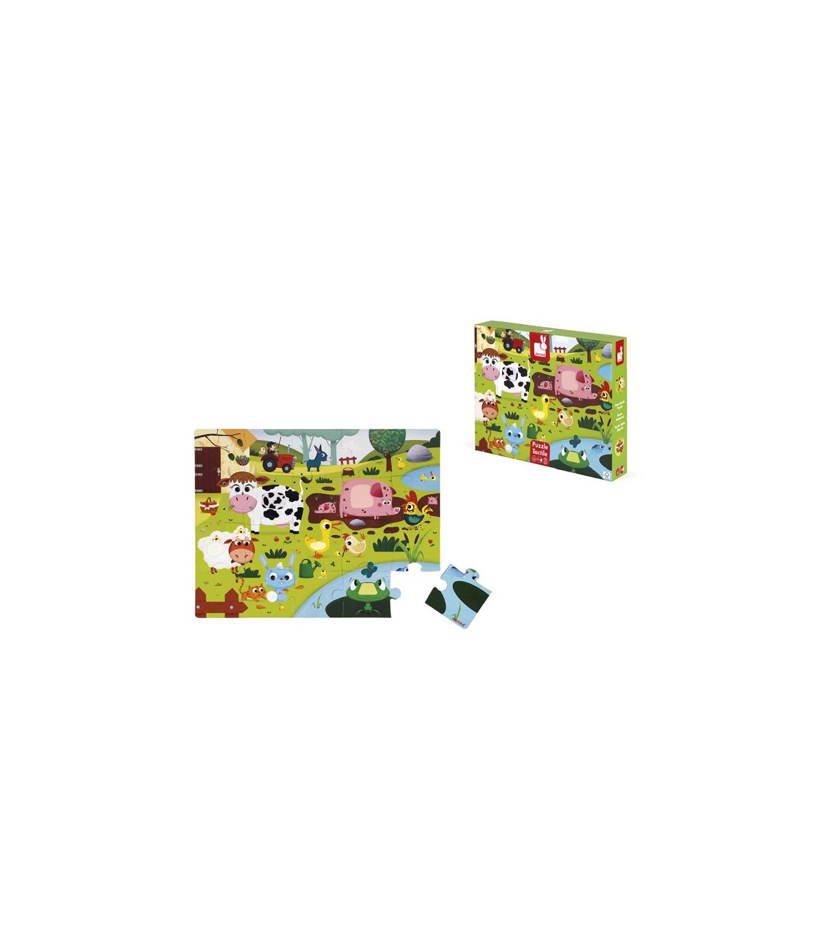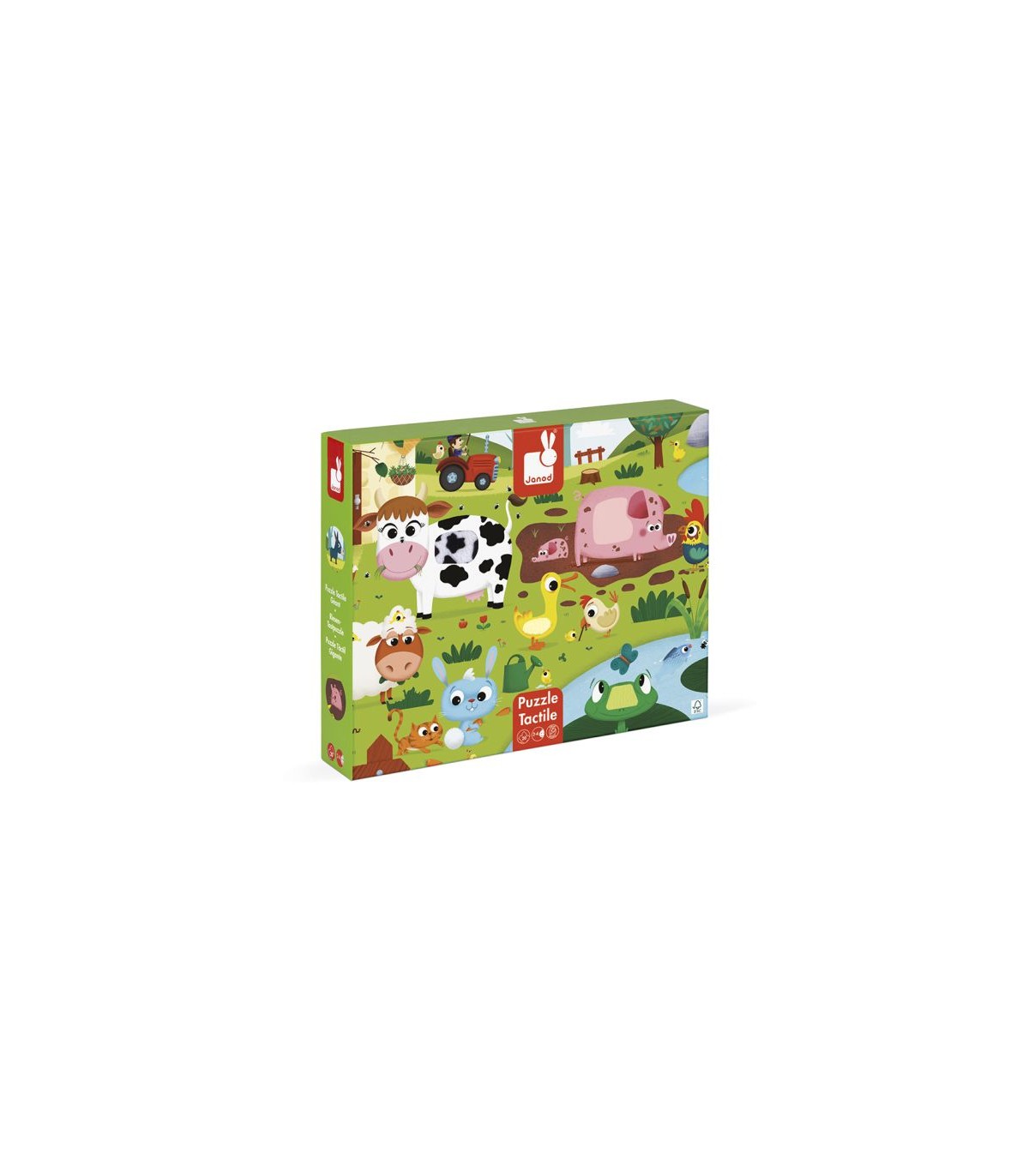 Puzle gigante con piezas de cartón rígido texturizado (pelo de la vaca, de la oveja, imitación de la cola del conejo, cerdo, pato, cresta del gallo, rana). Ilustraciones en colores suaves y adaptadas para niños sobre el tópico de la granja. Contiene un poster a utilizar como modelo. Número de piezas : 20. Este producto está hecho de material certificado FSC® y otro material controlado.