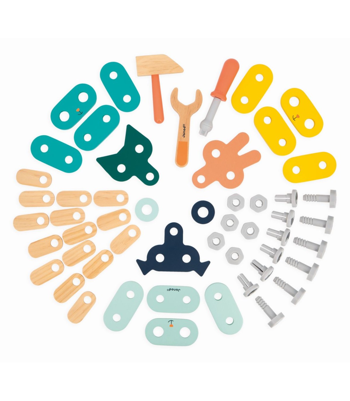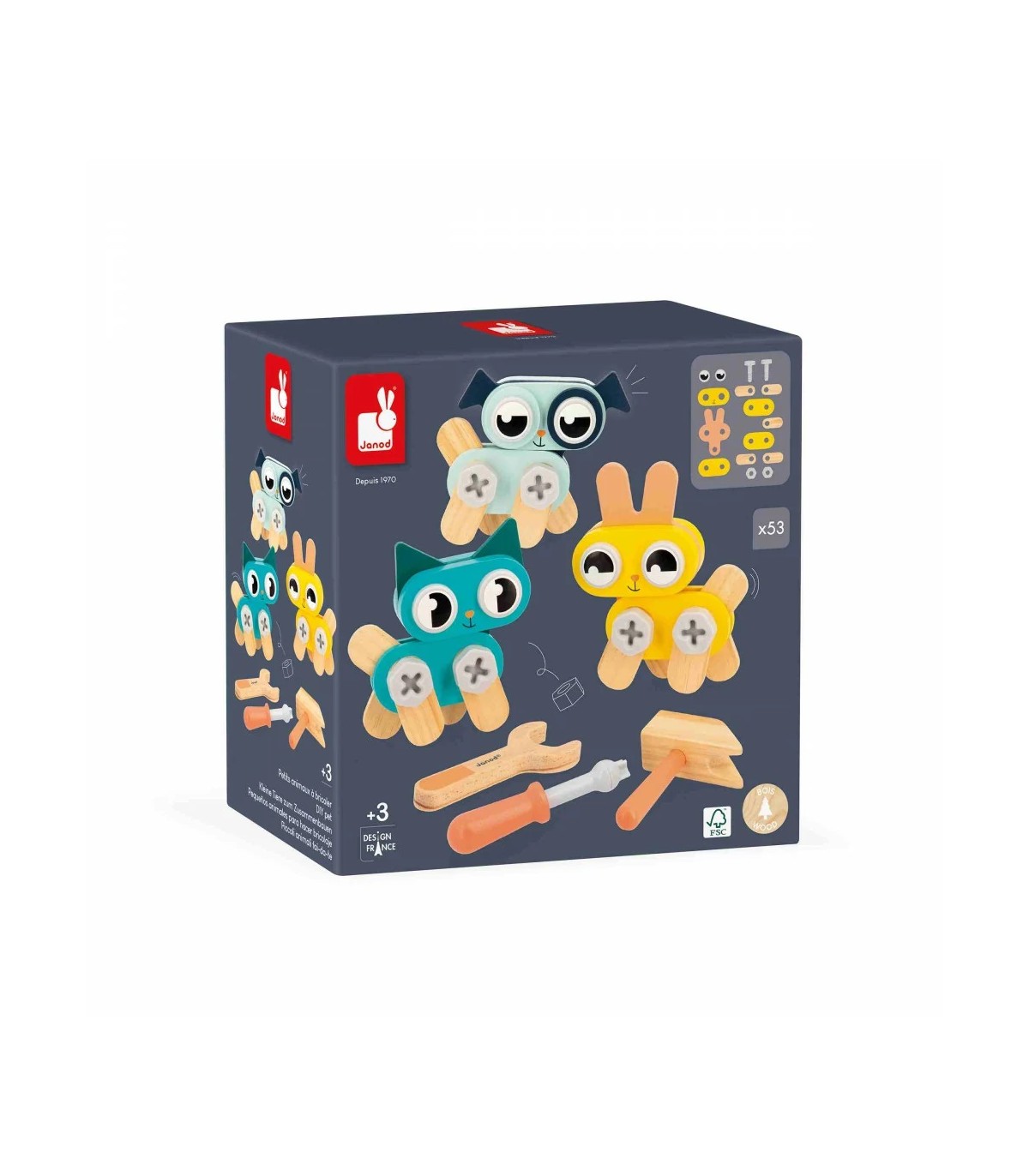 ¡Primeros pasos en el bricolaje! Con estos 3 animales de madera para construir, los niños a partir de 3 años montarán paso a paso a sus amiguitos. Ideal para desarrollar la motricidad fina y la imaginación de los niños pequeños, ¡este juego de construcción hará las delicias de todos los aficionados al bricolaje! Tendrán a su disposición todo lo necesario para construir un gato, un perro y un conejo: ¡53 piezas y accesorios en total! Este juego de bricolaje consta de: 3 herramientas (destornillador, martillo y llave inglesa de madera), 32 piezas de madera y 18 elementos de plástico (tornillos, tuercas e inserciones).