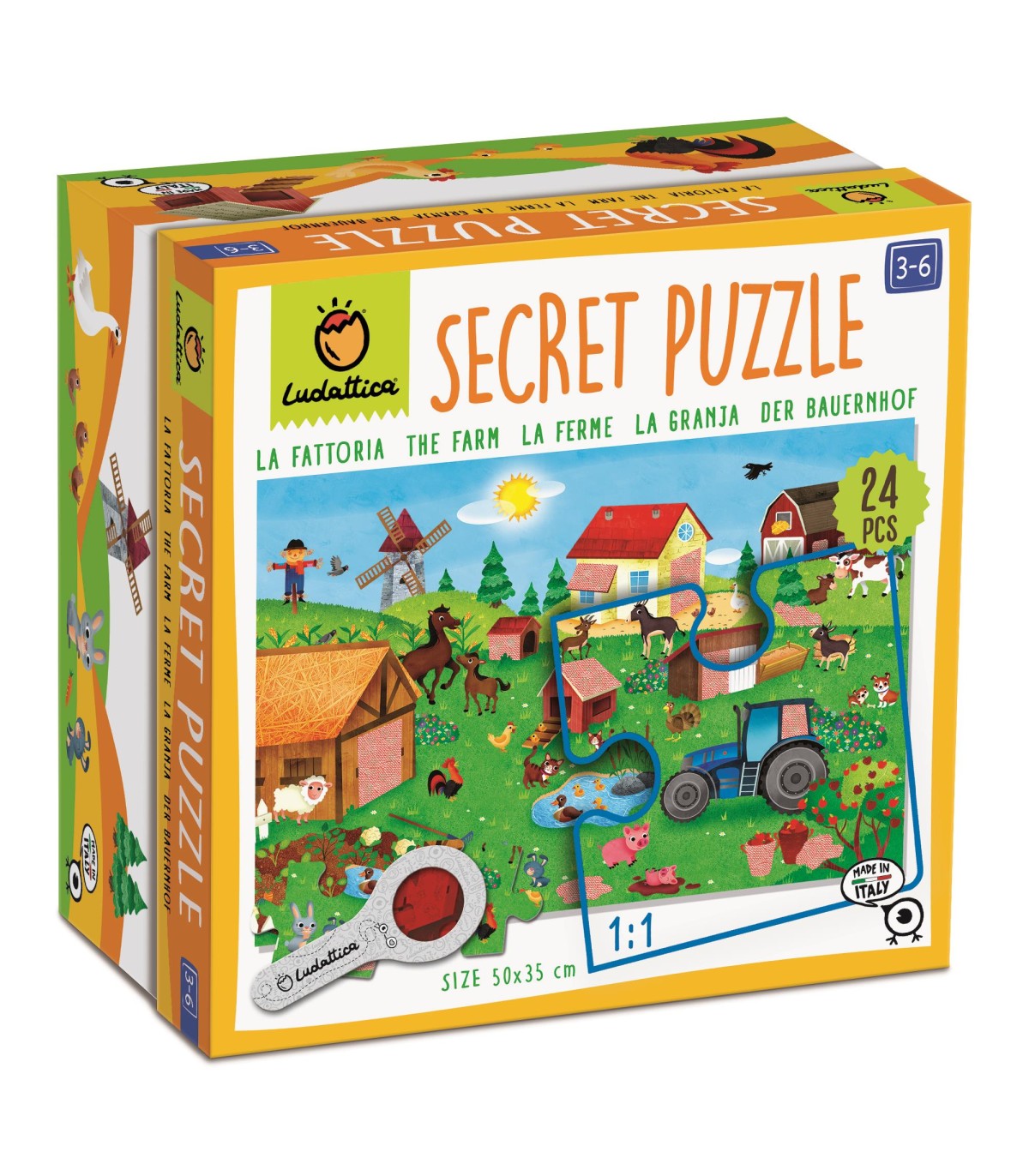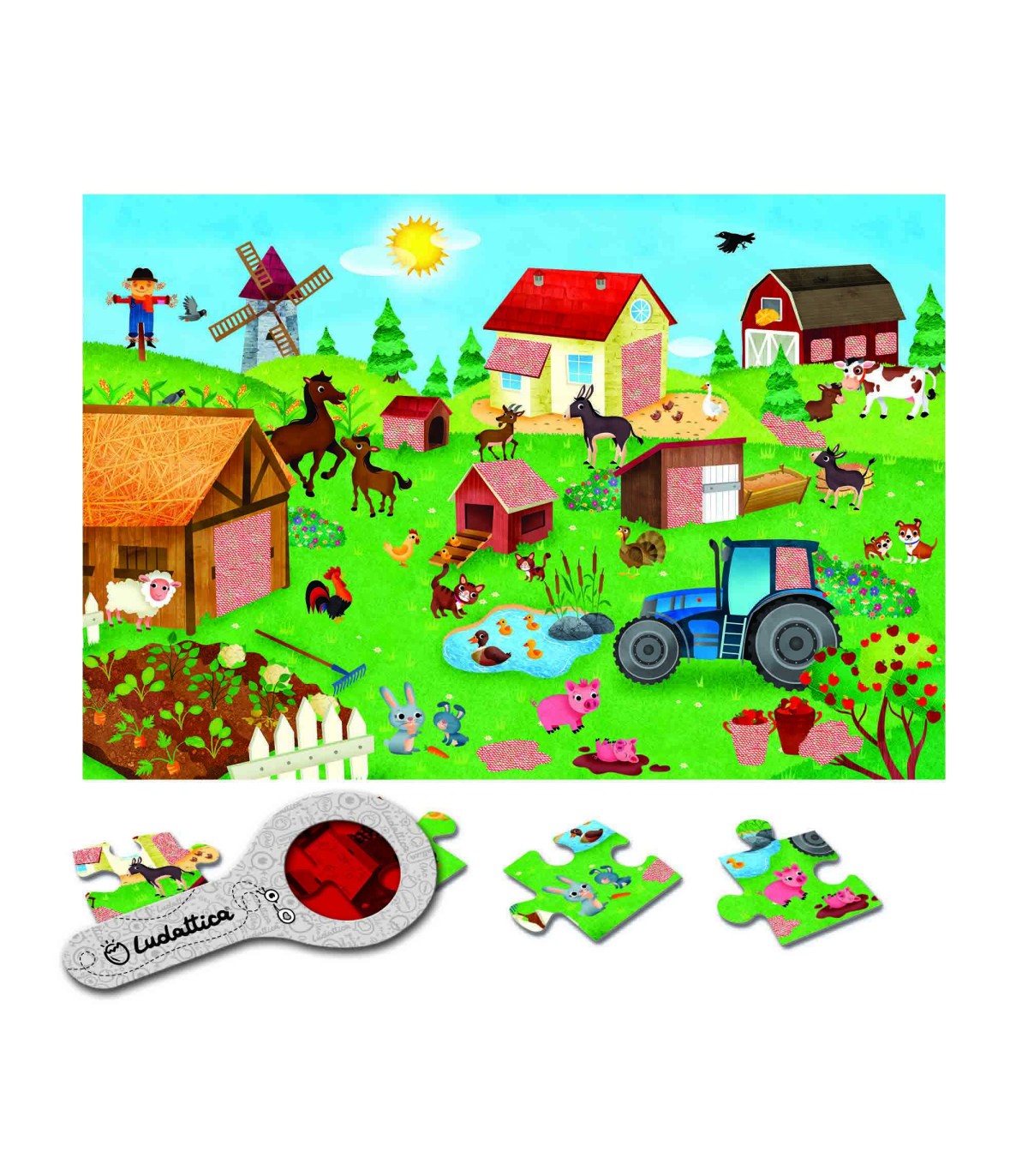 Encaja las 24 piezas y construye el escenario de la granja, ¡Después descubre los secretos del mundo de los animales con la lupa proporcionada!