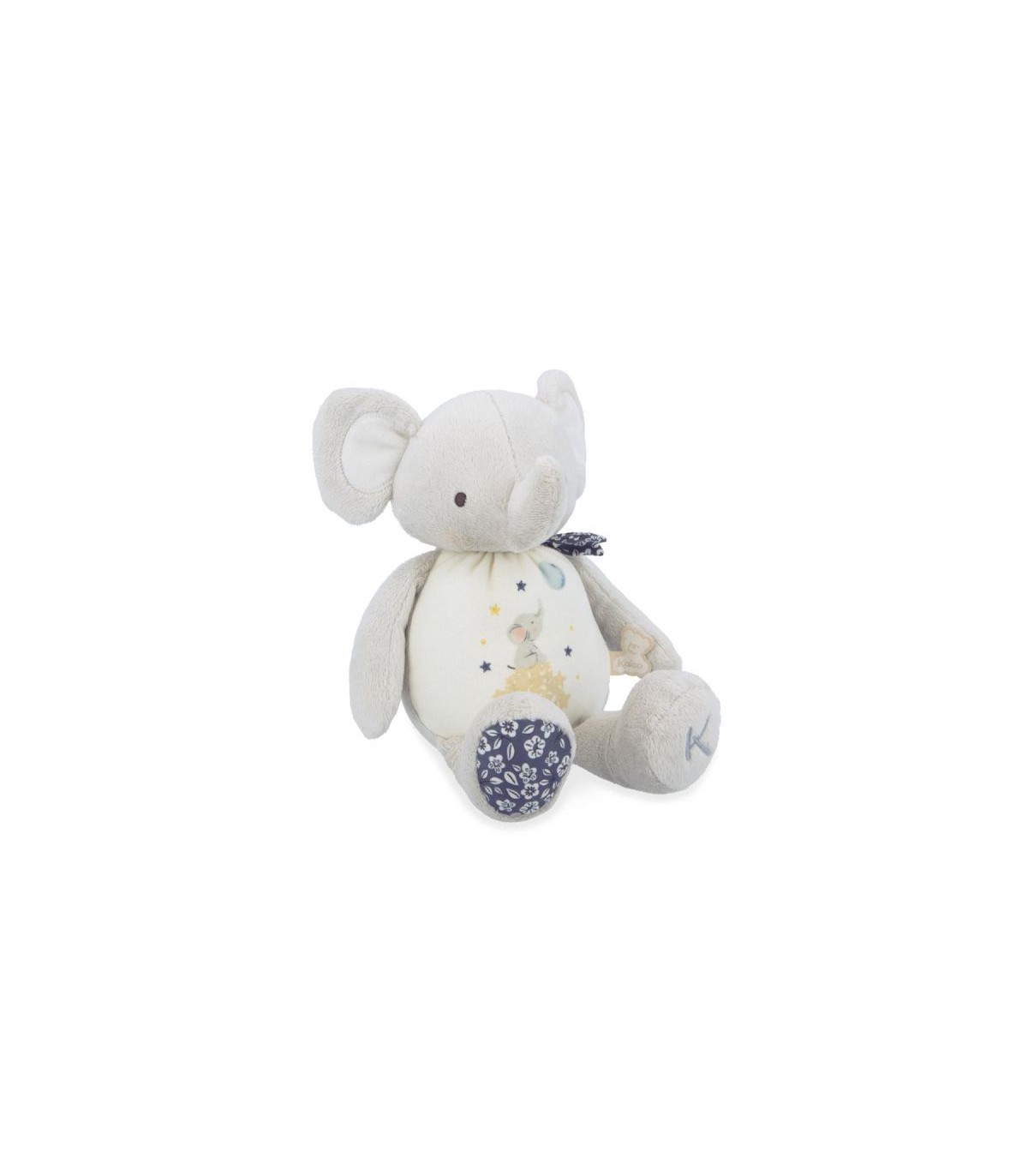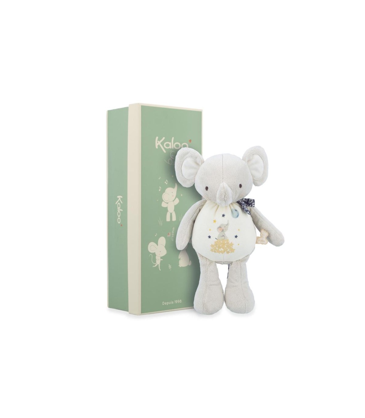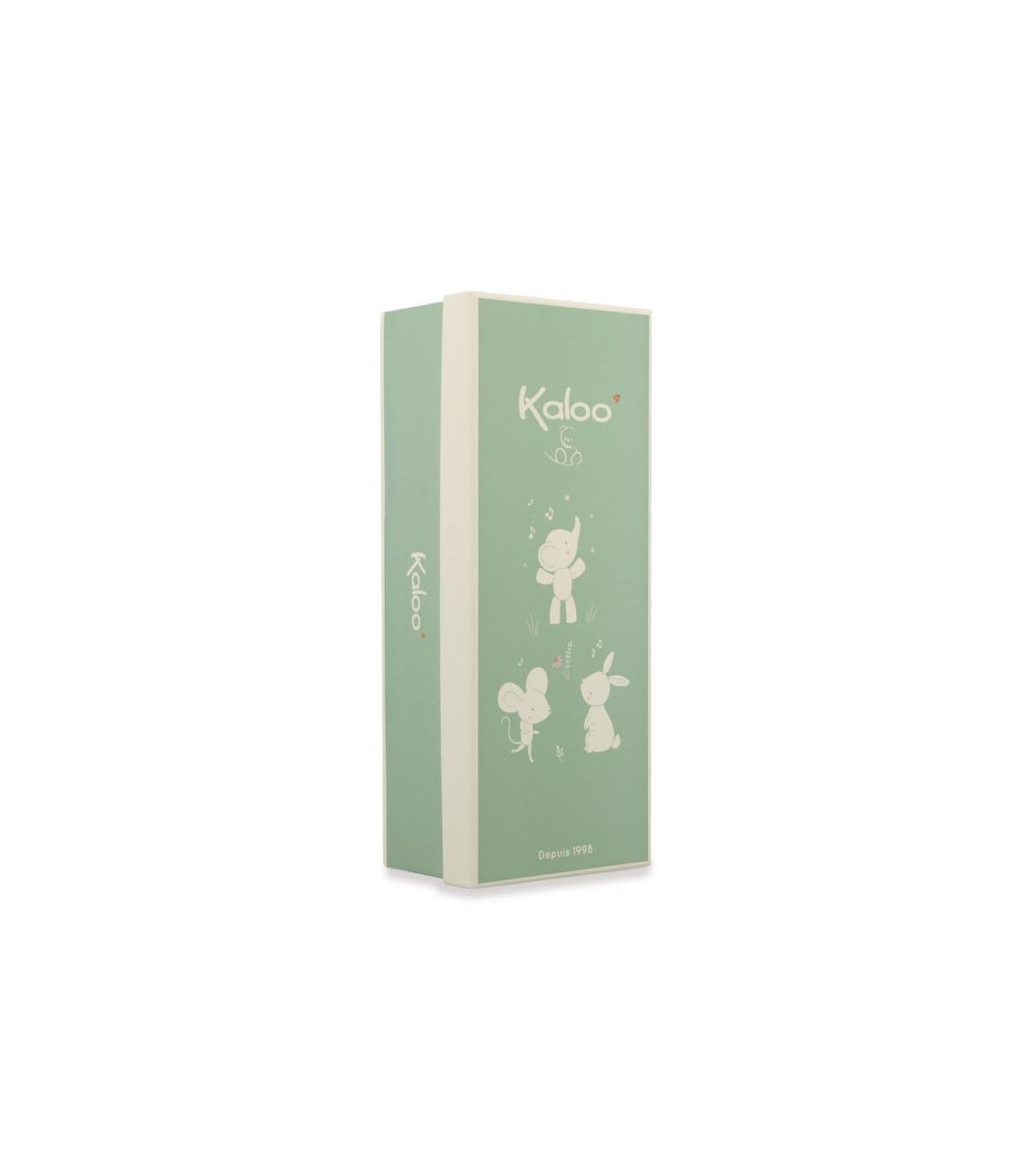 Cuidadosamente diseñado, este peluche sonoro está realizado en microterciopelo, popelina y pelo sintético, todo ello en poliéster reciclado, incluido el acolchado: ¡un 86 % de materiales reciclados, para una composición sin concesiones! Recibirás este adorable elefante de peluche presentado en su preciosa caja regalo con tapa, perfecta para ofrecerlo en las mejores condiciones para un nacimiento. Para un regalo personalizado, se proporciona un inserto debajo de la tapa de la caja. Esta bonita caja se puede reutilizar fácilmente para guardar pequeñas pertenencias y recuerdos del bebé. Lavable a máquina a 30°, este peluche que mejora el sonido es adecuado desde el nacimiento. Forma parte de la colección Petites Chansons de Kaloo: una gama dedicada al despertar a los sonidos, desarrollada con un equipo de psicomotricistas y compuesta por una variedad de sonidos para estimular al bebé.