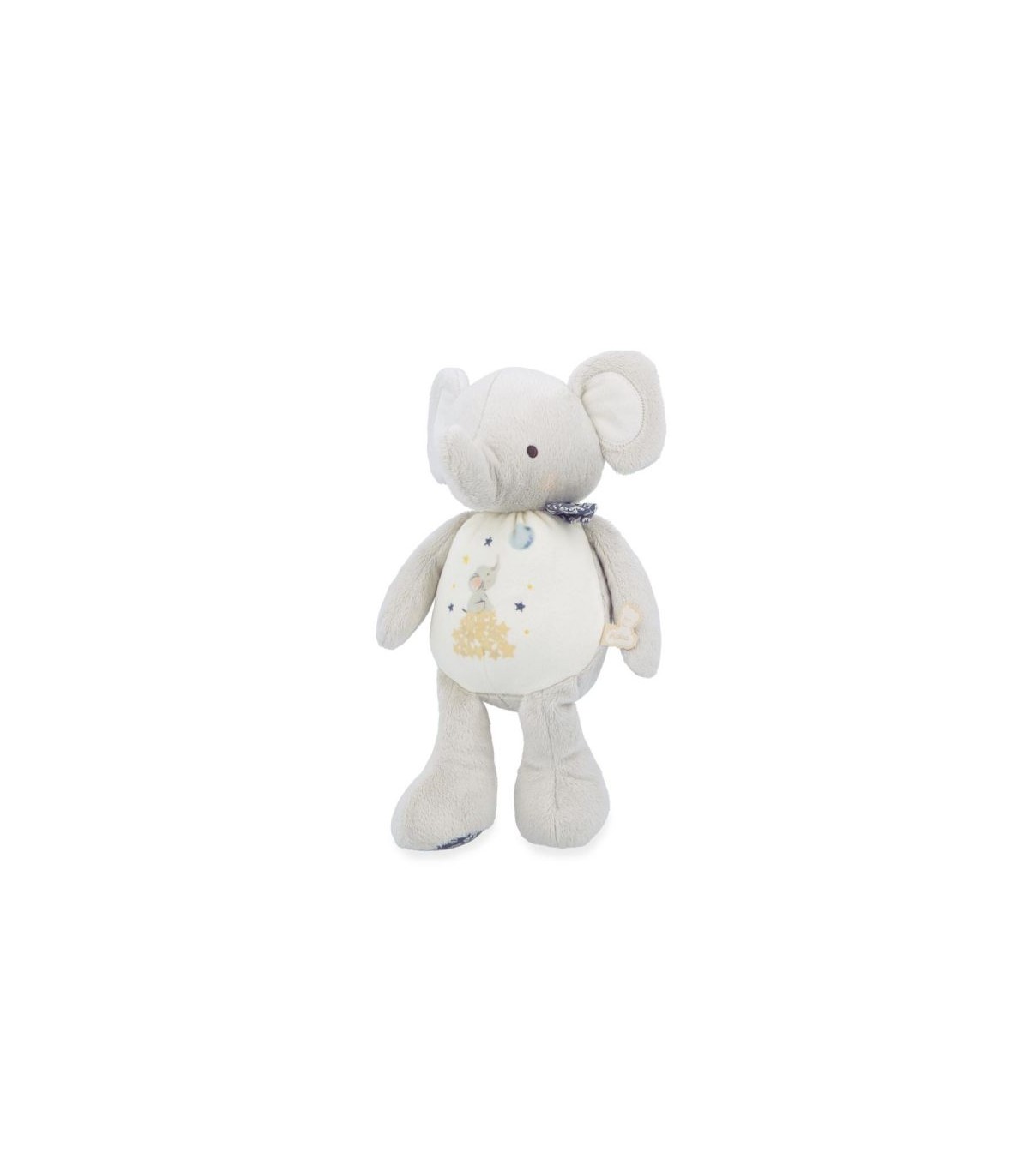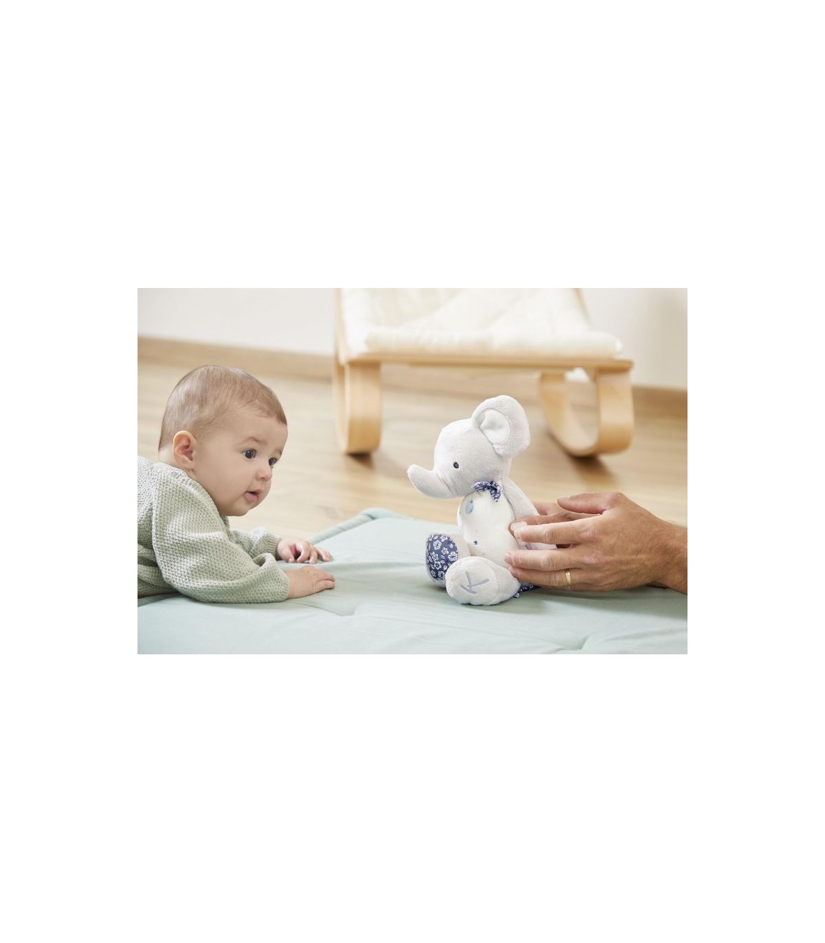 ¡Preséntale al bebé los sonidos con este elefante de peluche, diseñado en colaboración con una práctica de psicomotricidad! Fabricado con un 86% de materiales reciclados, este elefante de peluche contiene una campana que suena para despertar la curiosidad y estimular el oído del bebé. Durante los momentos de vigilia de tu pequeño, sacude la barriga del peluche para hacer sonar la campana y estimular sus sentidos. En su suave vientre encontrarás ilustraciones y bordados que describen la canción infantil “Brilla, brilla estrellita”. ¡Aprovecha esta oportunidad para recitar canciones infantiles con tu bebé! Te encantará la bonita cinta alrededor del cuello de este encantador elefante: invita al bebé a agarrar su peluche y explorar todo lo que tiene para ofrecer. Con sus grandes orejas, su suavidad y su función sonora, este elefante de peluche de 28 cm es fácil de agarrar y manipular para los más pequeños.