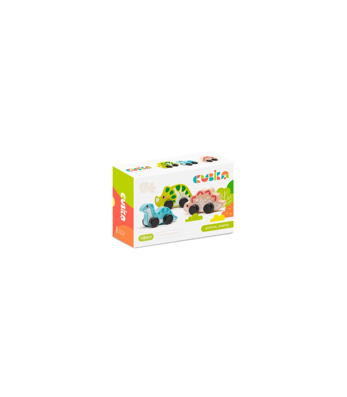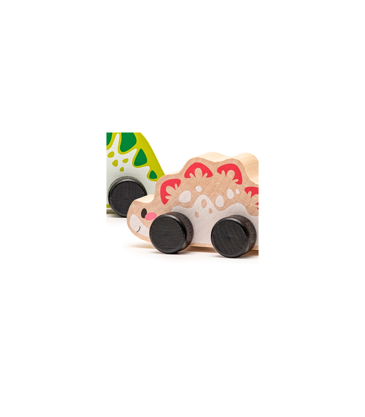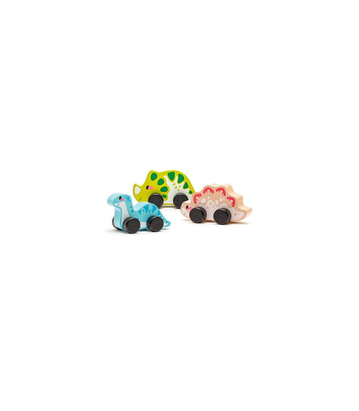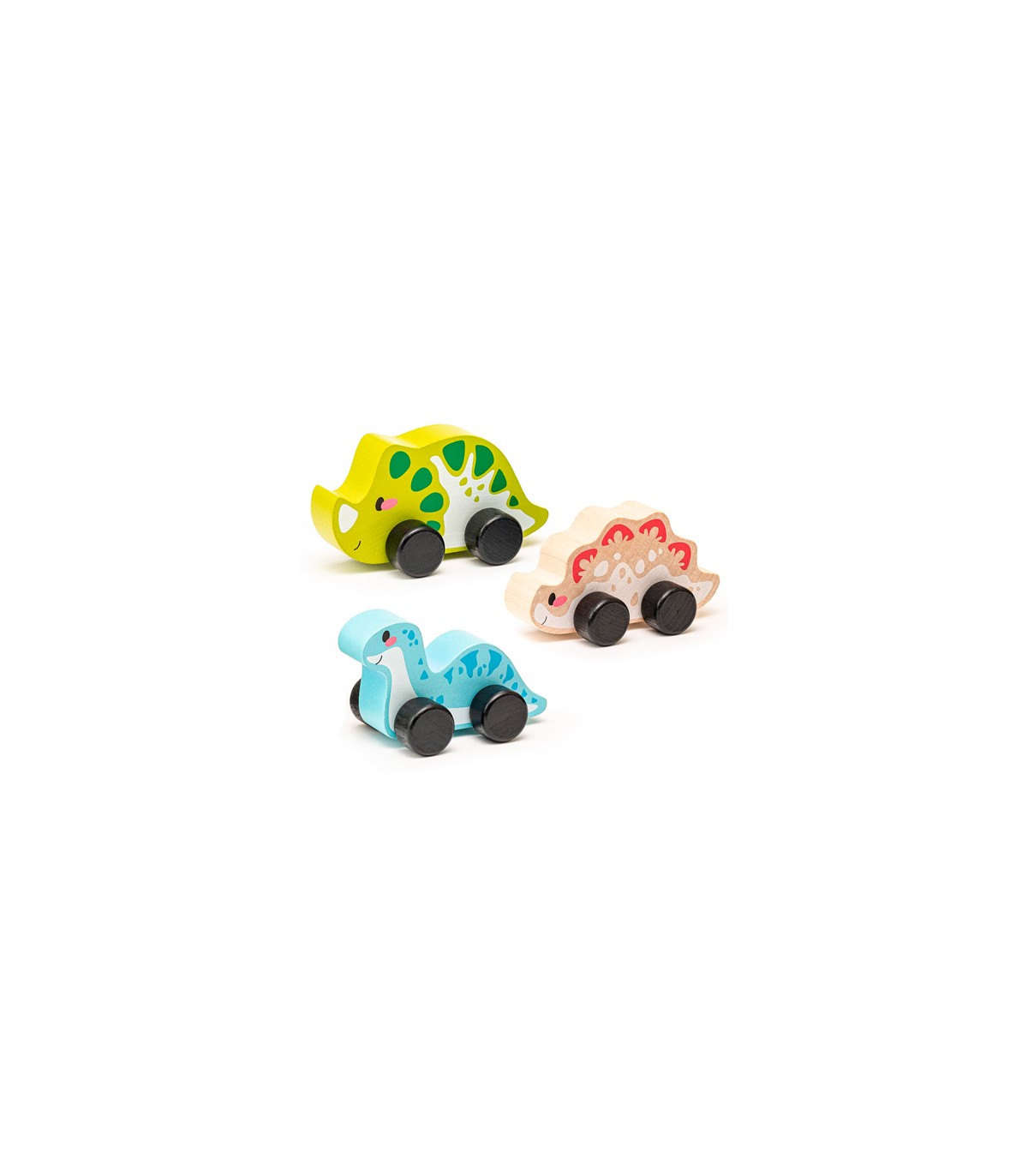 Set de 3 simpáticos dinosaurios de distintos colores con ruedas móviles. Las piezas representan a un tricerátops, un estegosaurio y un braquiosaurio con los que los niños y las niñas podrán imaginar aventuras y mundos lejanos al tiempo que desarrollan su motricidad fina.