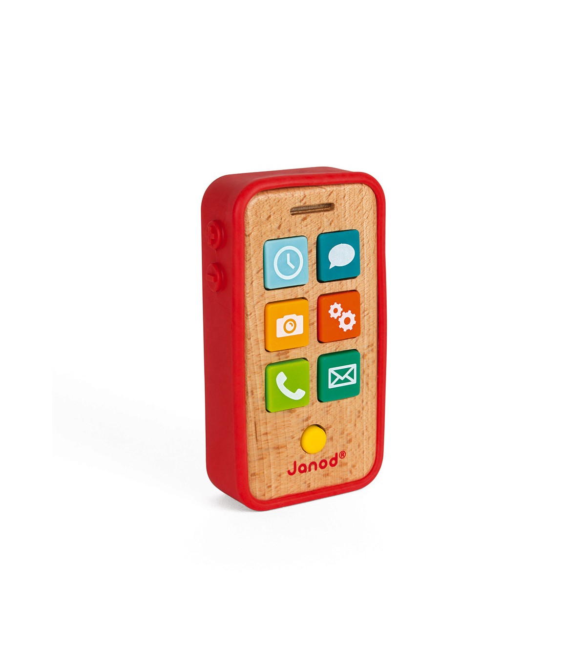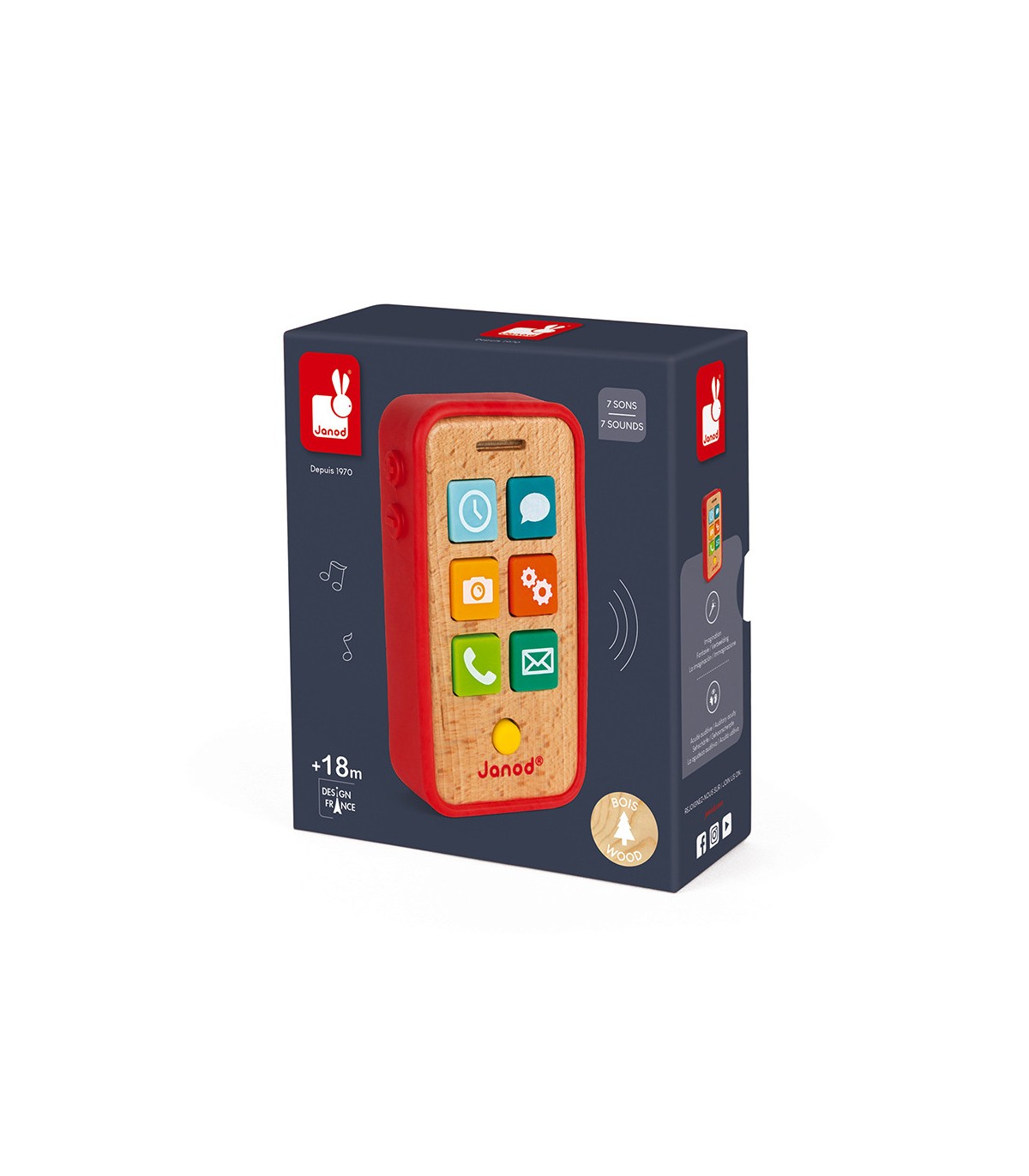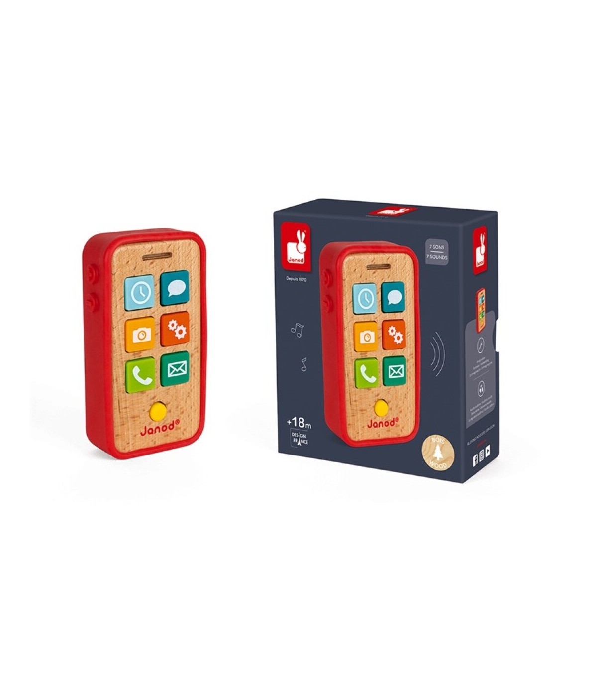 Juguete de madera. Para niños de 18 a 36 meses. ¡Un teléfono sonoro para llamar como los mayores! El juguete incluye 7 teclas sonoras de plástico flexible. Funciona con 3 pilas (LR44) suministradas.