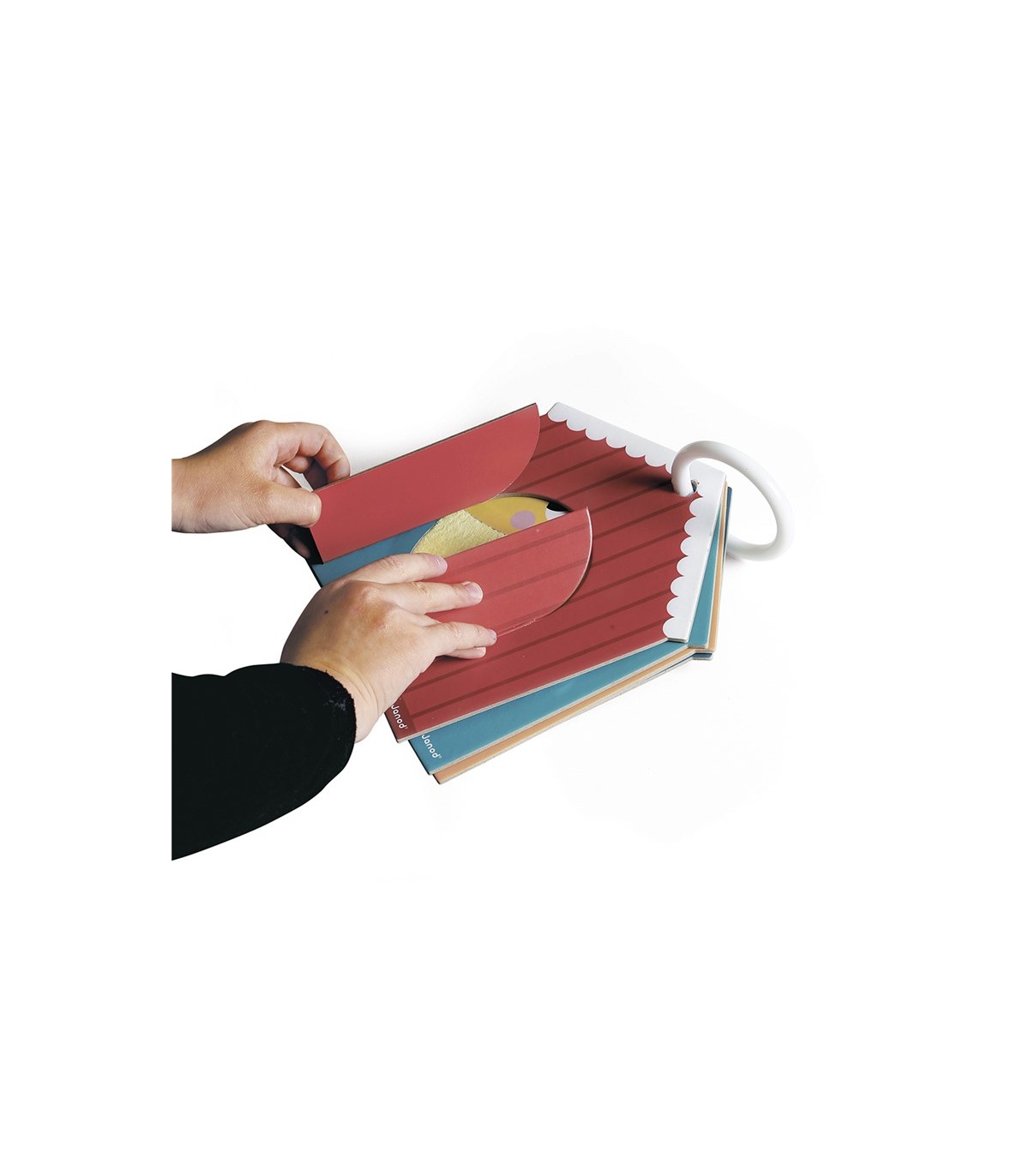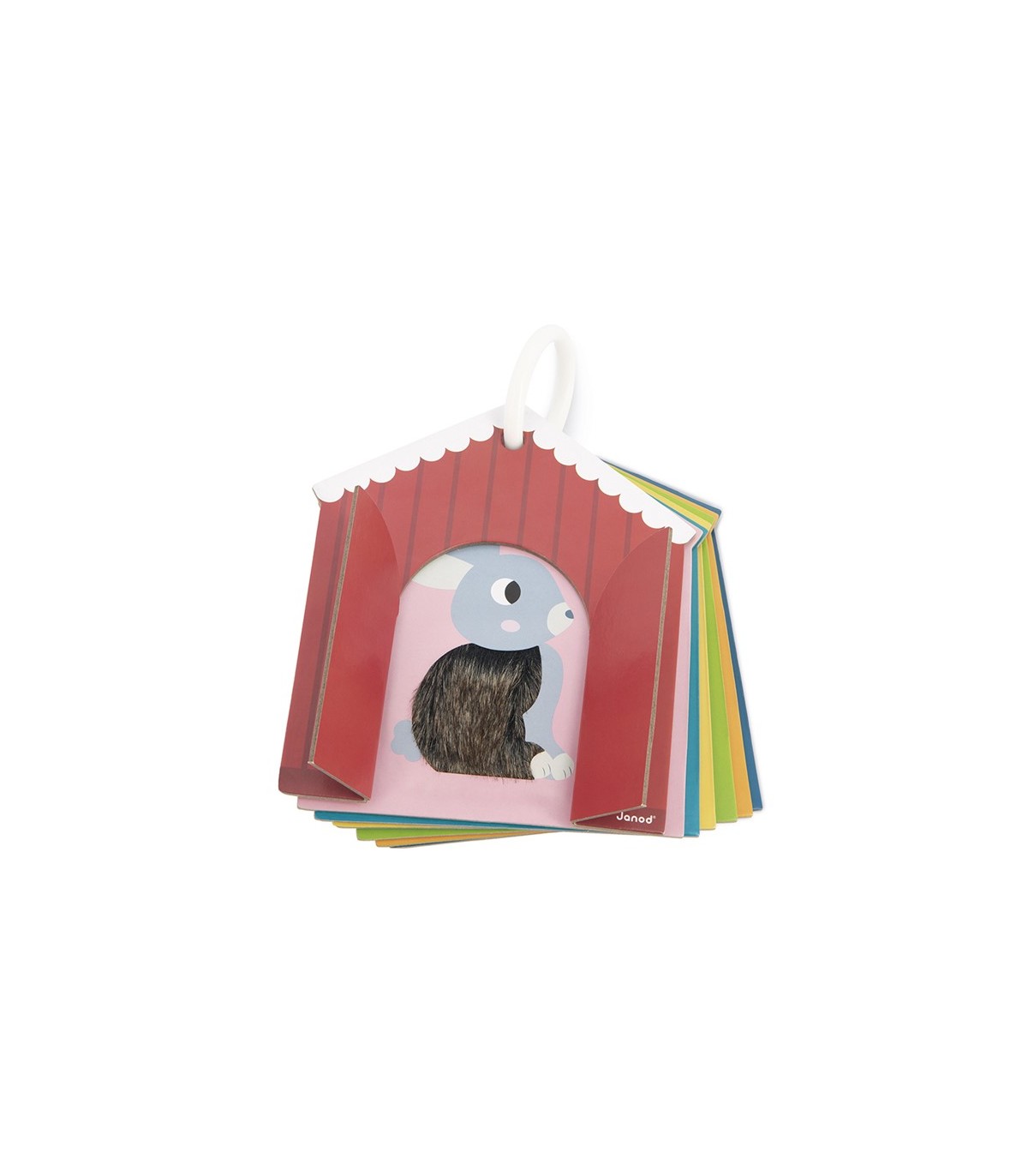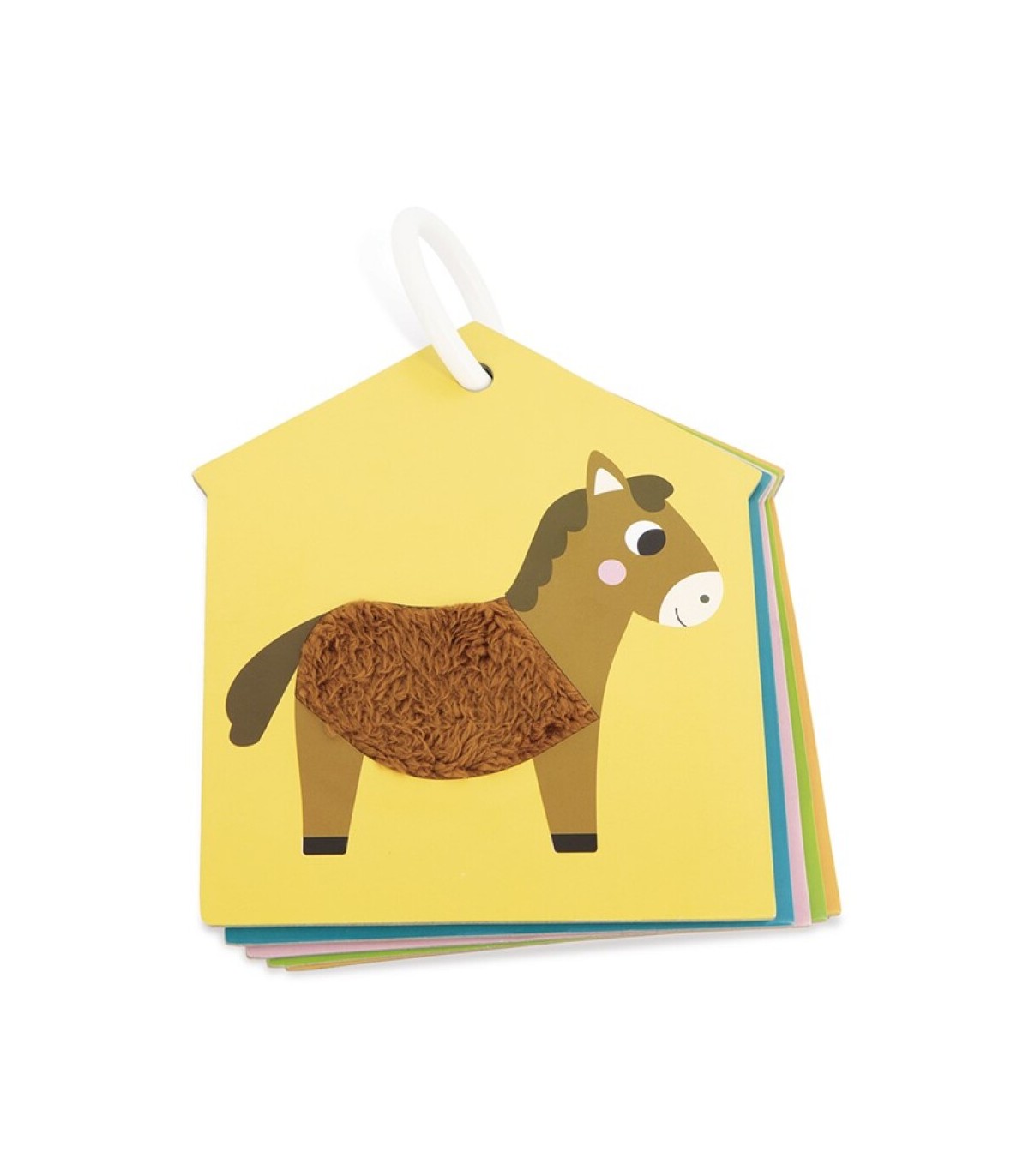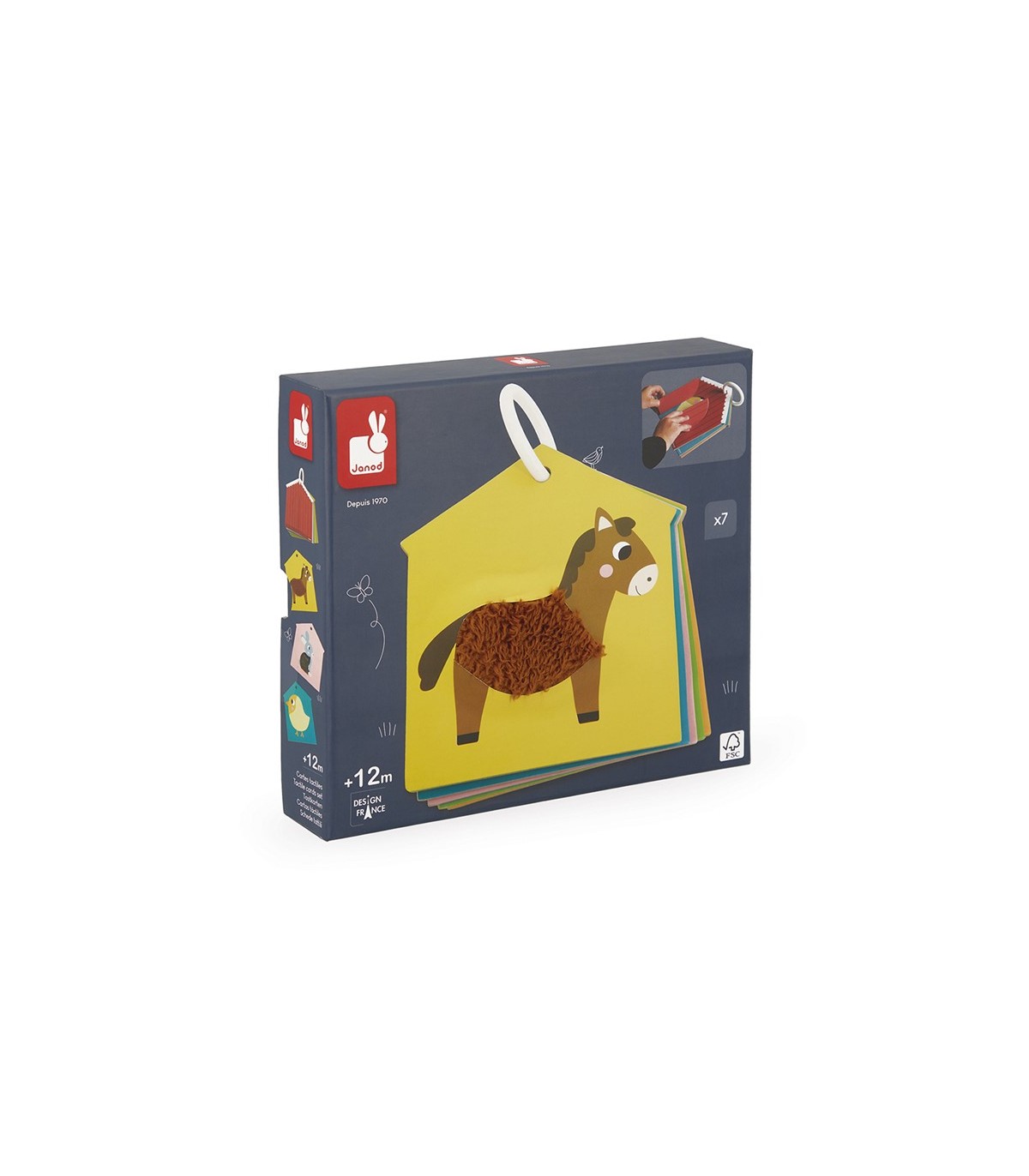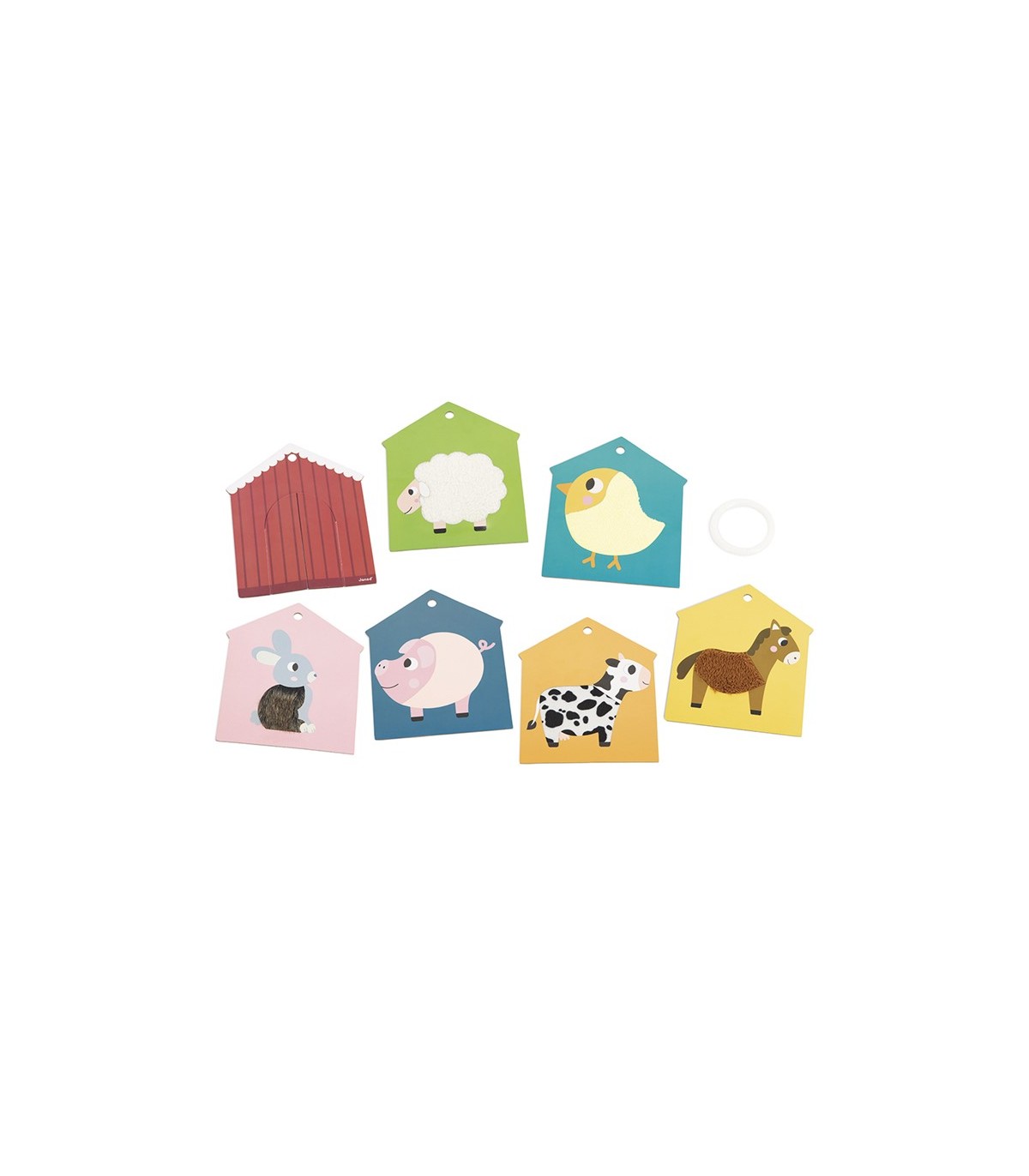 ¡A conocer a los animales de la granja! Al abrir las puertas de la granja, el niño descubrirá una de las 6 cartas texturizadas sobre los animales de la granja. ¿Cuál es el más suave? ¿La vaca o el conejo? Este juguete de estímulo es ideal para desarrollar el sentido del tacto. También es muy práctico para llevárselo a todas partes gracias a su anilla de plástico. Juguete de cartón FSCTM. Juguete de estímulo para niños a partir de 12 meses.