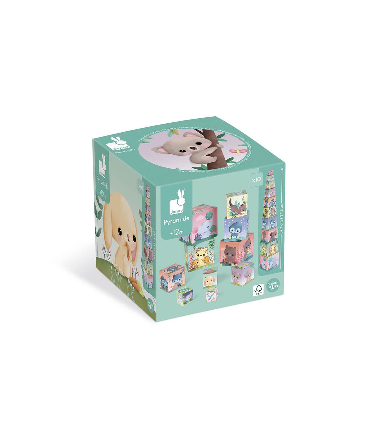 Pirámide de cartón para niños de 12 a 36 meses. 10 elementos para apilar para reconstruir una magnífica pirámide de colores pastel sobre la temática de los animales. En la parte superior de cada elemento se puede ver un número. Con esta pirámide, ¡su hijo aprenderá a contar hasta10 y desarrollará sus capacidades motrices y su imaginación divirtiéndose al mismo tiempo!