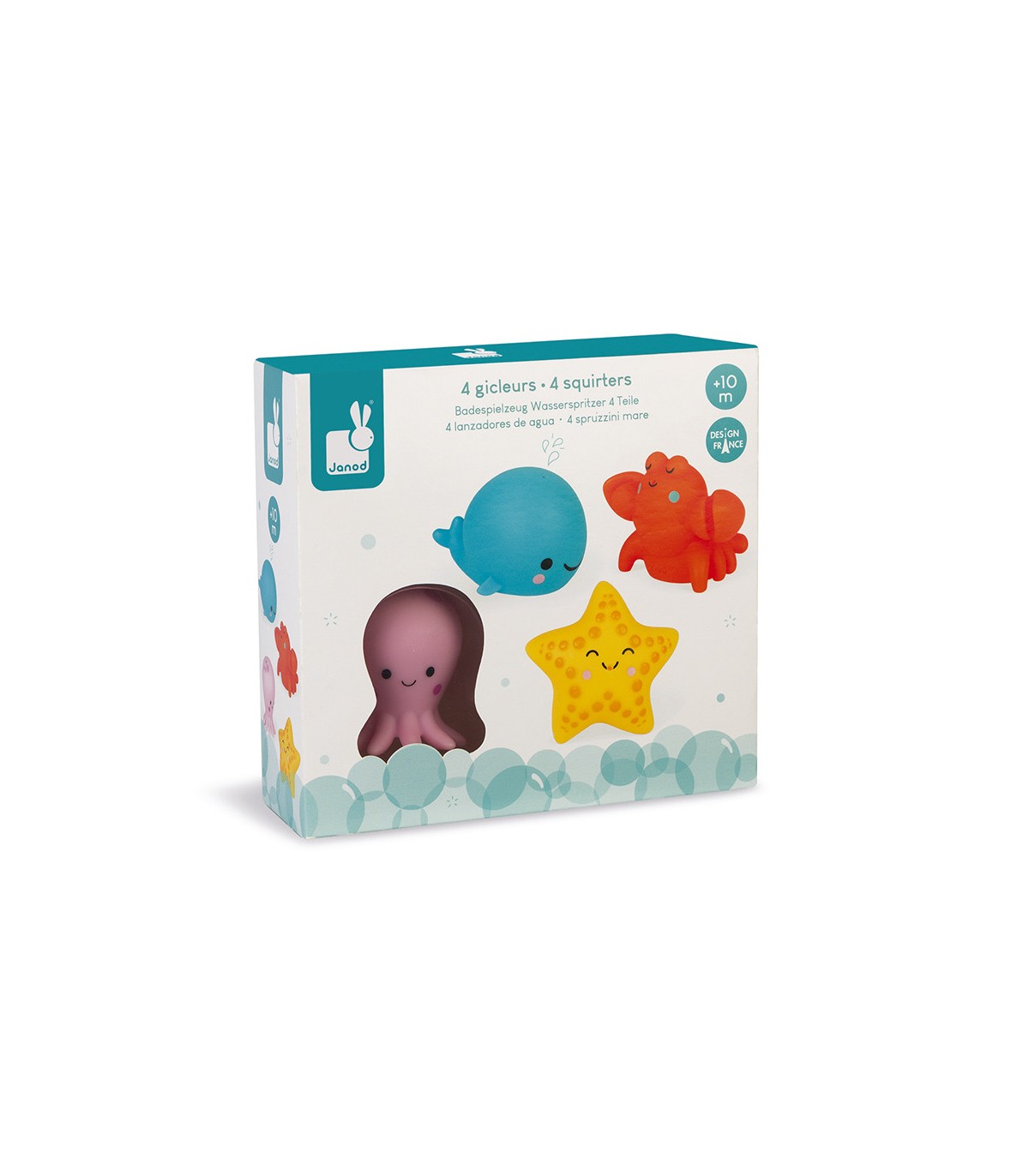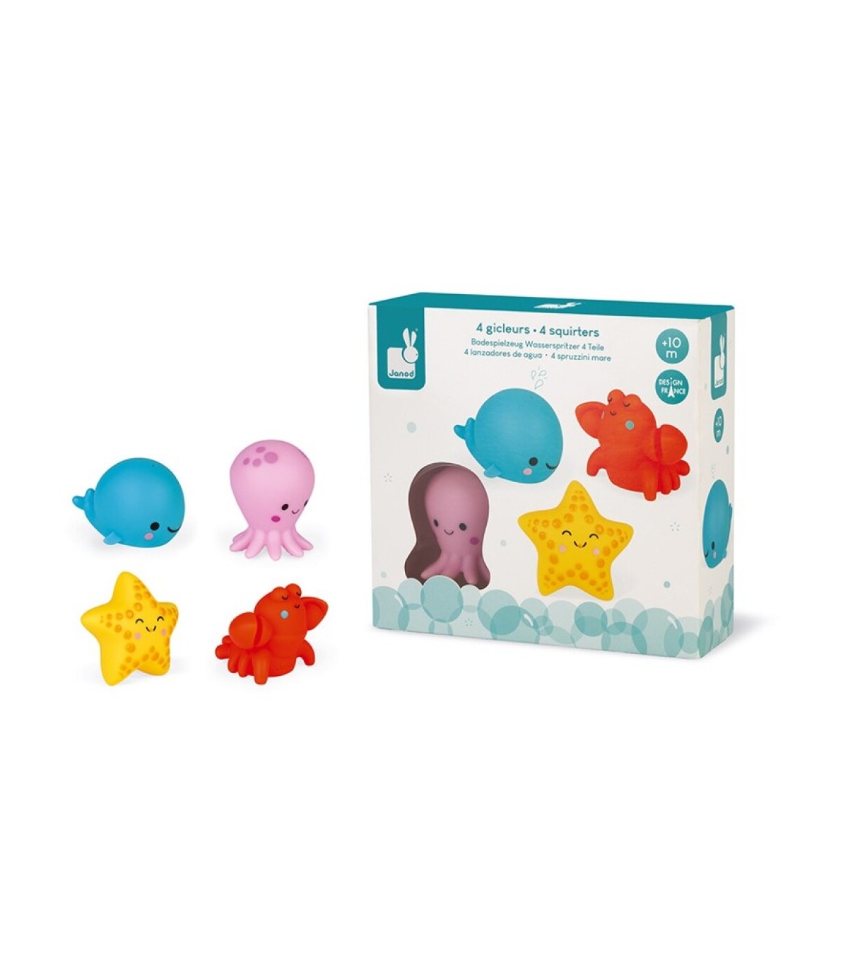Para niños mayores de 10 meses. 4 animales del mar: un pulpo, un bogavante, una estrella de mar y una ballena. Fáciles de agarrar con la mano, ¡para pasar horas jugando en el baño!