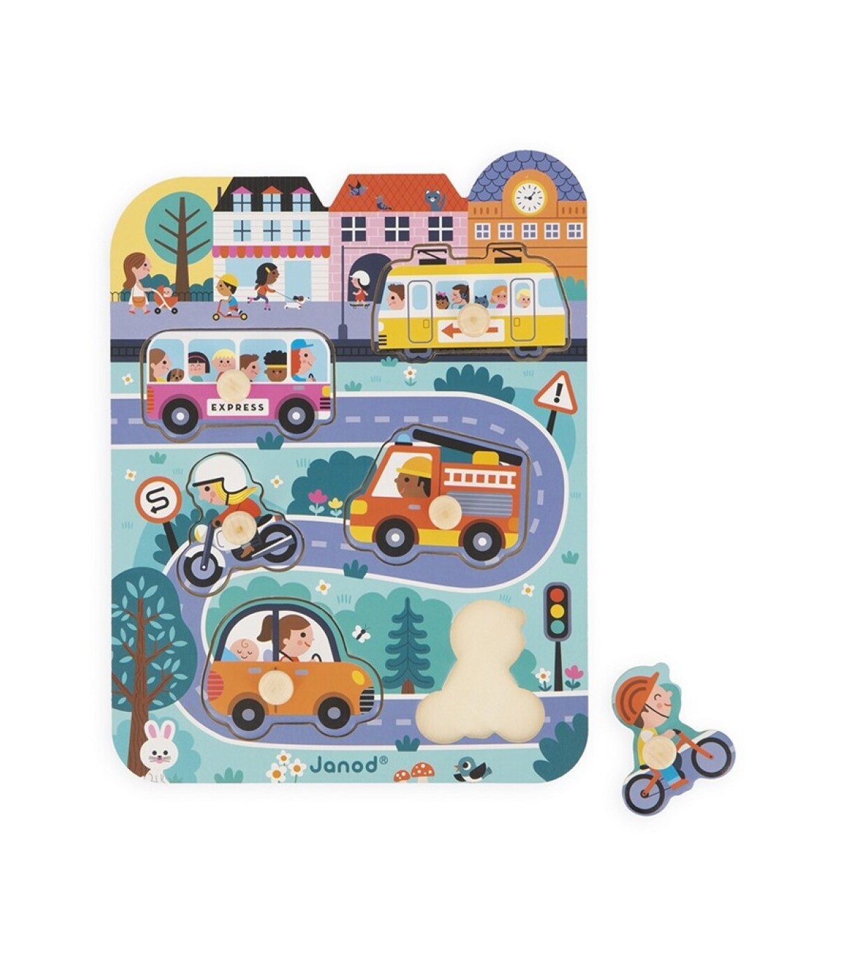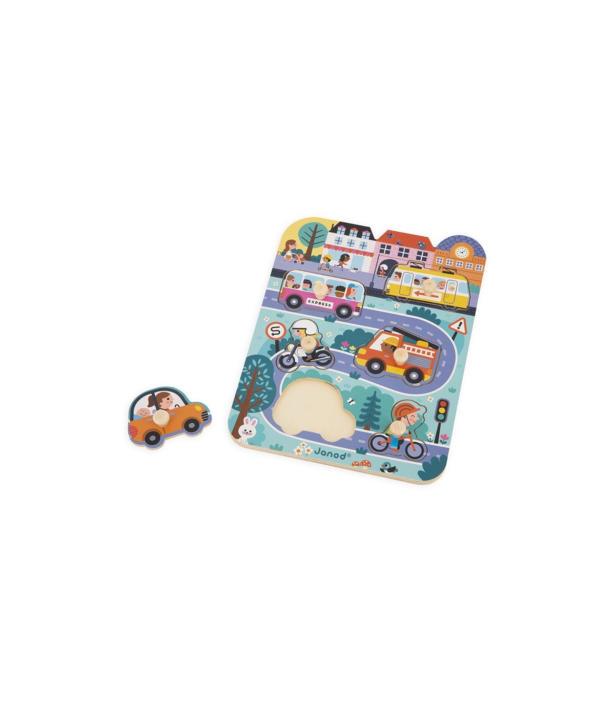 Puzle de 6 piezas con espigas de madera sobre el tema de los vehículos en la ciudad.
