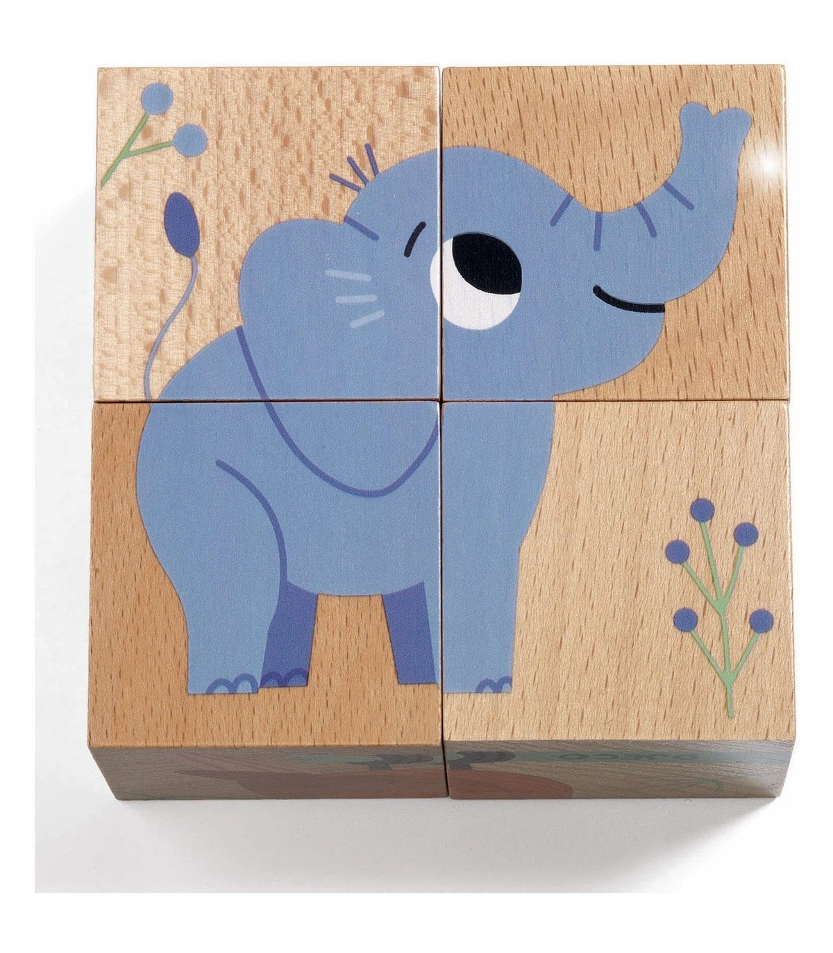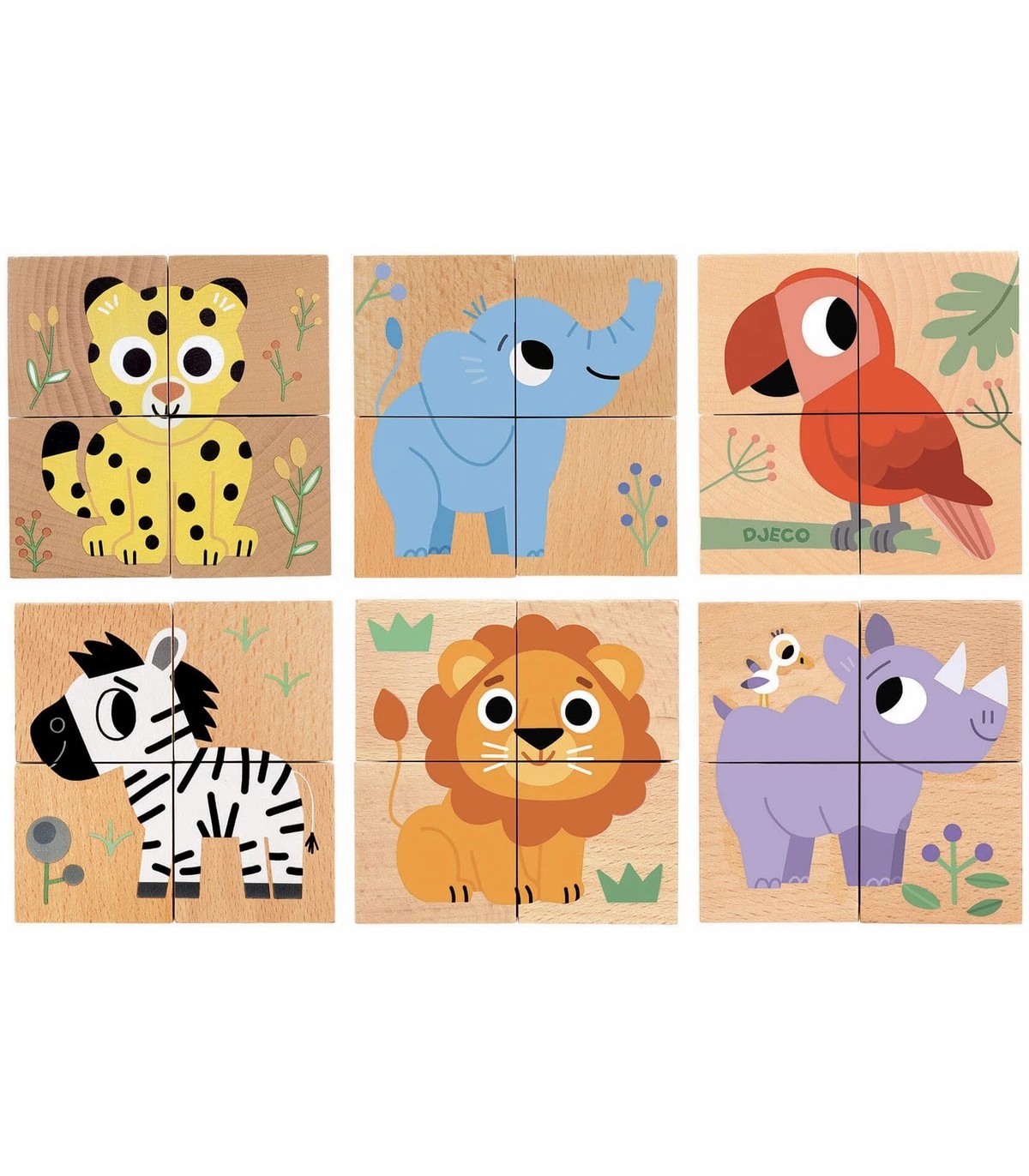 4 cubos de madera que permiten armar 6 puzles sobre el tema de los animales salvajes.