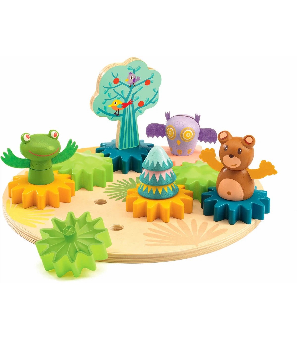 Un juego de engranajes sobre el tema del bosque. Sobre una plancha de madera ilustrada, el niño coloca engranajes en los agujeros para crear un hermoso mundo de bosque encantado. Para que los árboles y los animales del bosque cobren vida, hay que encontrar el circuito correcto. Los elementos se superponen para formar volúmenes.
