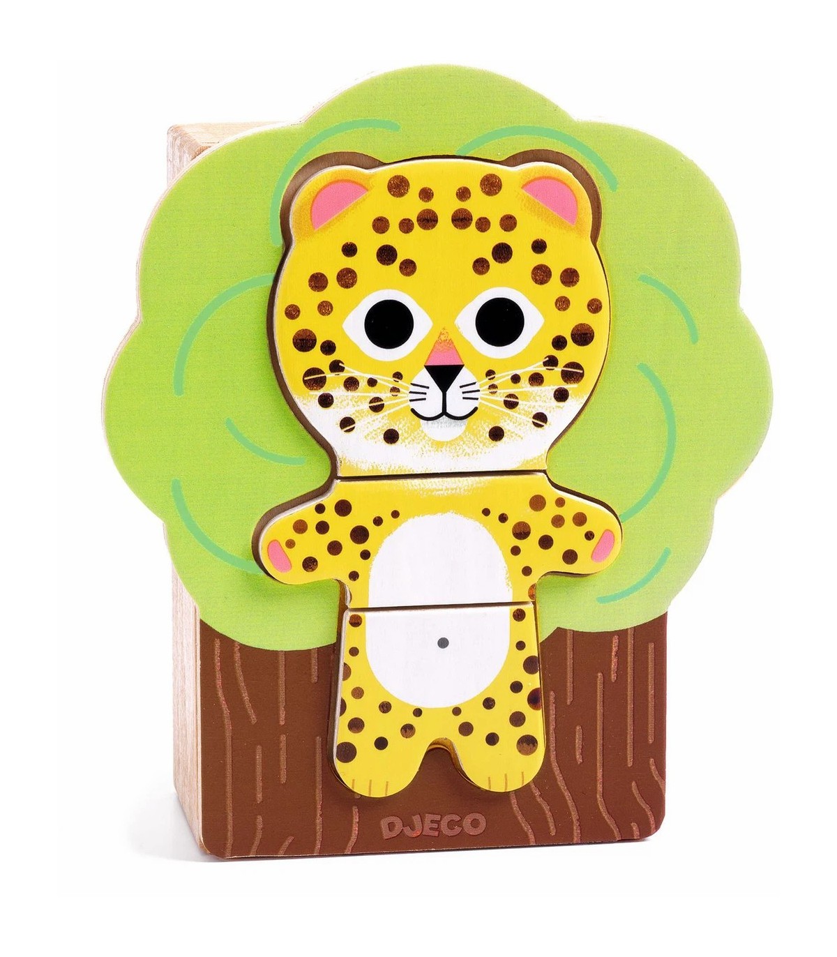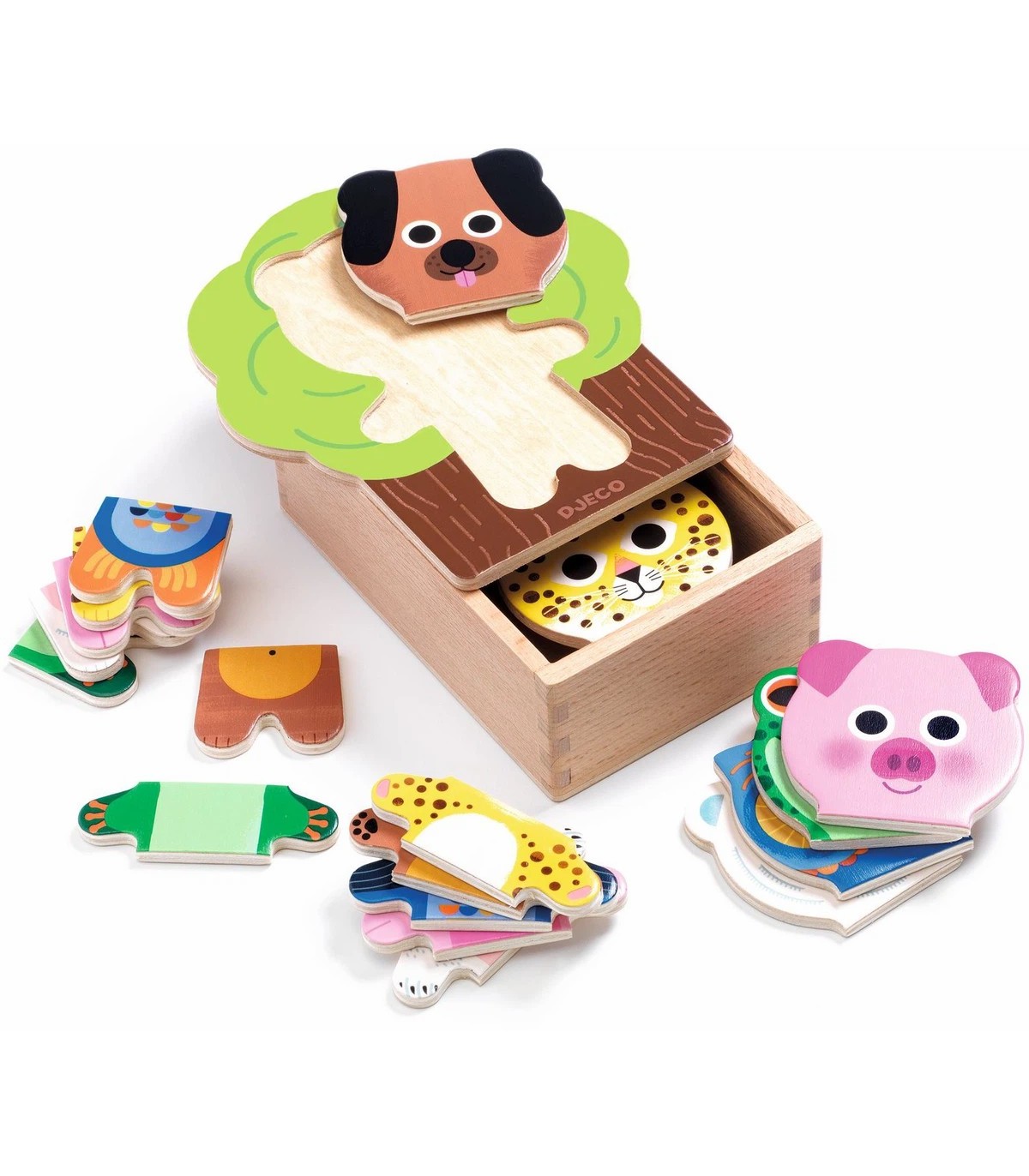 El puzle Arbramix contiene 6 coloridos animales, compuestos cada uno por 3 piezas de madera. En la tapa de la caja, el niño reconstruye el animal que prefiera: el leopardo o la rana. O se divierte combinando las piezas según su imaginación. La caja-estuche en forma de árbol es muy práctica para guardarlo todo dentro fácilmente. El perfil recortado en la tapa ayuda a colocar bien las piezas. Los personajes tienen la misma forma para que se puedan mezclar entre sí. El soporte de juego también es la caja en la que se guarda. 1 color por animal. Producto de madera certificada FSC®.