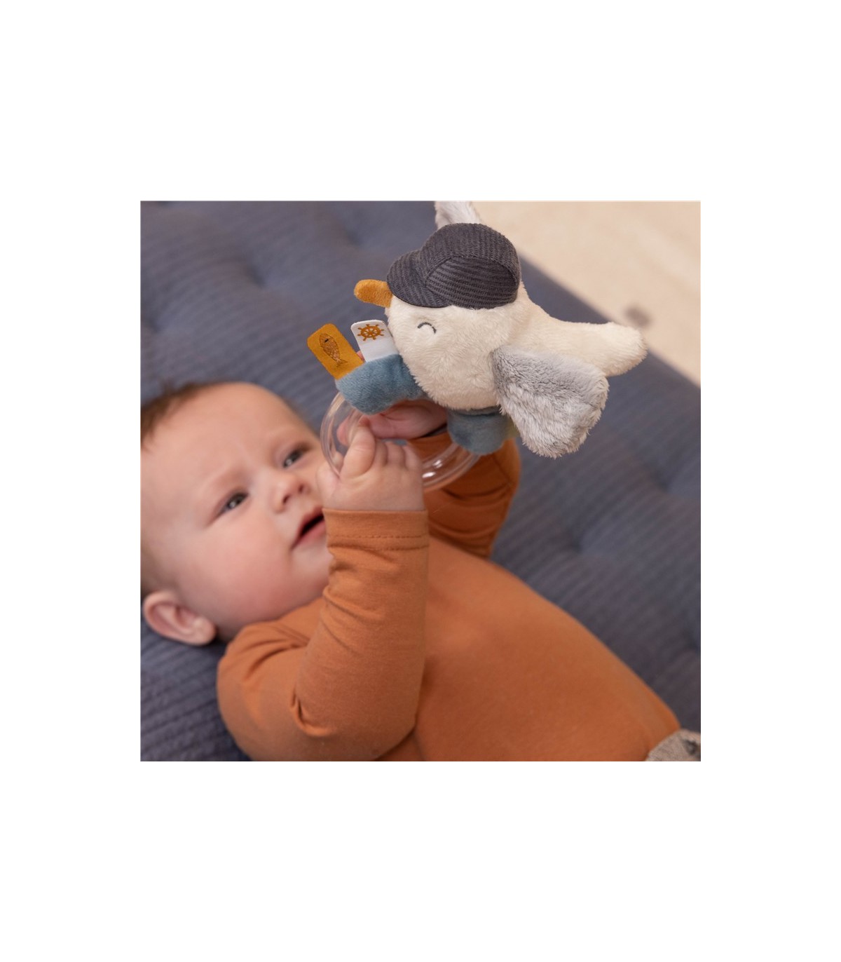 De la costa a la cama. Este sonajero fácil de agarrar con forma de una gaviota lo convierte en un atractivo primer juguete. Diseñado para mantener ocupado a su bebé, ofrece varios detalles de entretenimiento, que van desde etiquetas ilustradas hasta coloridos pequeños nudos. Las alas de la gaviota hacen un crujido.
