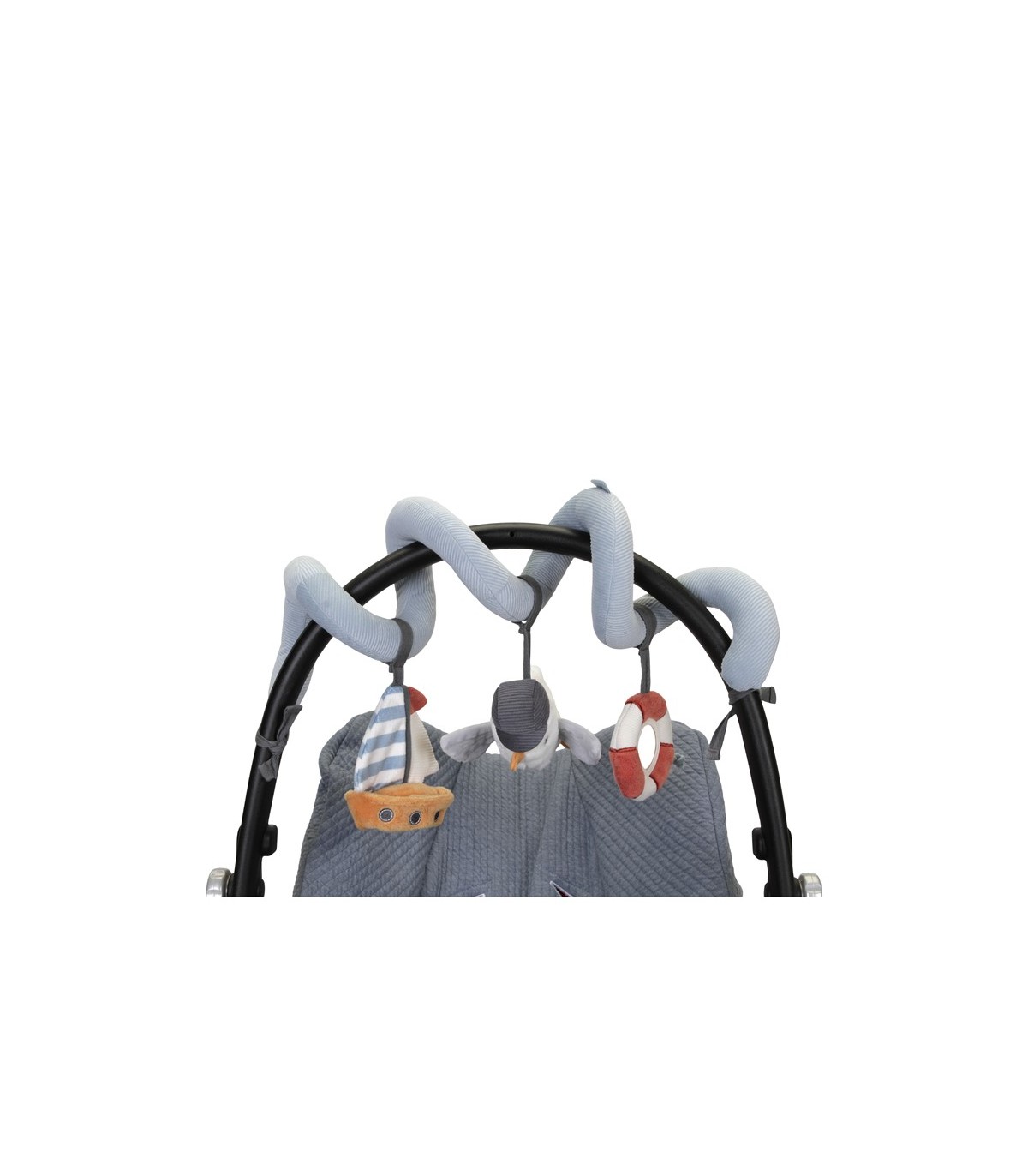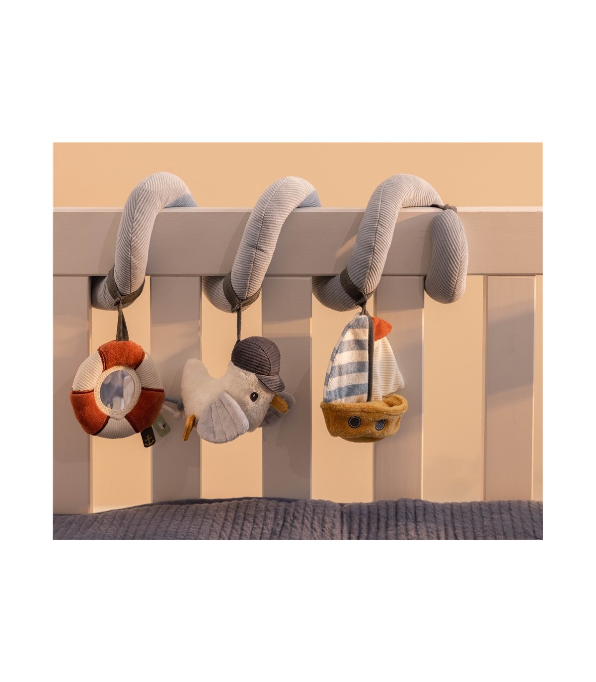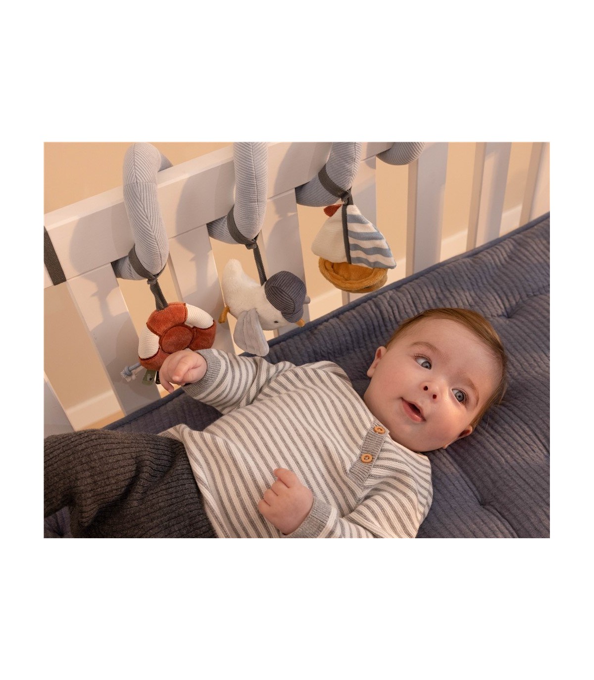 Haz de cada día una aventura en la bahía para los más pequeños con esta tentadora espiral de actividades. Estimula la coordinación mano-ojo del bebé y lo convierte en horas de entretenimiento. Confeccionado en algodón y pana, este juguete sensorial y táctil incluye una gaviota colgando, un velero y un salvavidas con varias etiquetas divertidas y un espejo para el autodescubrimiento. Es fácil de enganchar a todo, desde un parque infantil hasta una silla de coche o carrito.