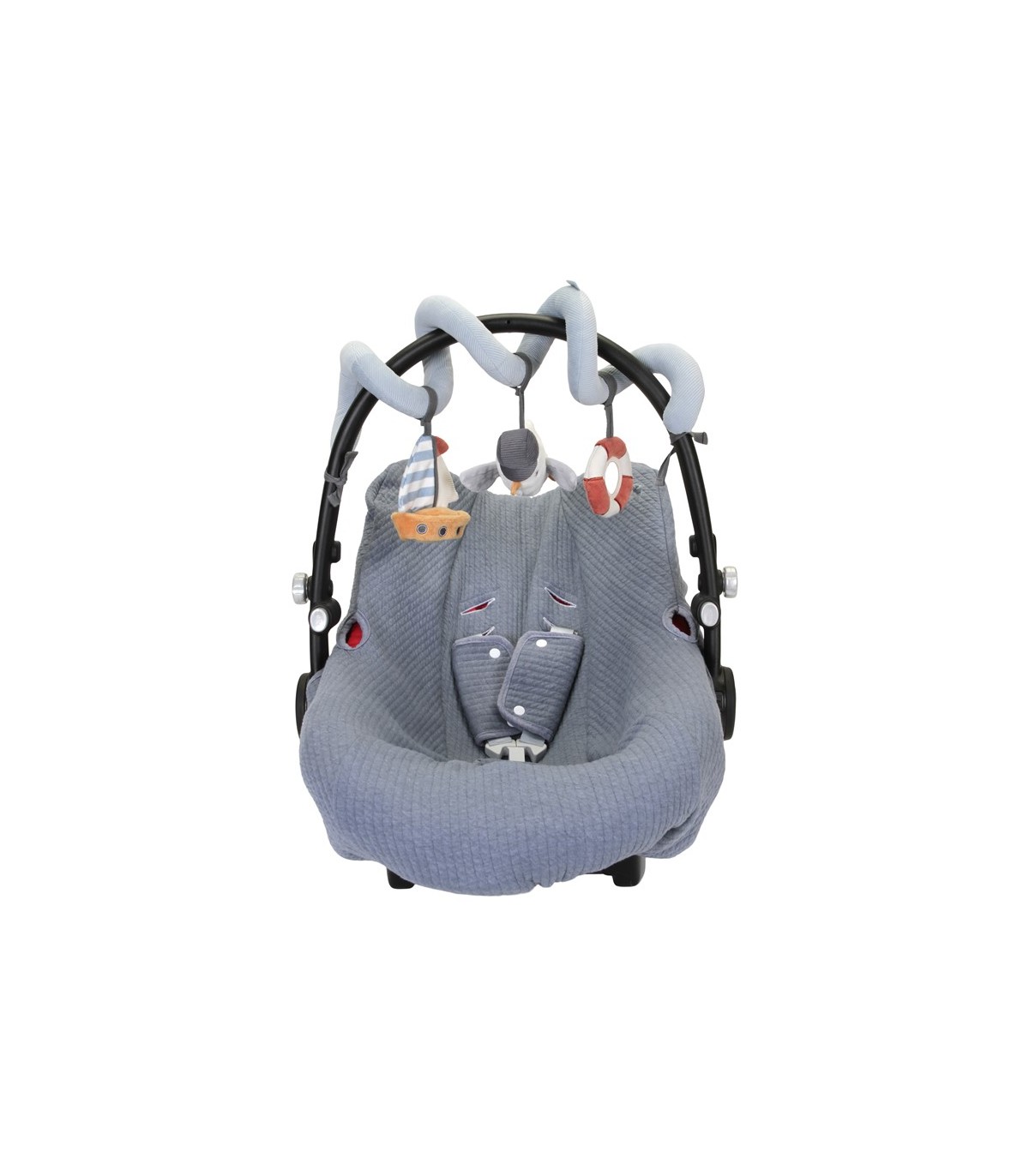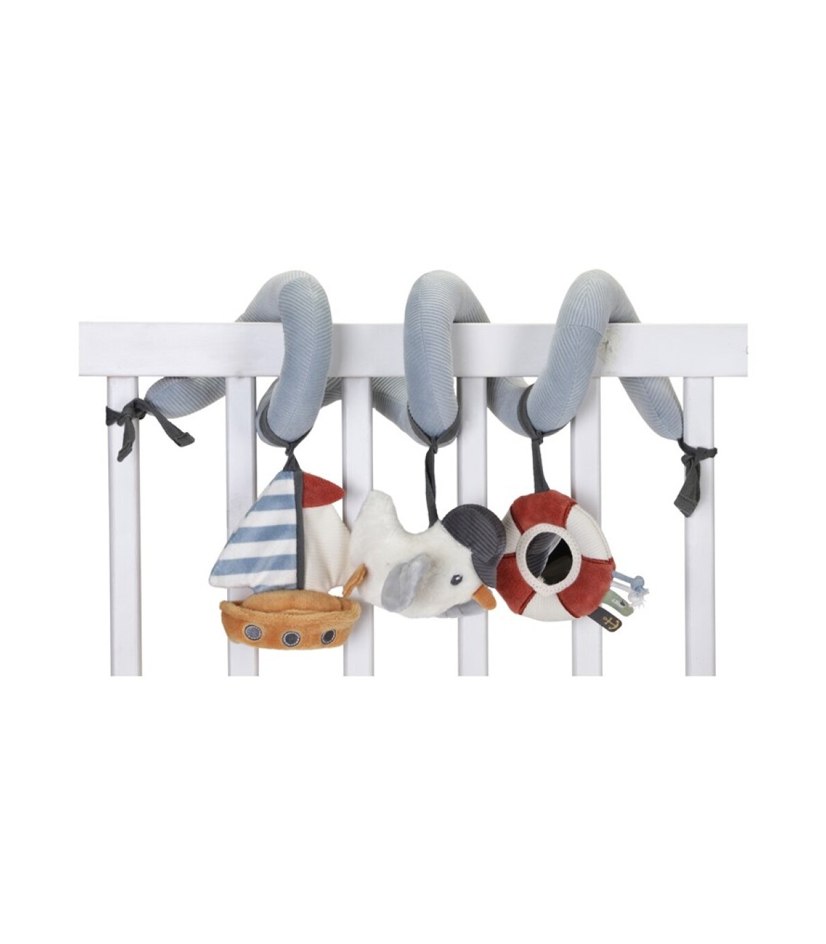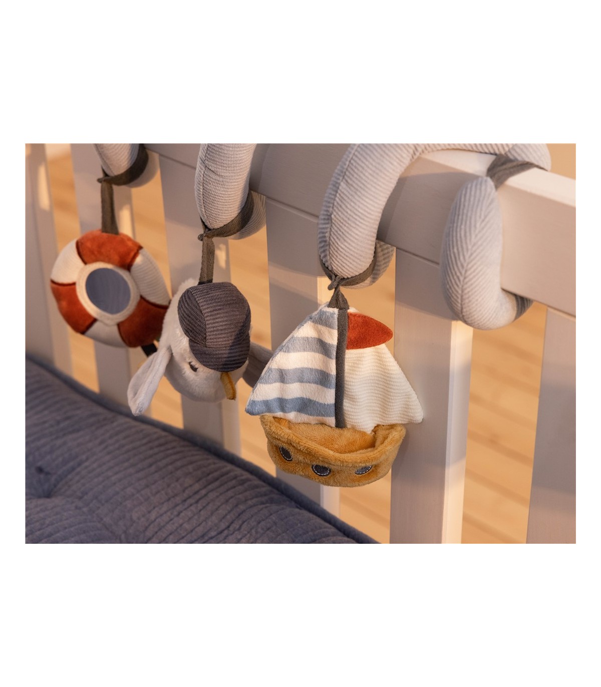 Haz de cada día una aventura en la bahía para los más pequeños con esta tentadora espiral de actividades. Estimula la coordinación mano-ojo del bebé y lo convierte en horas de entretenimiento. Confeccionado en algodón y pana, este juguete sensorial y táctil incluye una gaviota colgando, un velero y un salvavidas con varias etiquetas divertidas y un espejo para el autodescubrimiento. Es fácil de enganchar a todo, desde un parque infantil hasta una silla de coche o carrito.