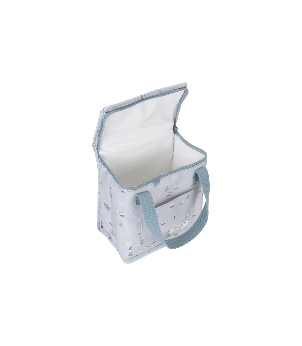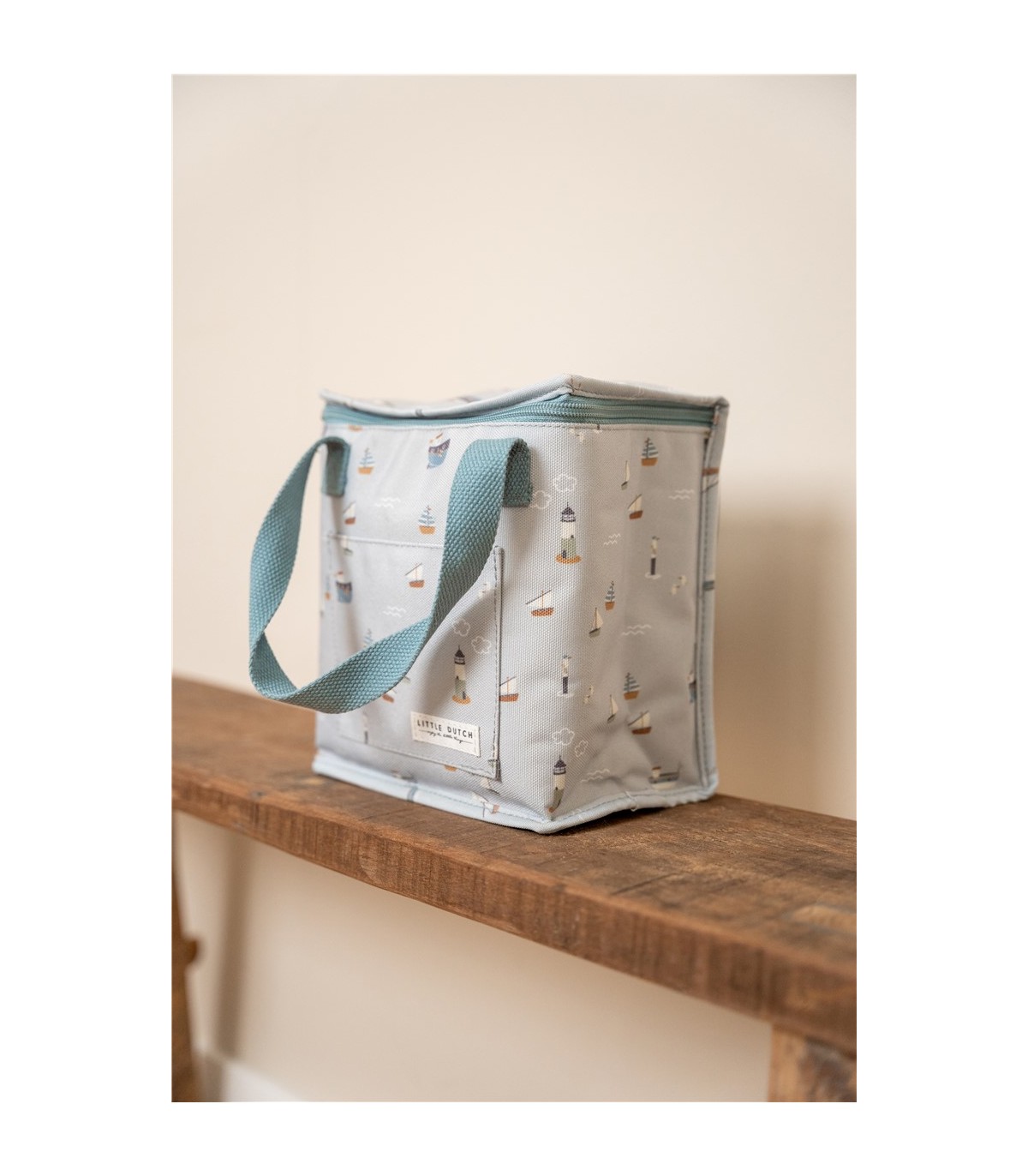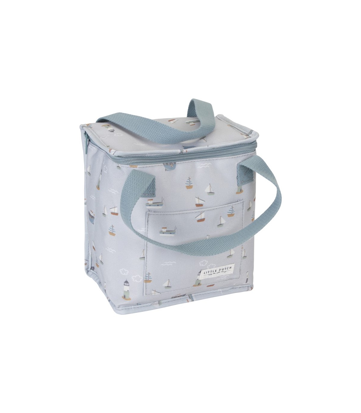 Esta linda bolsa térmica con estampado Sailors Bay Blue está hecha de lona resistente. El interior de la bolsa es aislante, lo que permite que los bocadillos y las bebidas se mantengan agradables y frescos. ¡Perfecto para el almuerzo en la escuela y sobre la marcha! La nevera portátil mide 21,5 x 20 x 12 cm. Hay mucho espacio para una fiambrera, una pieza de fruta y una botella o cartón de bebidas. El compartimento en la parte delantera puede contener una galleta y las asas facilitan que su hijo lleve la bolsa.
