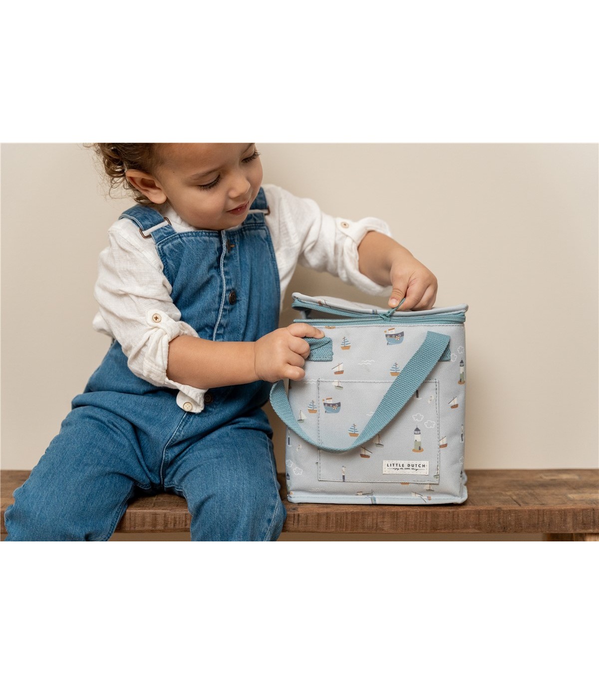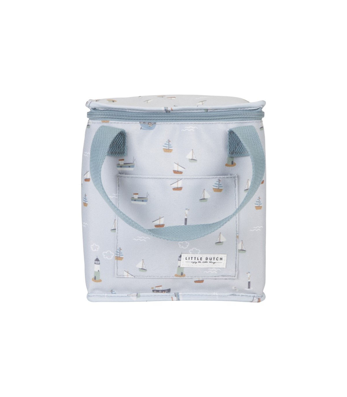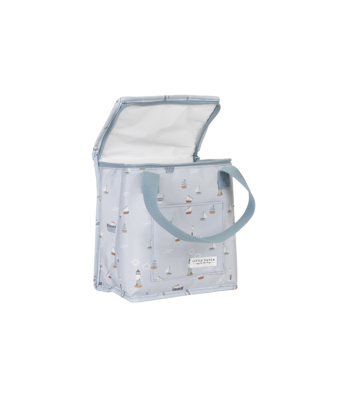 Esta linda bolsa térmica con estampado Sailors Bay Blue está hecha de lona resistente. El interior de la bolsa es aislante, lo que permite que los bocadillos y las bebidas se mantengan agradables y frescos. ¡Perfecto para el almuerzo en la escuela y sobre la marcha! La nevera portátil mide 21,5 x 20 x 12 cm. Hay mucho espacio para una fiambrera, una pieza de fruta y una botella o cartón de bebidas. El compartimento en la parte delantera puede contener una galleta y las asas facilitan que su hijo lleve la bolsa.