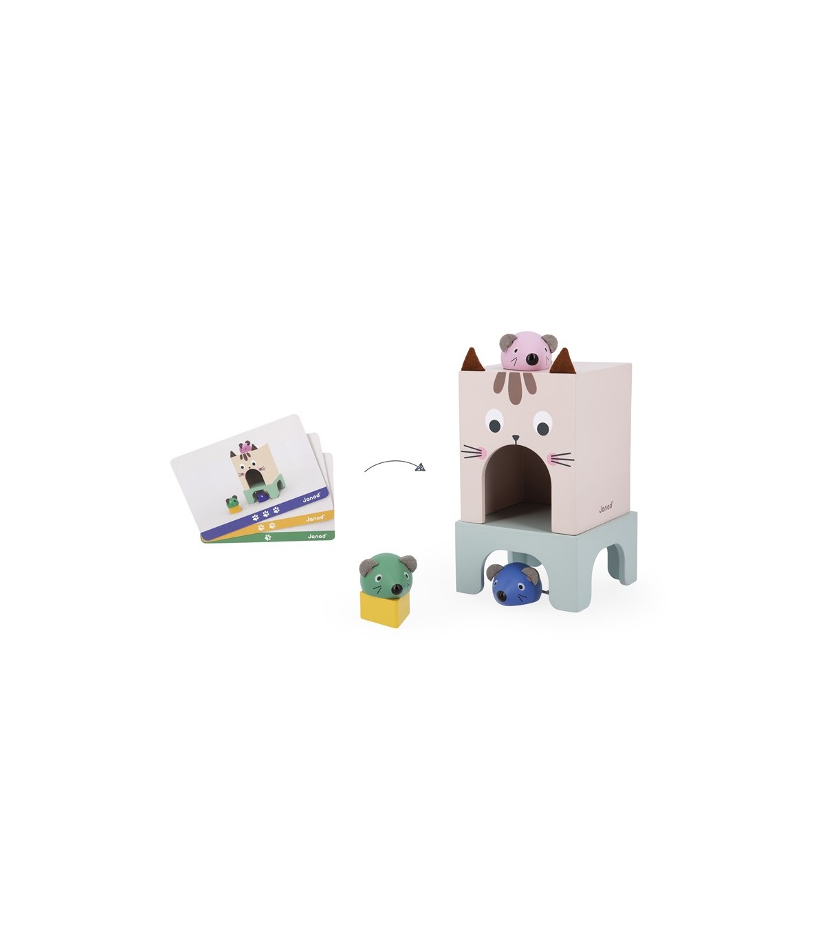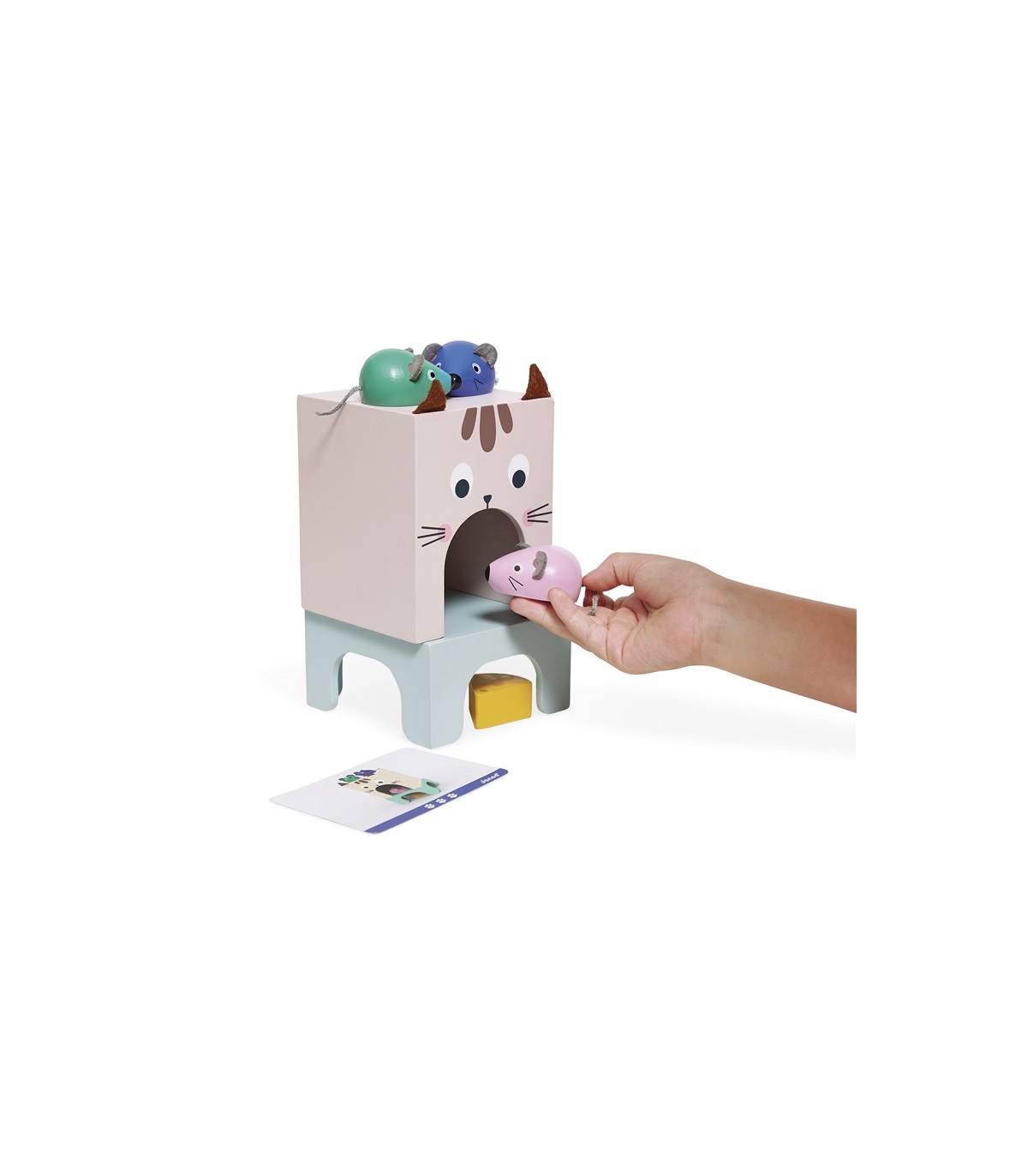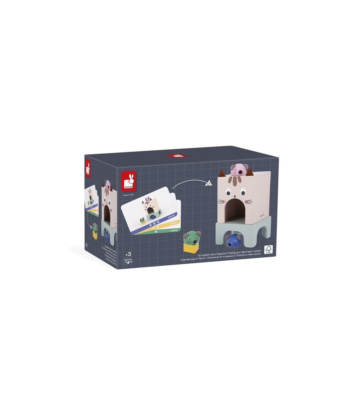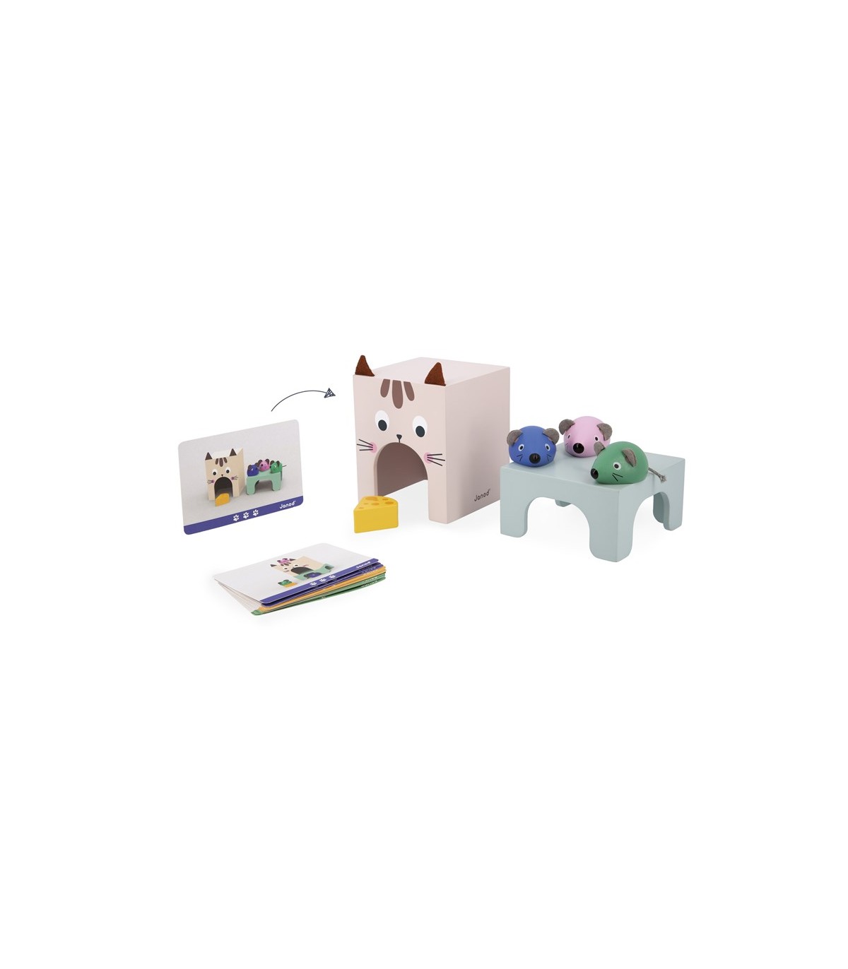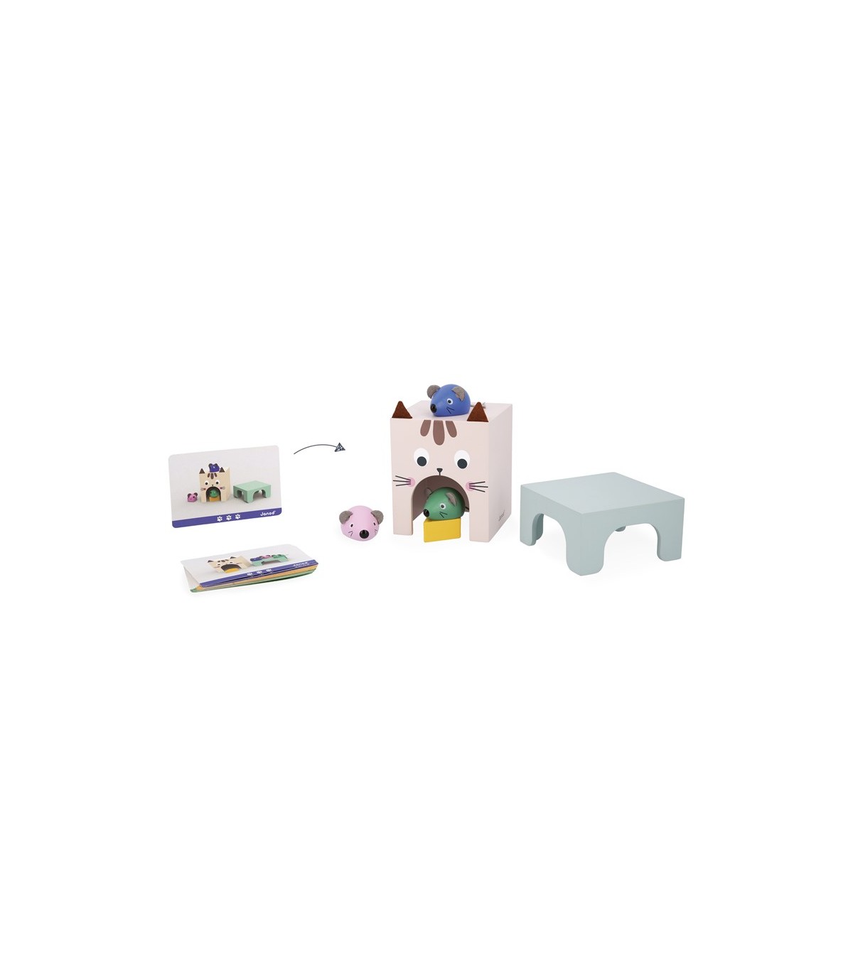 ¡Asimilar lo que aprende en el cole de forma divertida es lo que promete este bonito juguete educativo de madera! ¡Ayudará a los más pequeños a entender el concepto de orientarse en el espacio y a ampliar su vocabulario! ¡Que empiece la desenfrenada carrera entre el gato y los ratones! Los niños a partir de 3 años se divertirán jugando con los 3 ratones de madera de distintos colores, el trozo de queso y el gato (que es la propia caja). Utilizando las 12 tarjetas de ejemplo de dos caras, los peques tendrán que reproducir la escena y, al mismo tiempo, adquirirán el vocabulario en cuestión: delante o detrás, encima o debajo, en o dentro, en el interior de, al lado de, entre… Además ejercitarán su capacidad de observación.