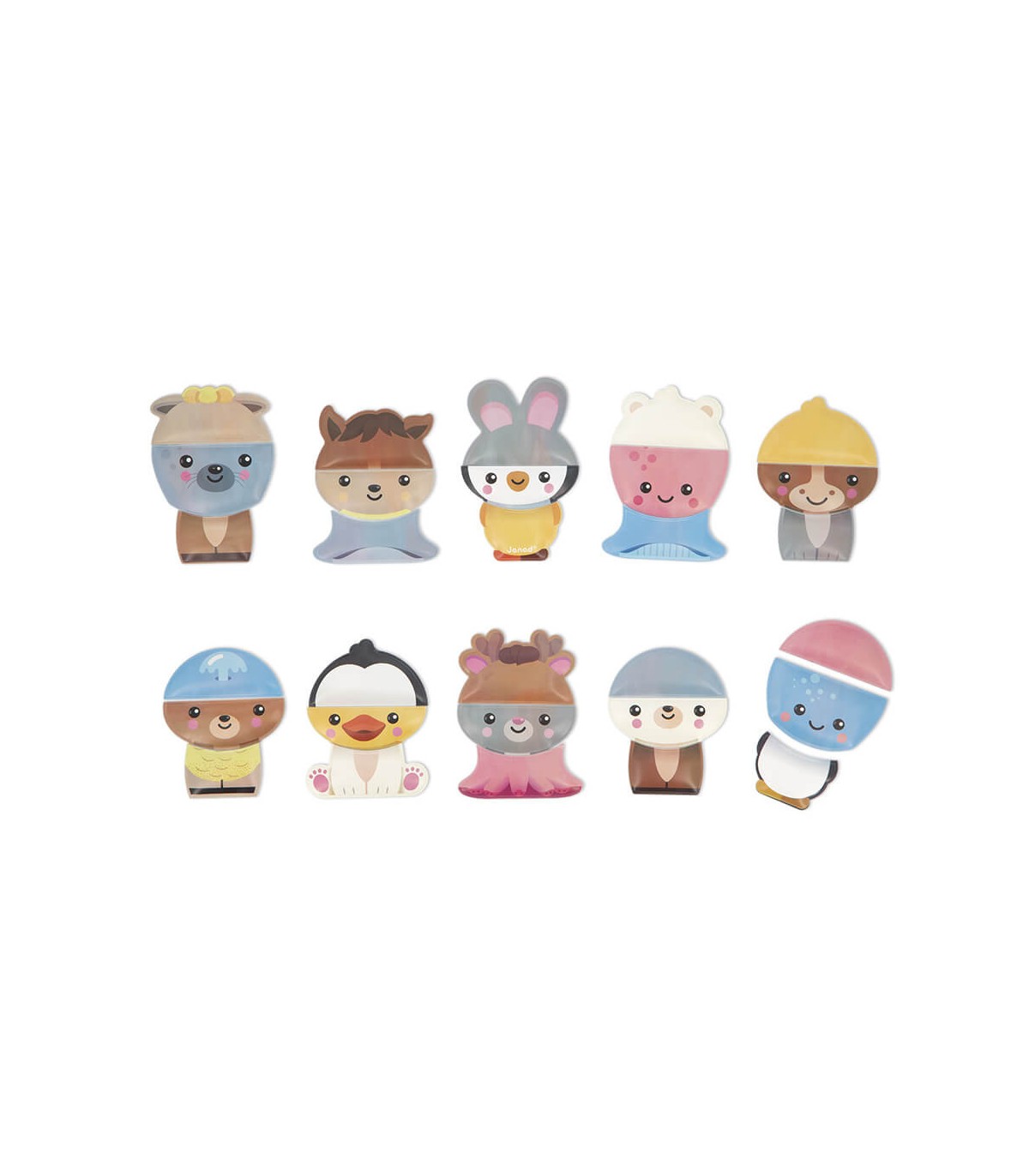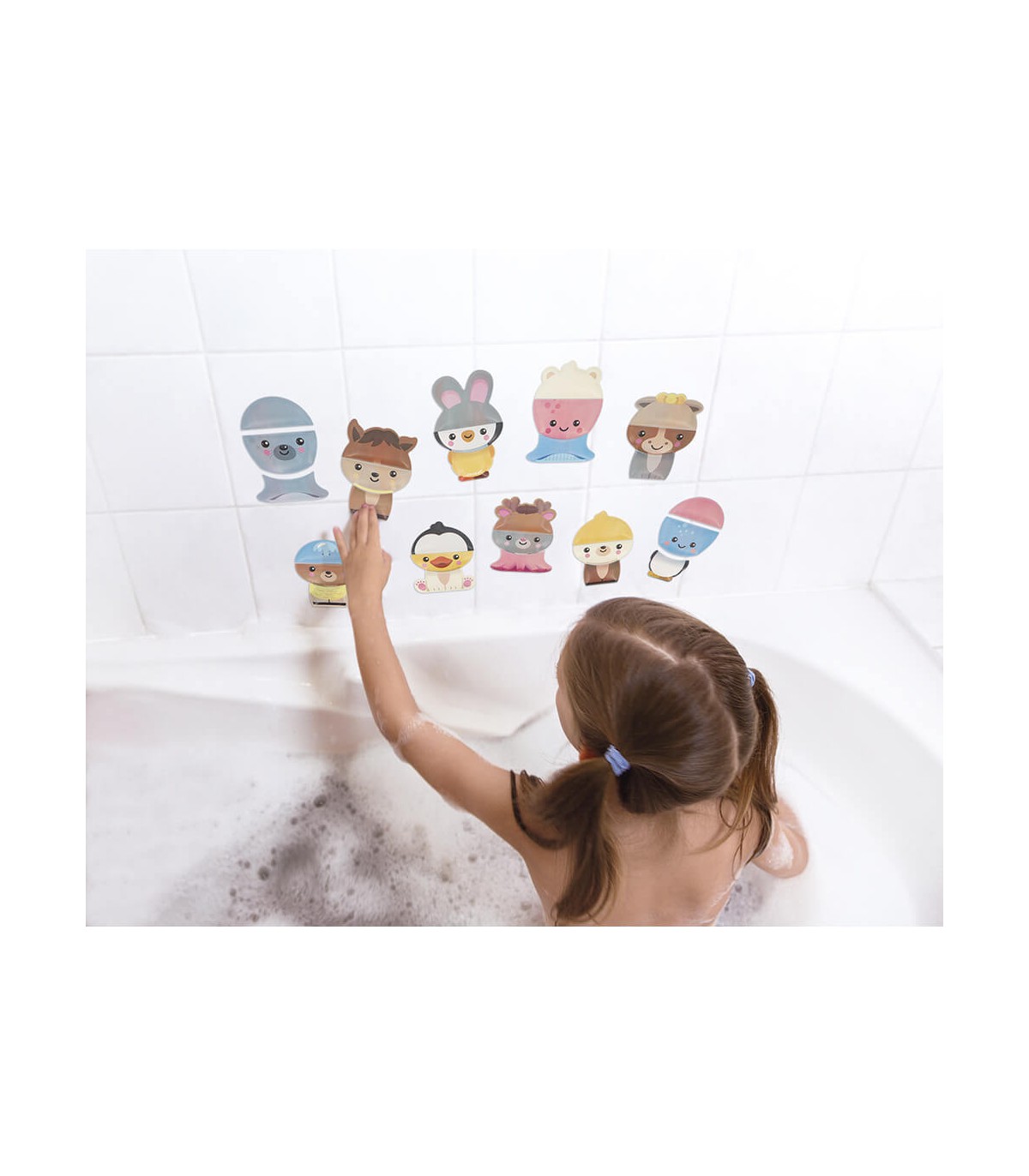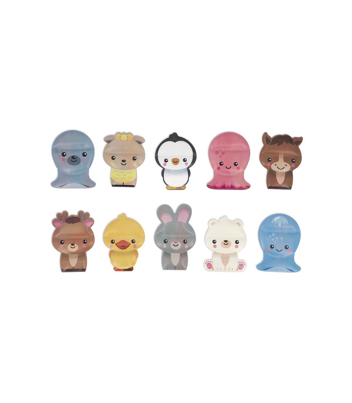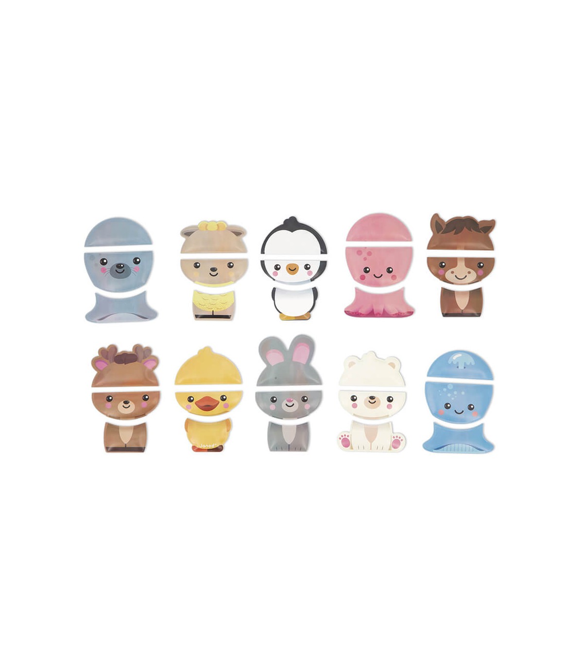 Este set incluye los siguientes animales, compuestos de 3 partes: un pingüino, una ballena, una foca, un pulpo, un oso polar, un reno, una oveja, un conejo, un caballo y un pato. Es decir: ¡un total de 10 animales para ensamblar o mezclar una y otra vez! Las piezas son adecuadas para manos pequeñas y flotan en el agua. Cuando las piezas estén mojadas, se adherirán a la cerámica: ¡parecen mágicas! Un juego de mezclar y relacionar ideal para que el momento del baño sea un momento de relajación y juego.