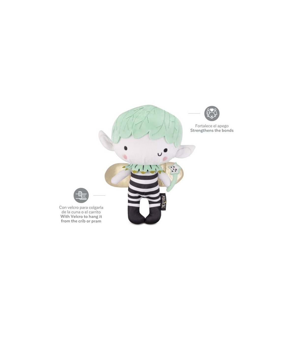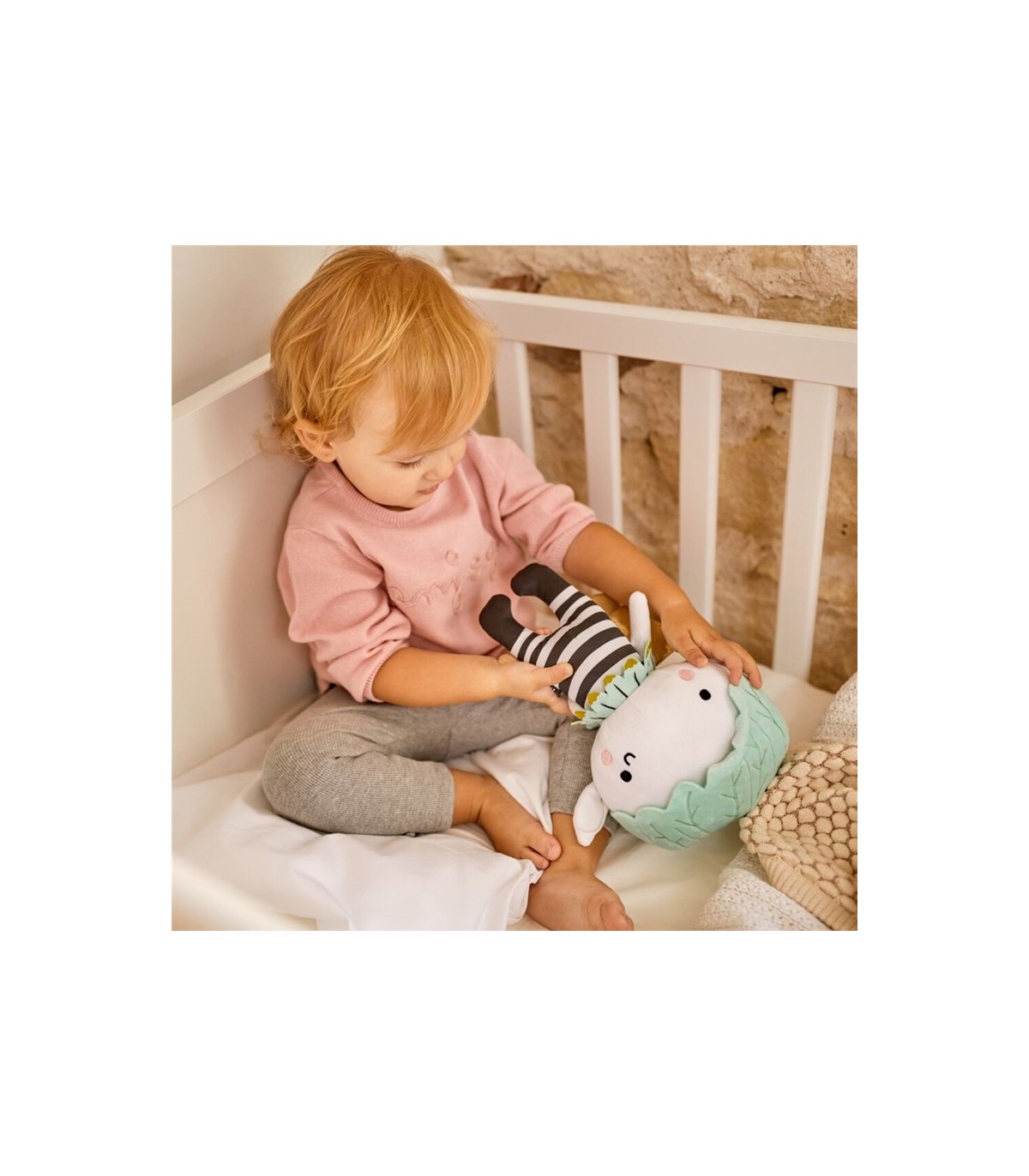 Peluche de apego perfecto para ayudarle a sentir seguridad y compañero ideal del sueño del bebé. Incluye una práctica cinta de velcro en la parte trasera para colgar de la cuna, carrito... Incorpora un bolsillo en la parte trasera.