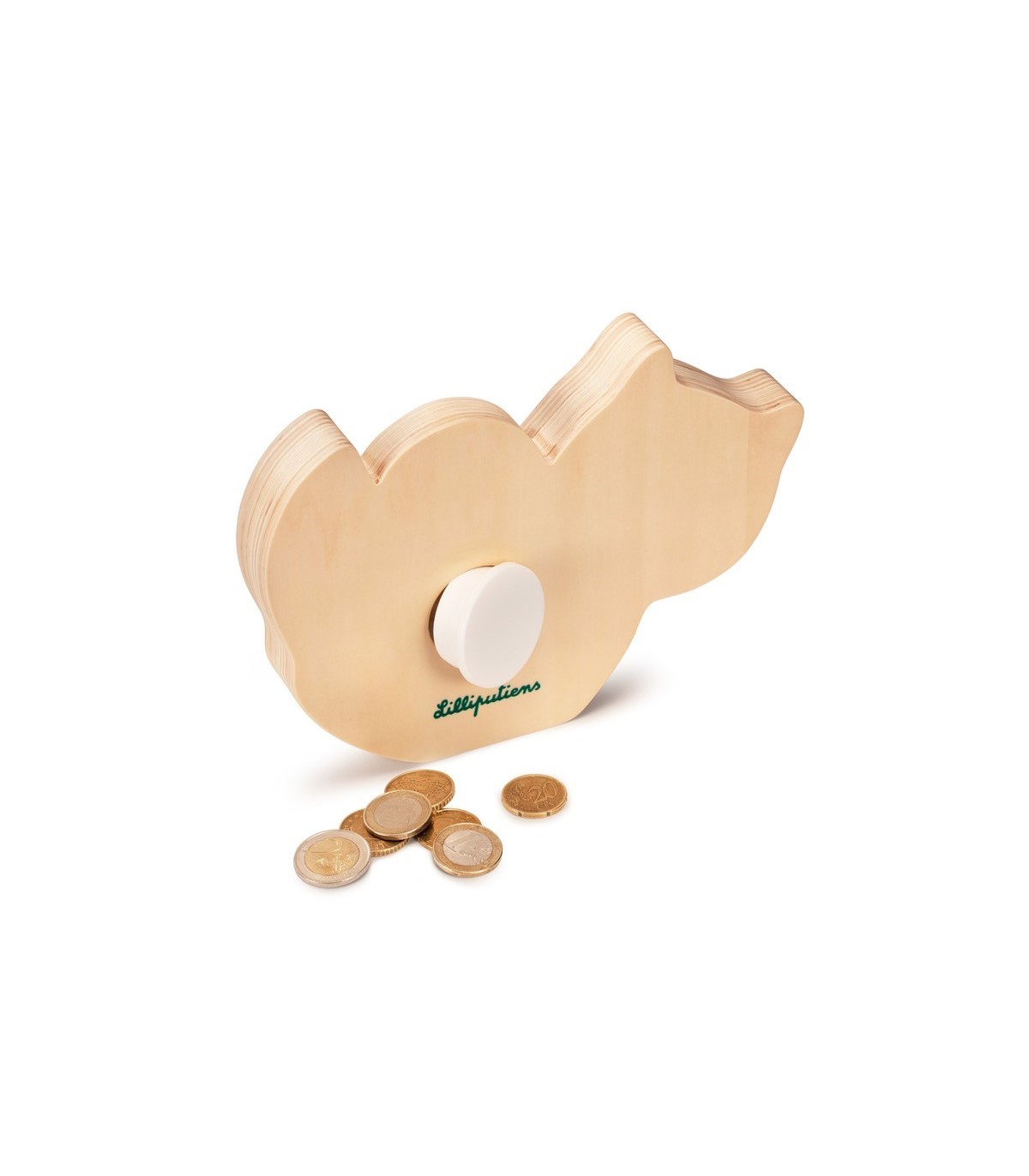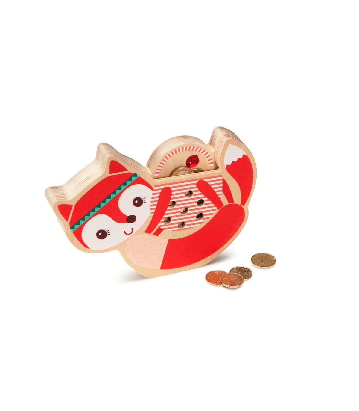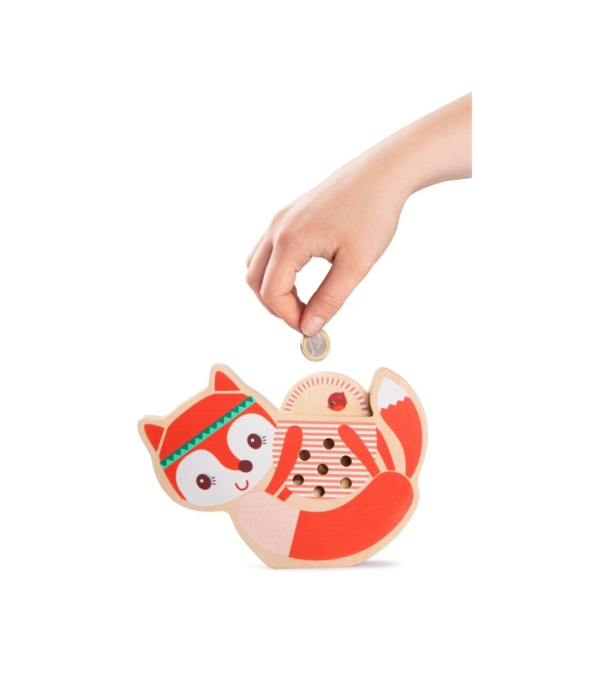 La vulpina Alice cuida de tus ahorros en esta hucha de madera, que se queda bien guardada en su cesta. Puedes ver cuánto dinero hay en la hucha a través de los agujeros.