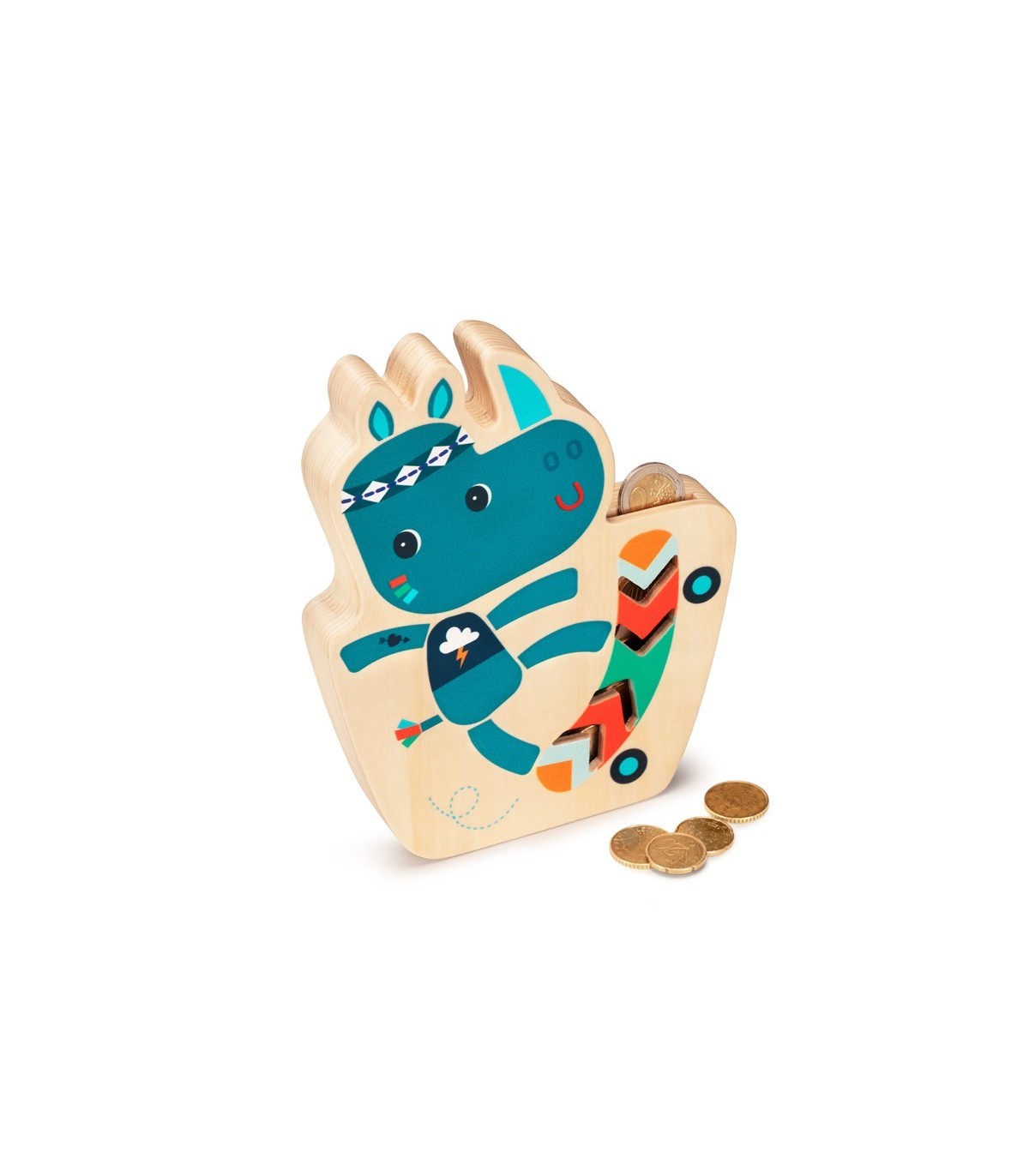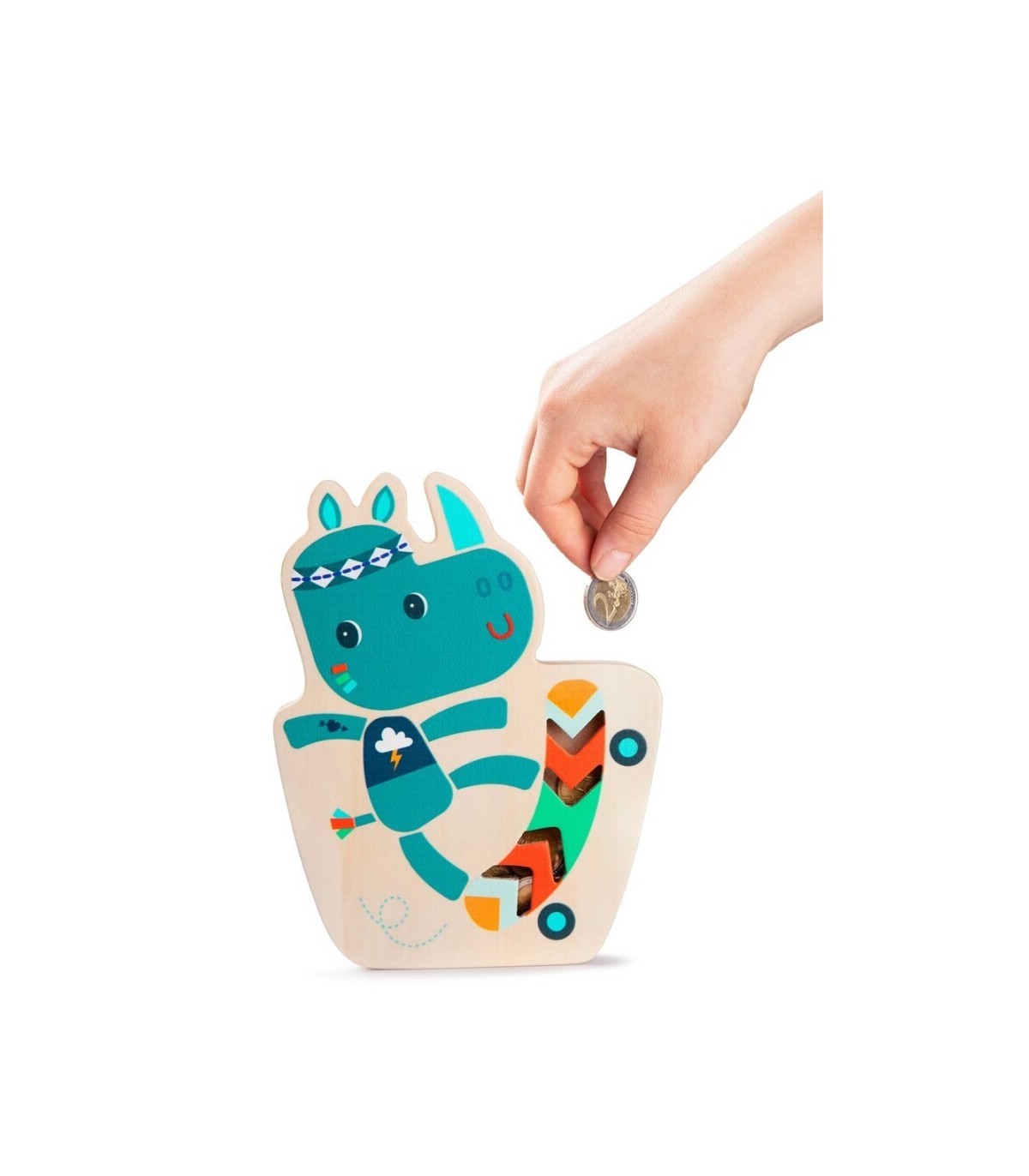 El rinoceronte patinador Marius cuida de tus ahorros en esta hucha de madera. Puedes ver cuánto dinero hay ya en la hucha a través del monopatín.