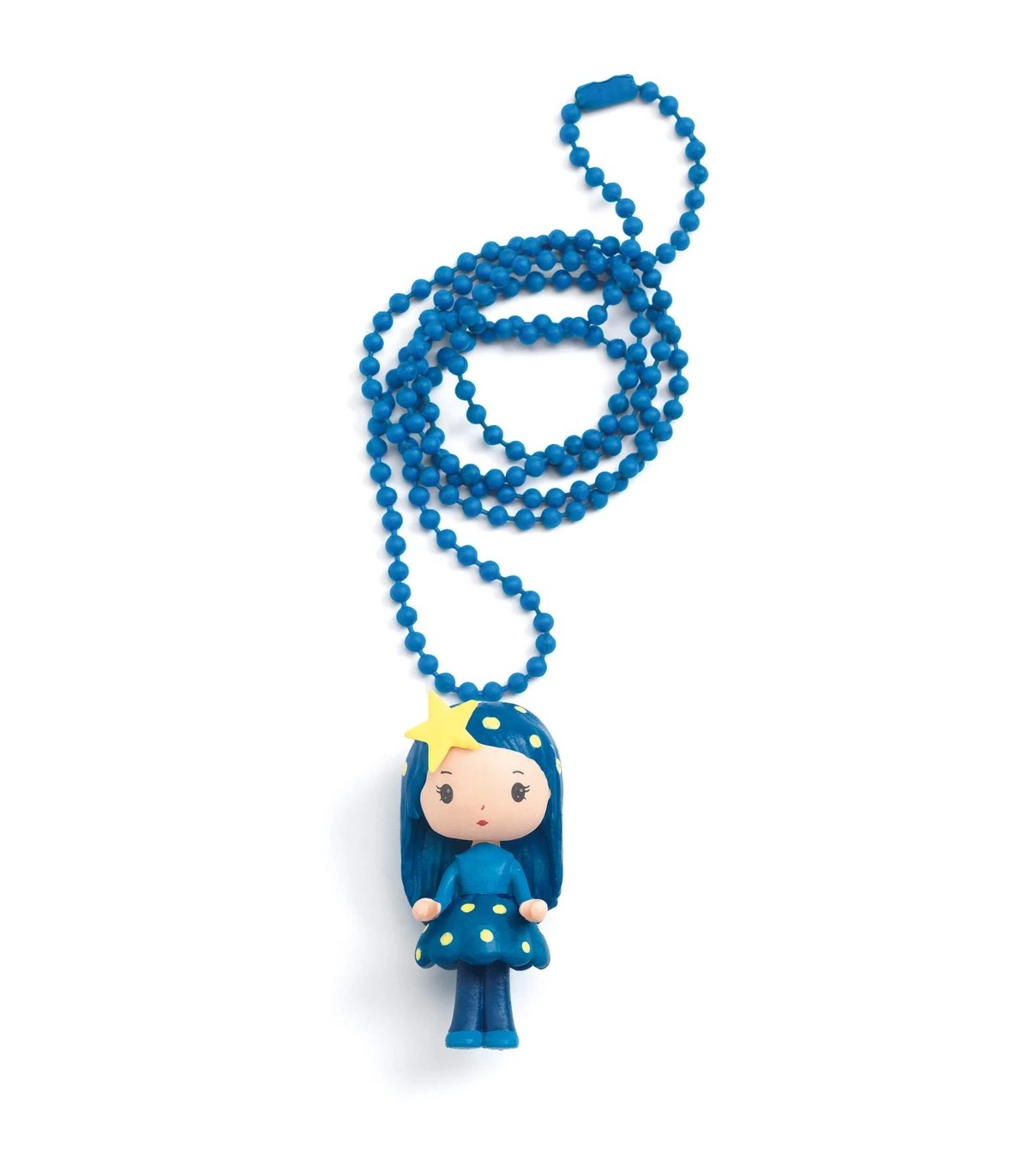 Un collar con un colgante que representa la figurita Tinyly «Luz» finamente esculpida en una cadena de metal de colores.