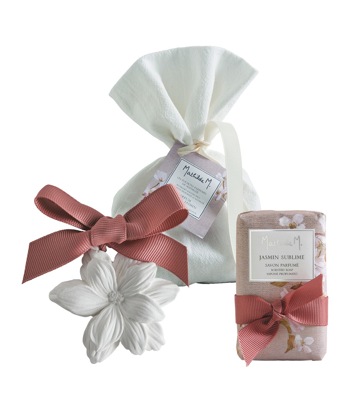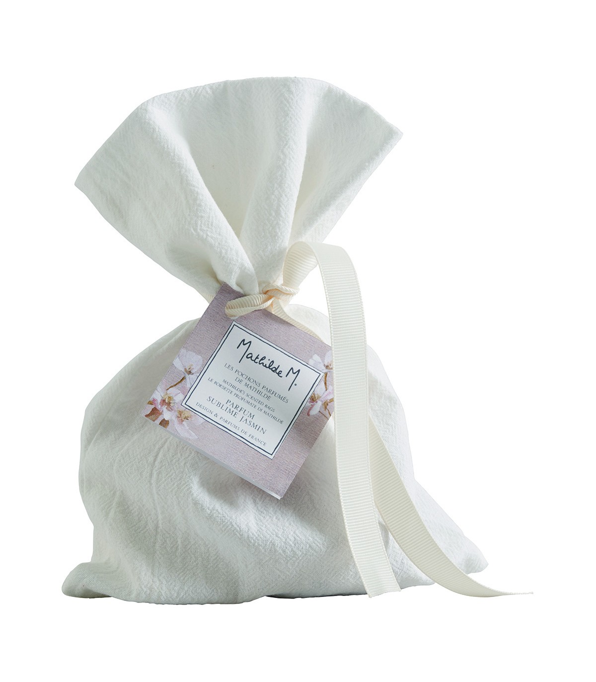 SAQUITO DE TELA CON CERAMICA PERFUMADA Y JABON DE TOCADOR AROMA SUBLIME JASMIN