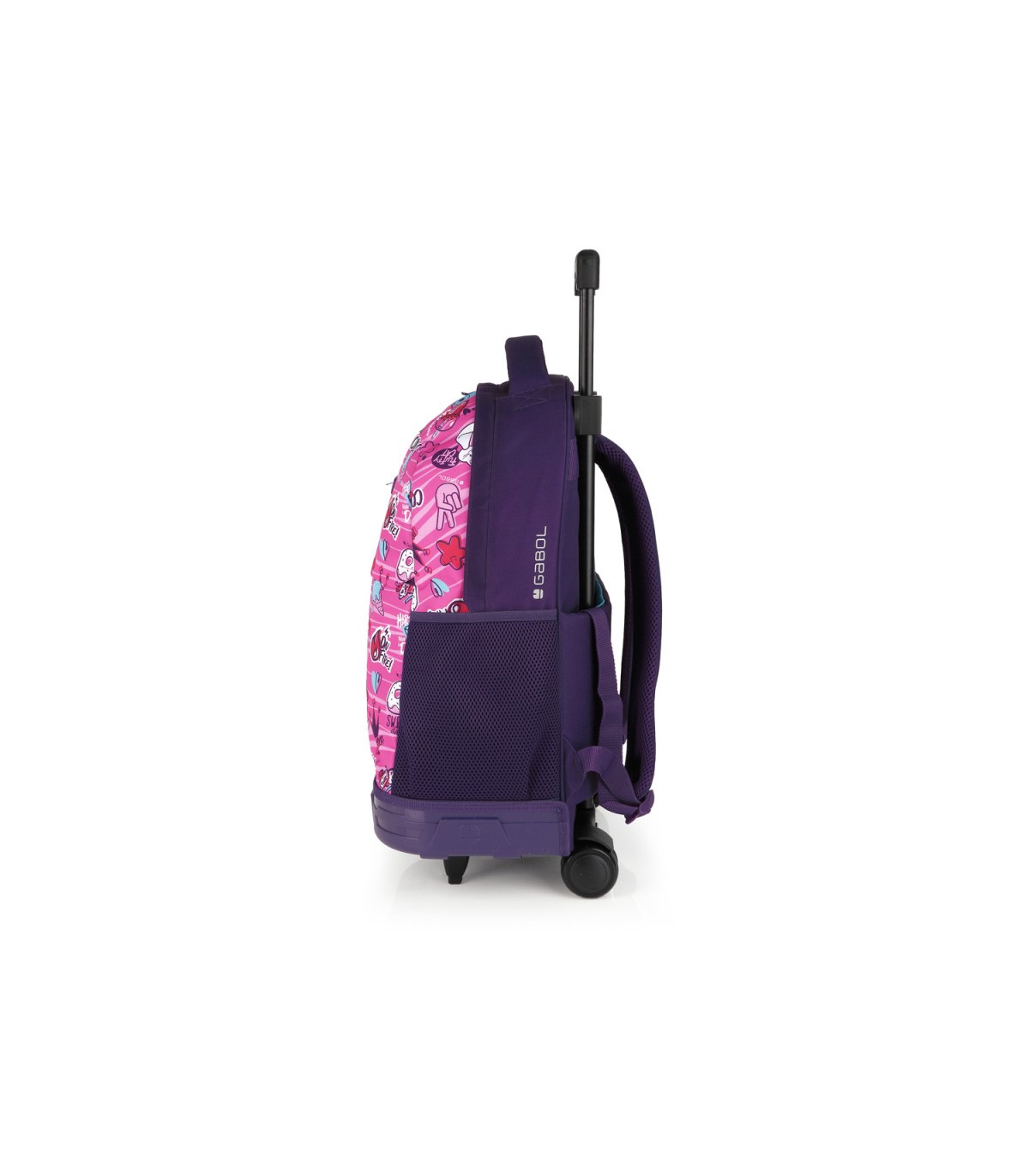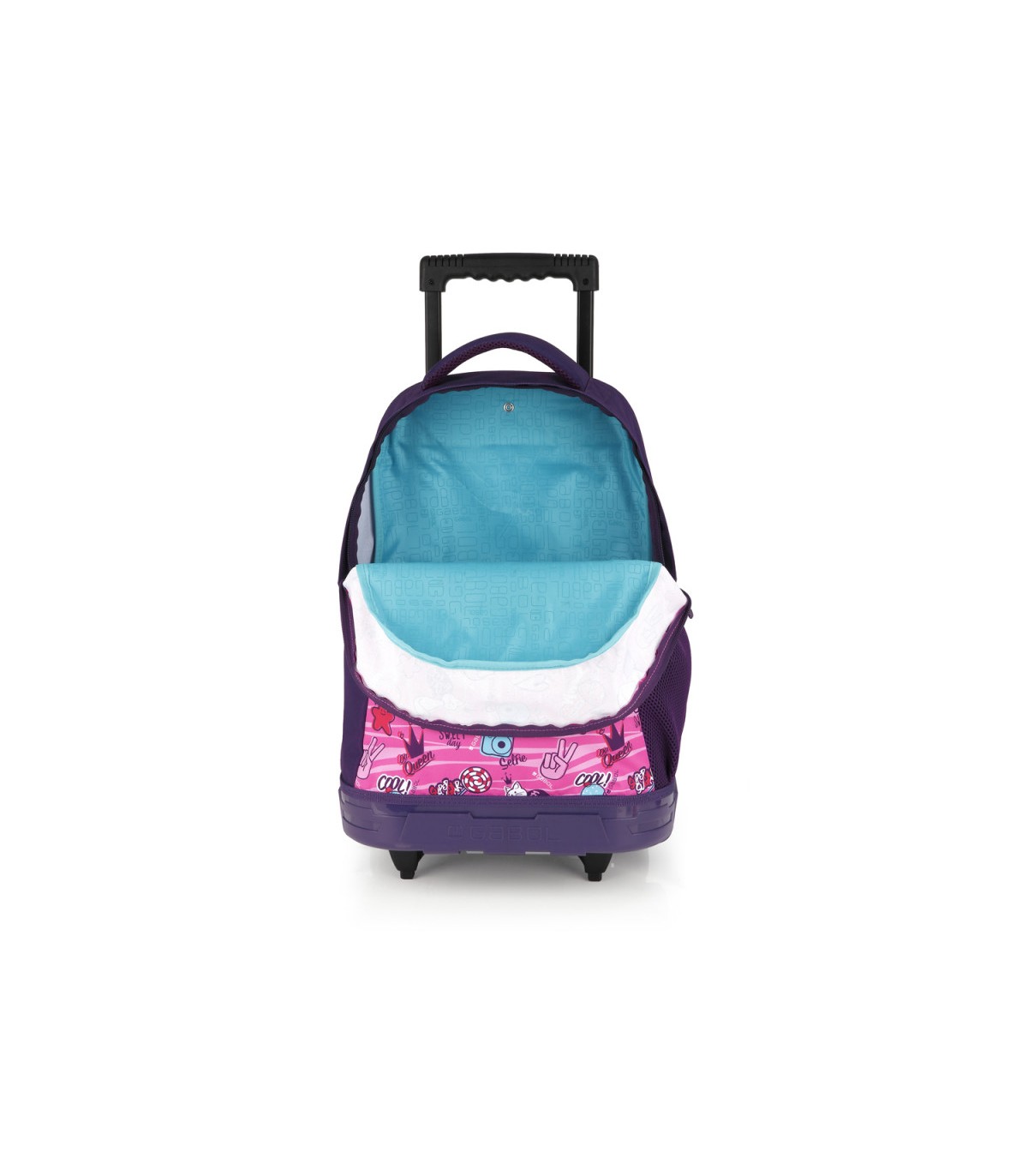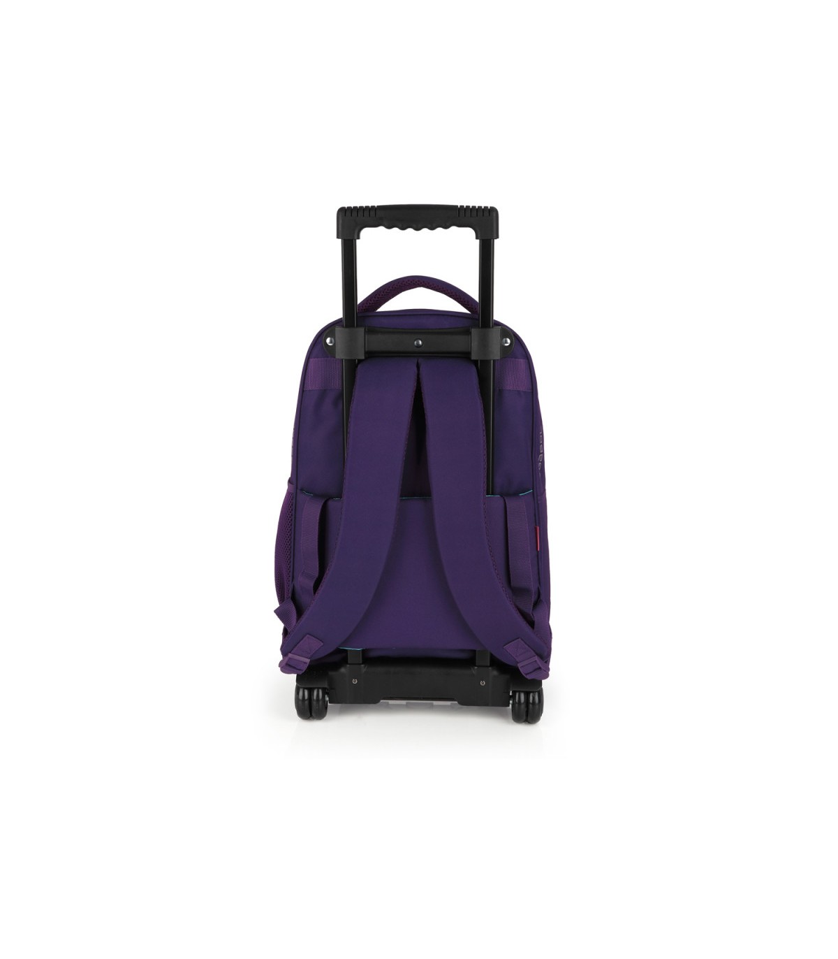 Mochila con ruedas impermeable. Espalda acolchada para servir de amortiguación con el contenido. Hombreras acolchadas y reforzadas. Bolsillo en el lateral exterior. Su material impermeable junto a las cremalleras cubiertas protegen totalmente el interior de la lluvia. El tirador totalmente extendido mide 92 cm. Medidas: 34x46x20 cm