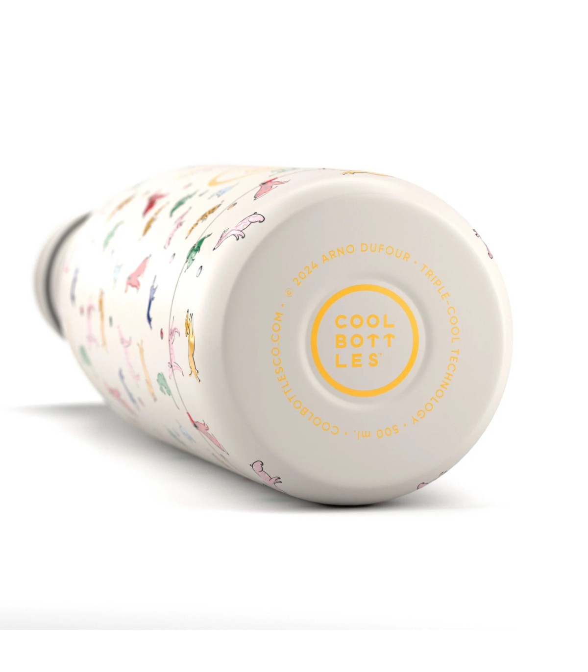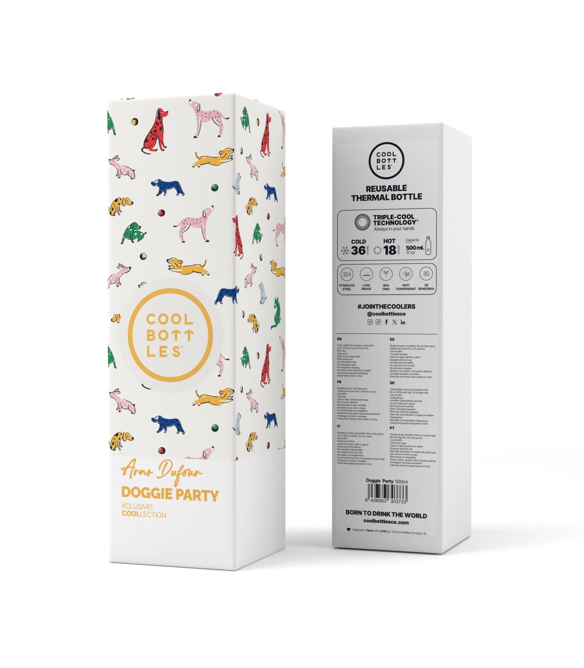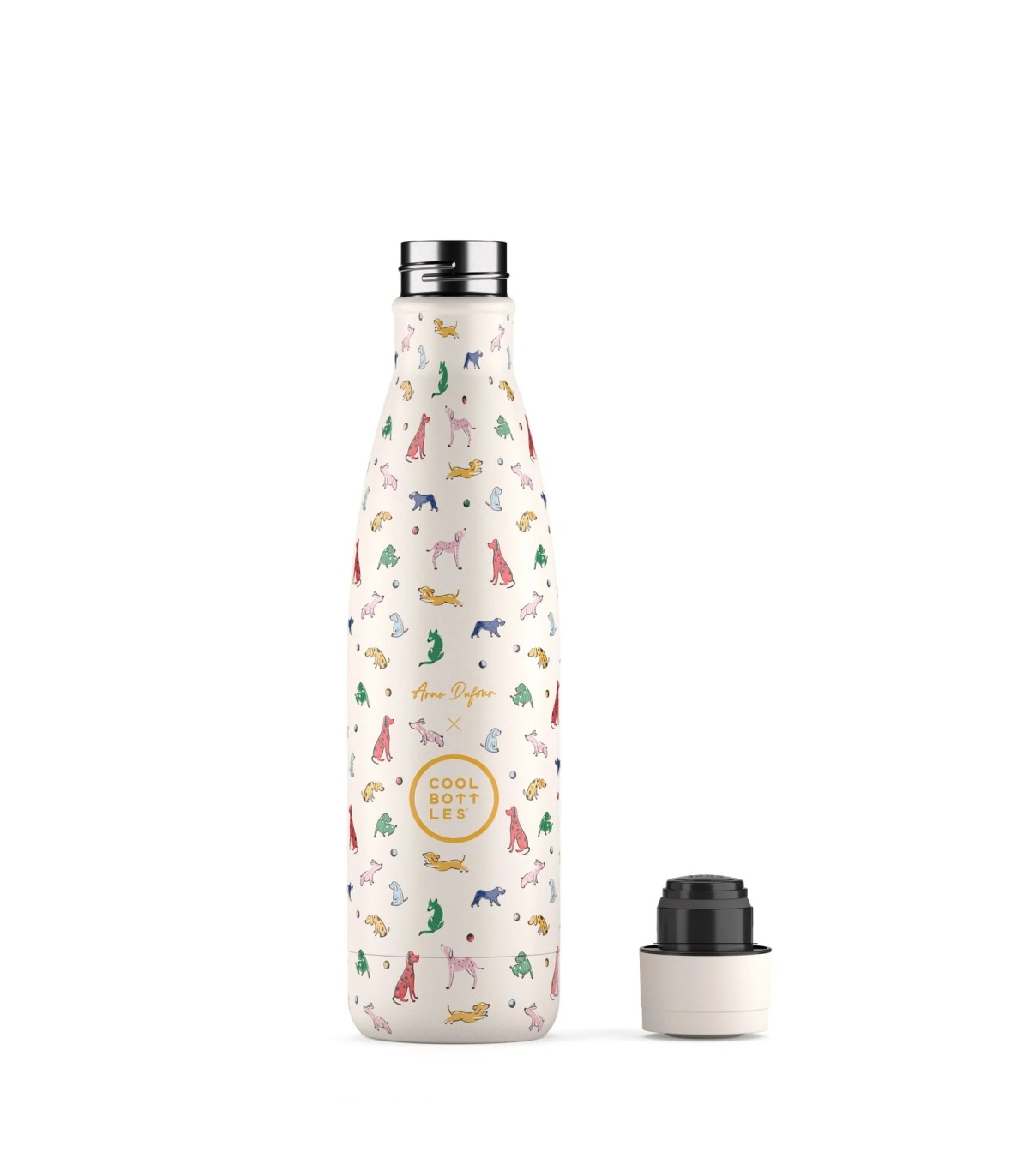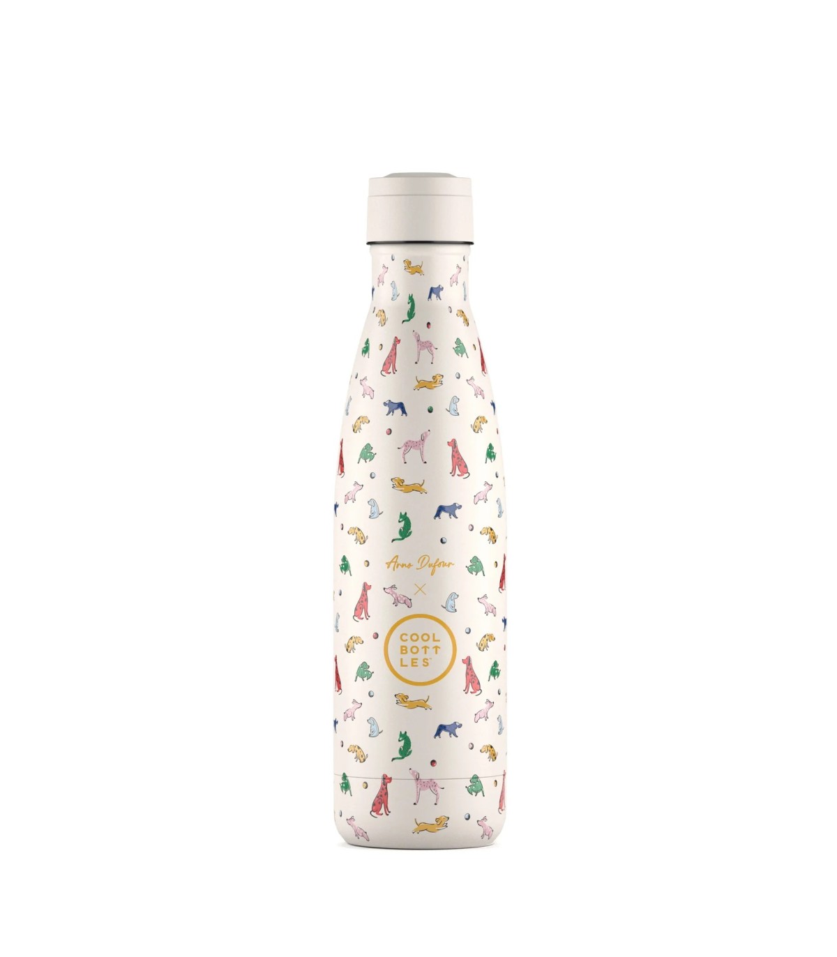 Arno Dufour, talentoso diseñador e ilustrador francés, ha colaborado con numerosas marcas reconocidas. Doggie Party, una botella decorada con un estampado vibrante y alegre. Llena de perritos de diferentes razas, pero todos llenos de color: algunos son de un brillante azul, otros de un cálido amarillo, y también hay unos adorables en un suave rojo. Todos ellos en plena acción, saltando y corriendo tras una pelota que parece estar rodando por el estampado.