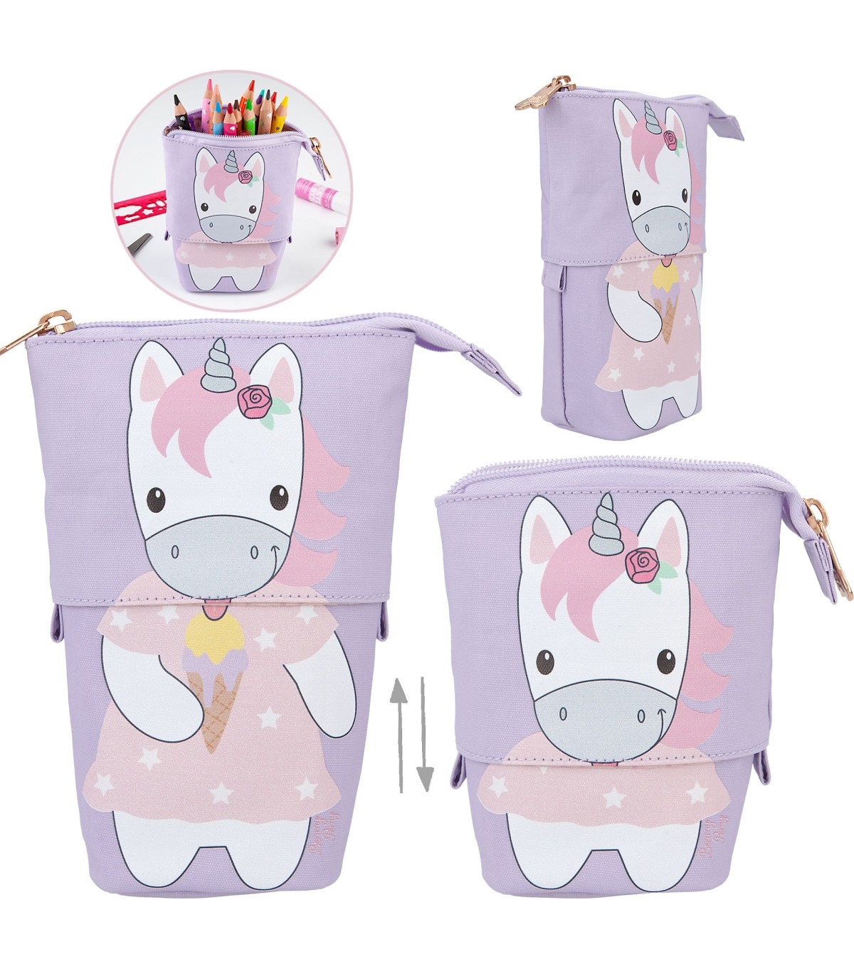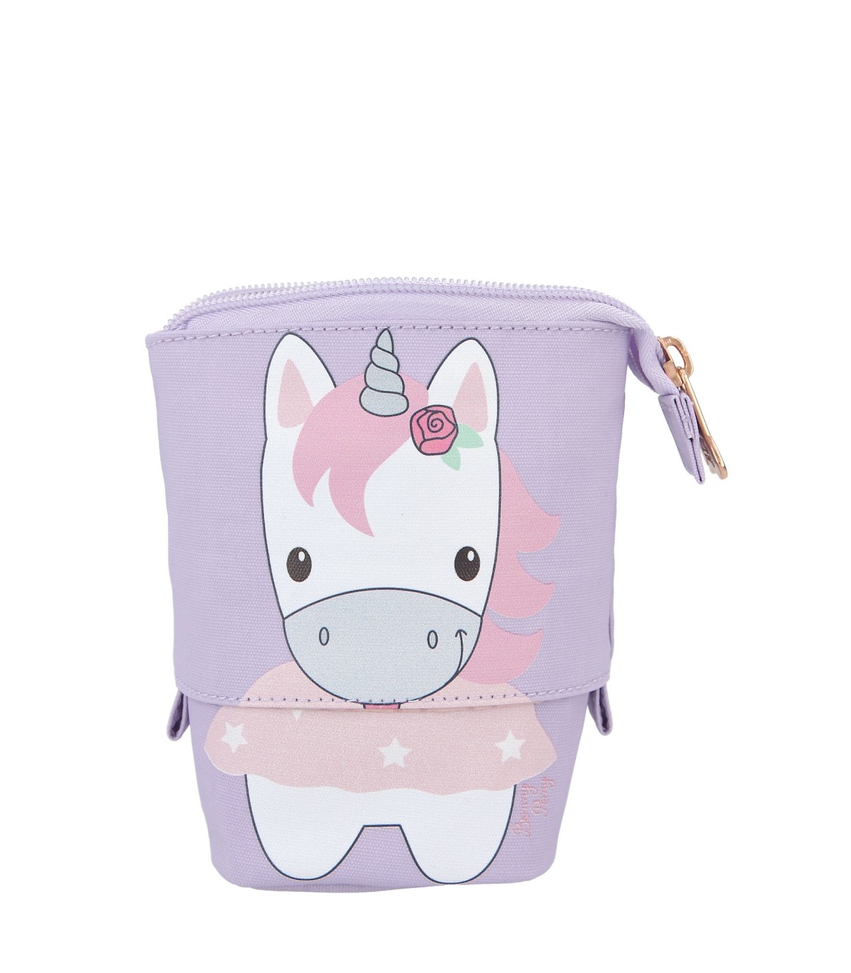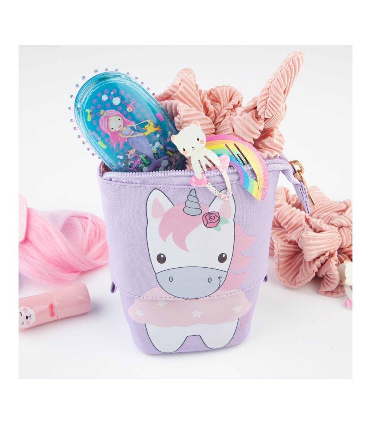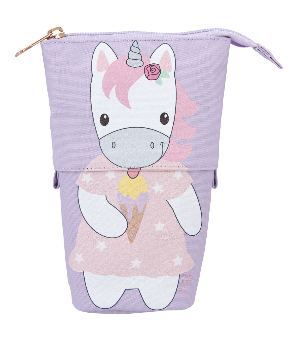 ¡Qué unicornio más mono! La parte superior de este estuche de Princess Mimi se desliza hacia arriba y hacia abajo pudiéndose convertir fácilmente en un portalápices. Así se tienen los lápices o rotus a la vista y es más fácil seleccionar el que se desea utilizar. De tejido revestido y con cremallera.