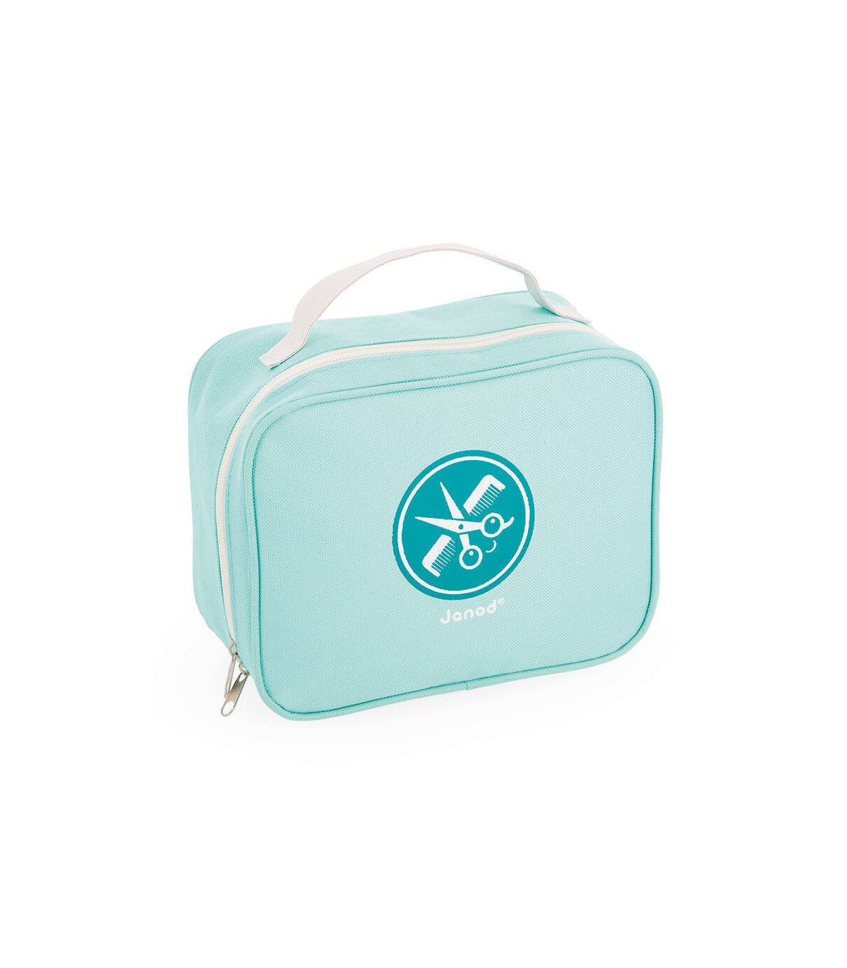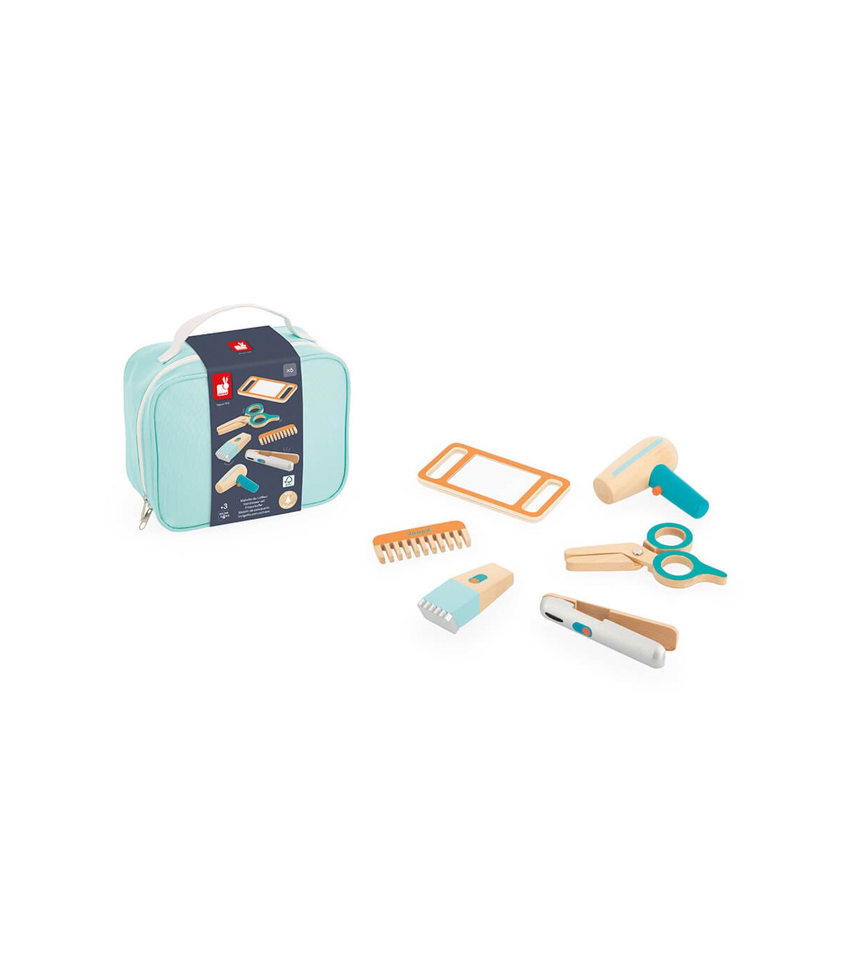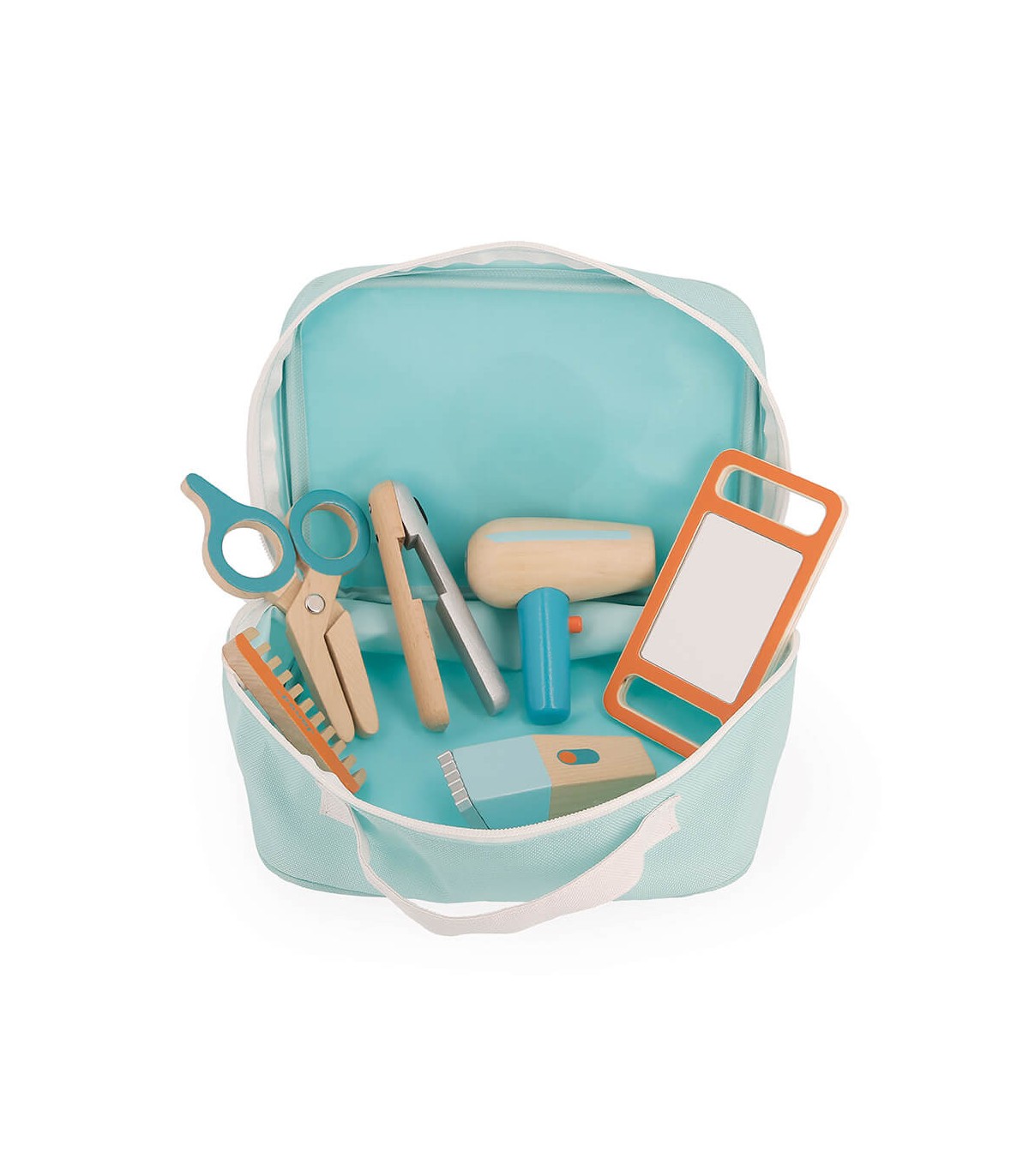 ¿Y si nos cortamos el pelo? Este bonito maletín contiene 6 accesorios: una plancha, un peine, unas tijeras, un espejo, un secador de pelo y una navaja de afeitar, para imitar al peluquero. Después de jugar, todos los accesorios se guardan en el práctico maletín que se puede llevar a todas partes gracias a sus asas de tela. Un juguete de imitación ideal para estimular la imaginación del niño. Juguete de madera FSCTM y pintura al agua. Juguete de imitación para niños a partir de 3 años.