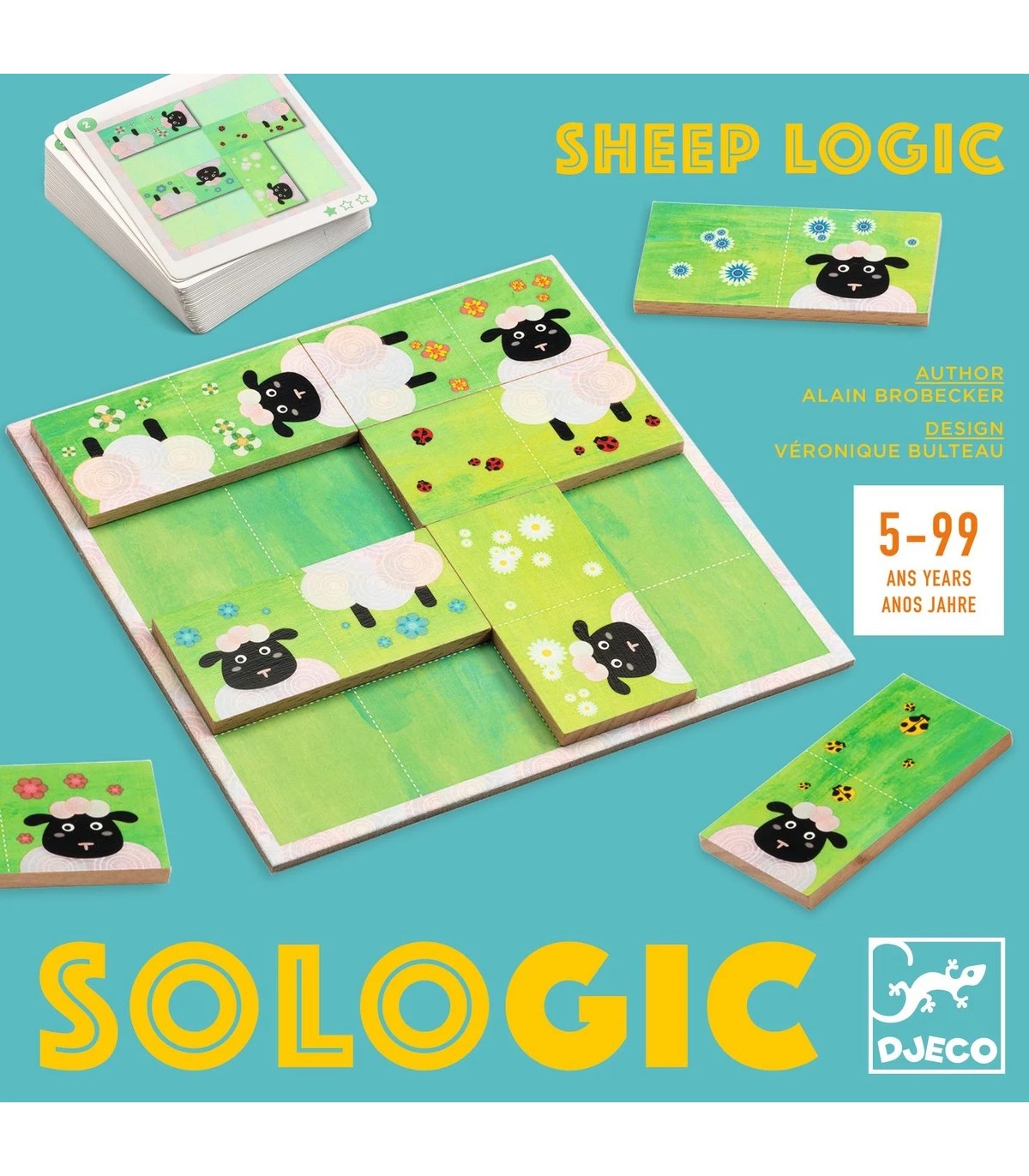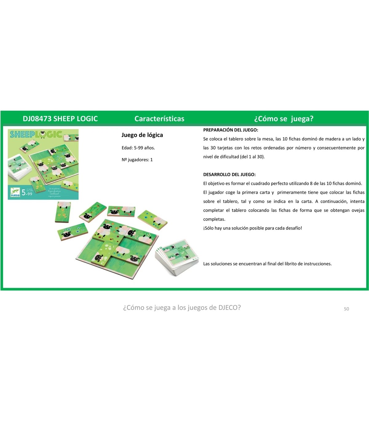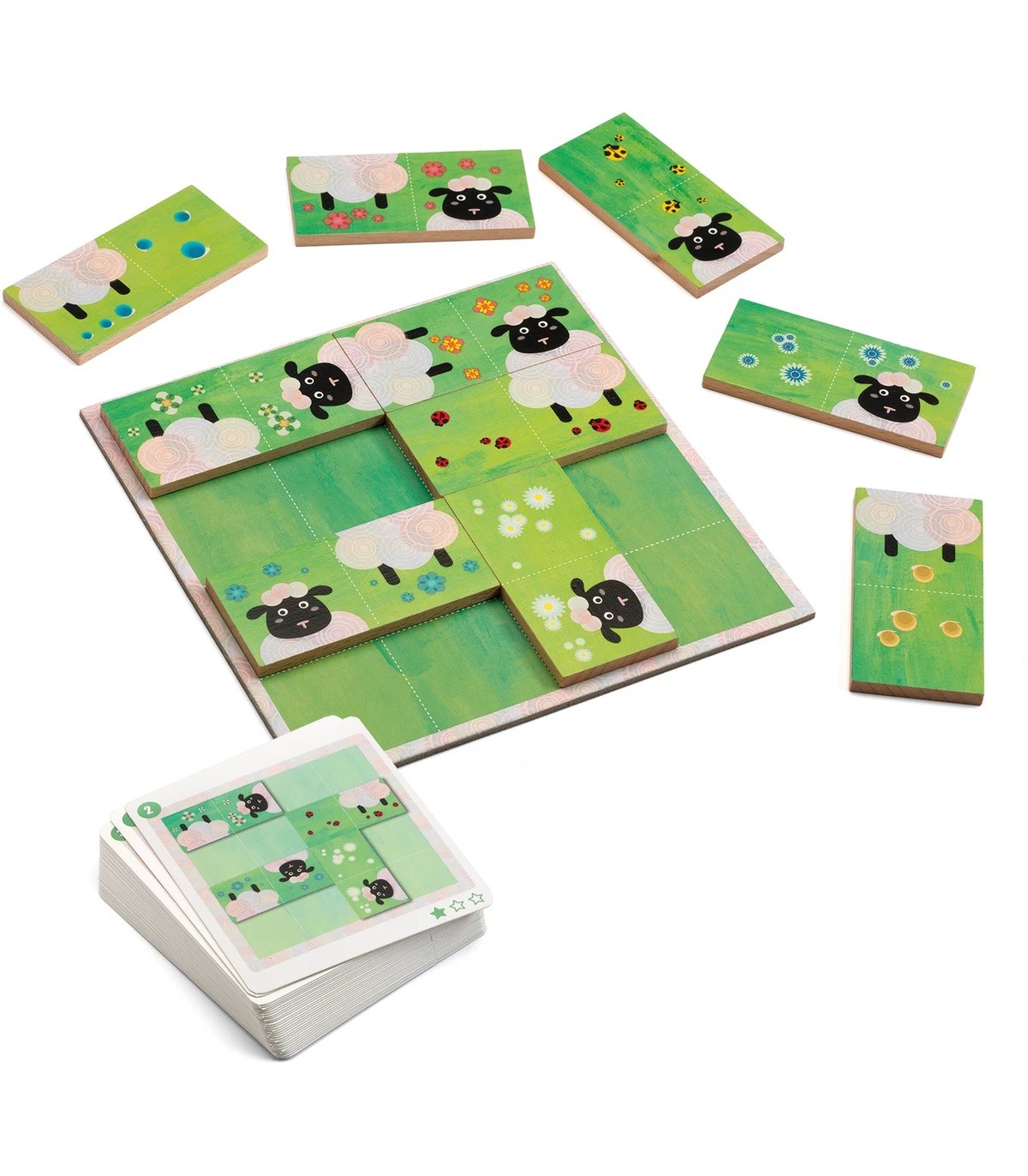 -Un juego de paciencia que incluye 10 piezas de dominó de madera. Para triunfar, hay que reconstruir todas las ovejas poniendo las piezas de dominó de la carta. En total, 30 desafíos con las posiciones de salida marcadas. ¡A pensar!