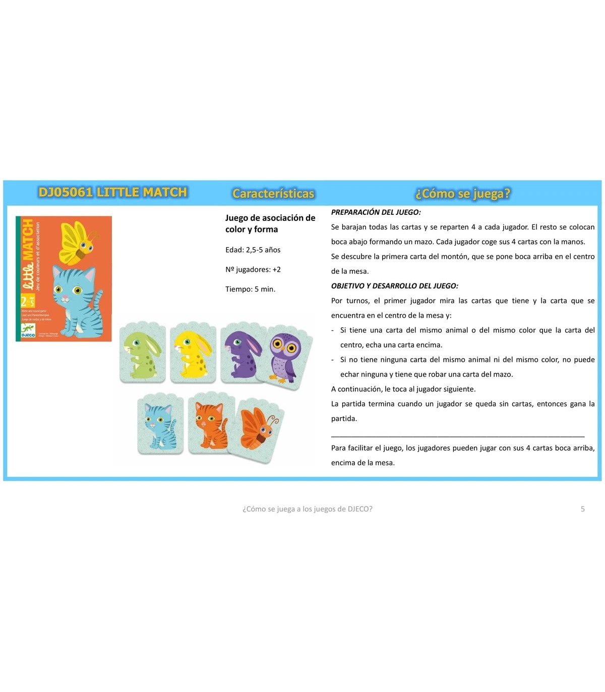 Un juego de asociación de formas y colores especialmente concebido para niños a partir de 2 años y medio. Para poner una de sus cartas sobre la mesa, debe ser del mismo color o tener el mismo animal que la carta colocada anteriormente. El primer jugador en deshacerse de sus cartas gana la partida.