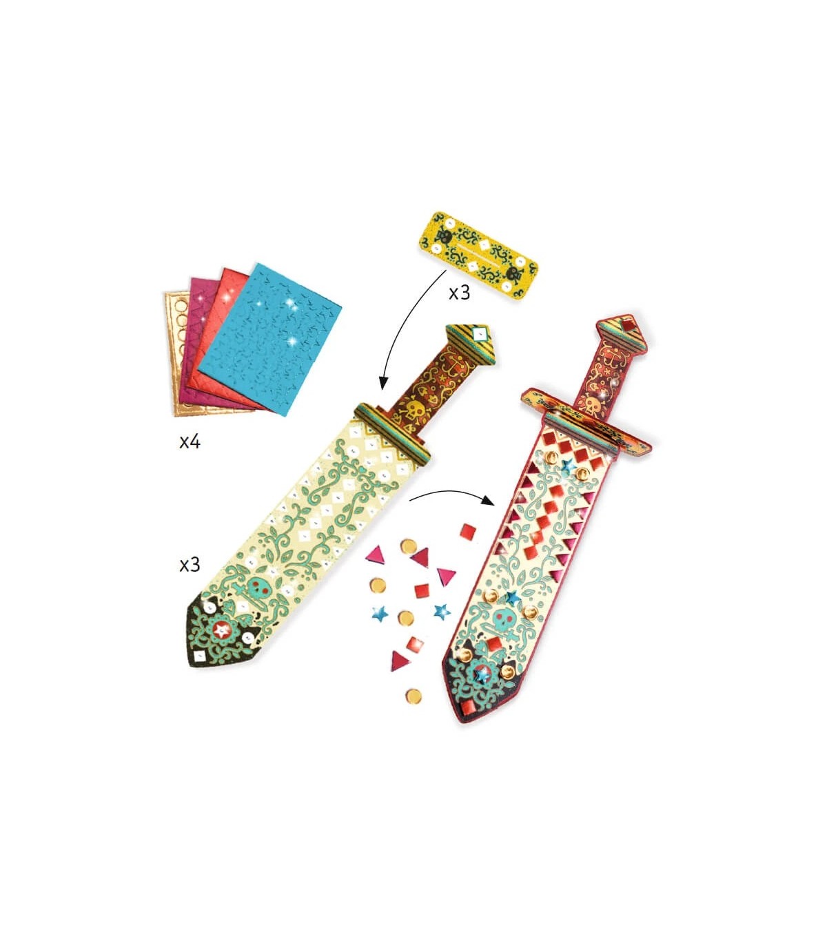 Contenido: 3 sables de cartón grueso, 4 hojas de pegatinas de espuma de mosaico metalizadas, 1 folleto explicativo.