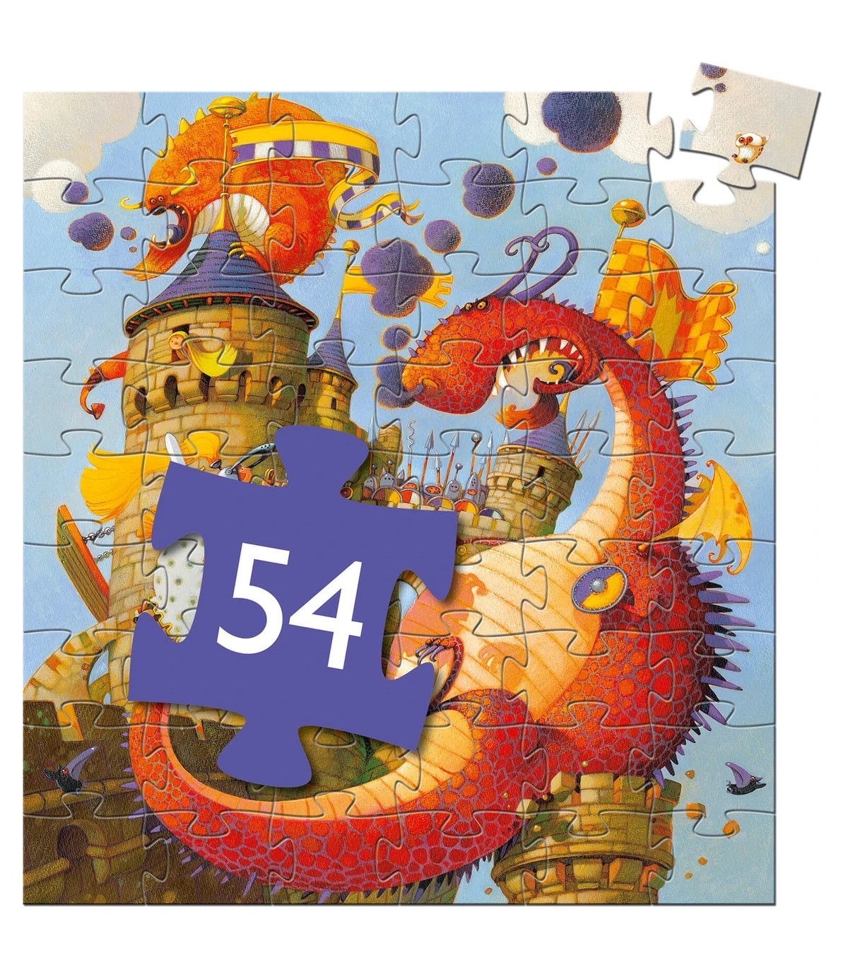 -El valiente caballero lucha contra los dragones para salvar a la princesa en el castillo. Un magnífico puzle de 54 piezas en una elegante caja con forma de castillo.