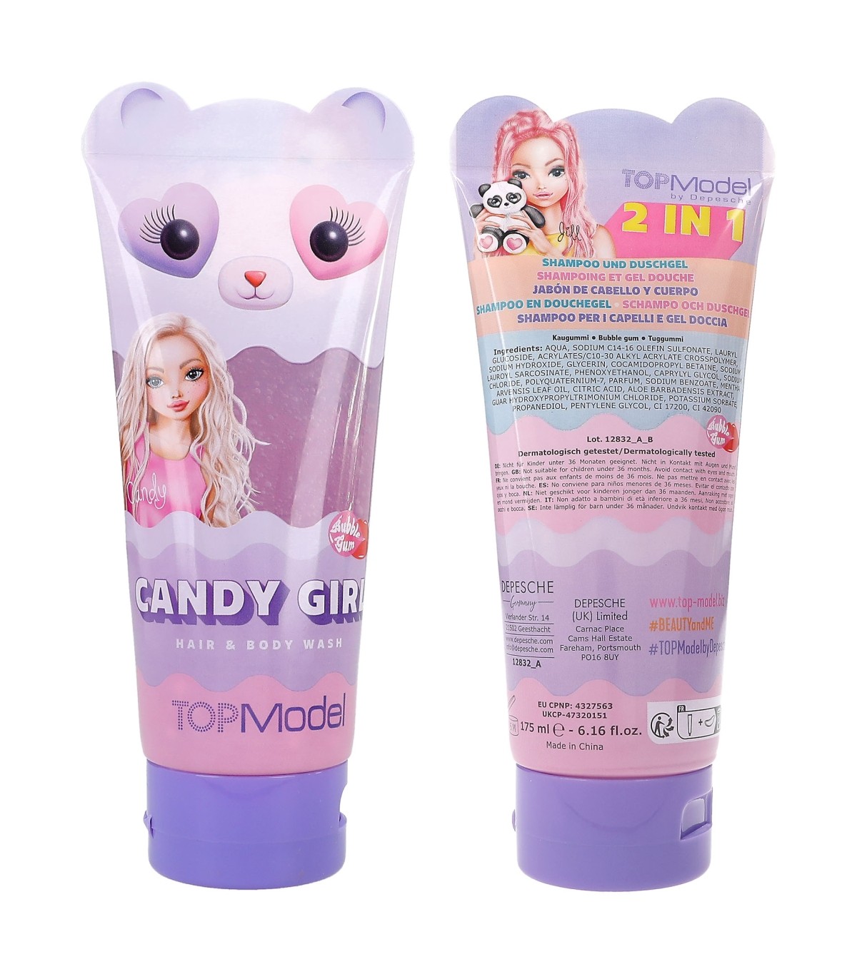 Dos en uno: champú y gel de ducha de TOPModel, todo en uno. Dos maravillosos diseños de tubos rematados con figuras, con aromas fantásticos y con ventana transparente: Candy Girl en tubo con osito y gel lila con aroma a chicle o Berry Girl en tubo con corazones y gel rosa con aroma a arándanos. Contenido de cada tubo: 175 ml.
