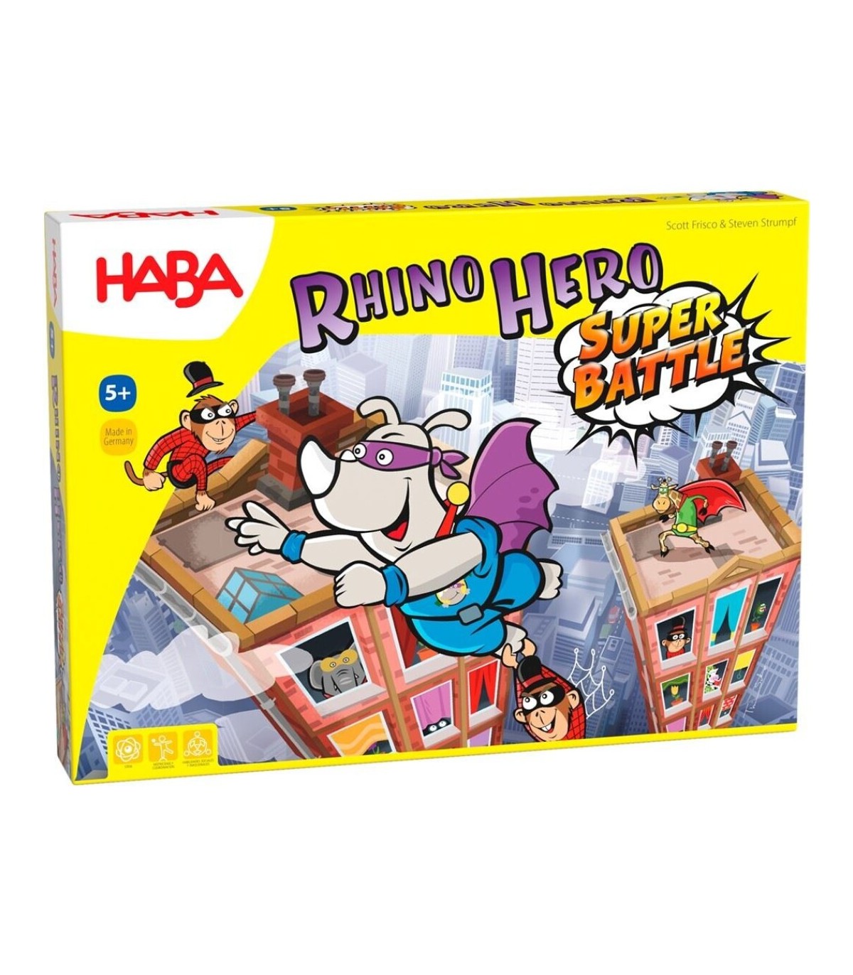 ¡Rhino Hero de nuevo en acción con una construcción más amplia! Por turnos los jugadores van construyendo pisos del edificio y se baten en duelo entre ellos para hacer que sus superhéroes alcancen la posición más elevada y ser así el ganador de la partida.