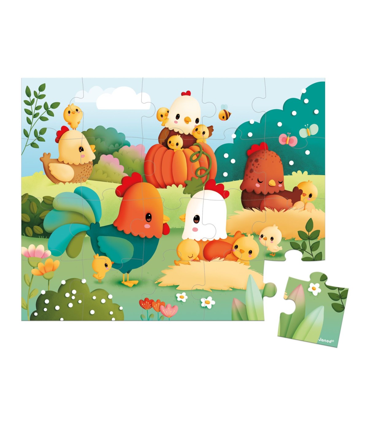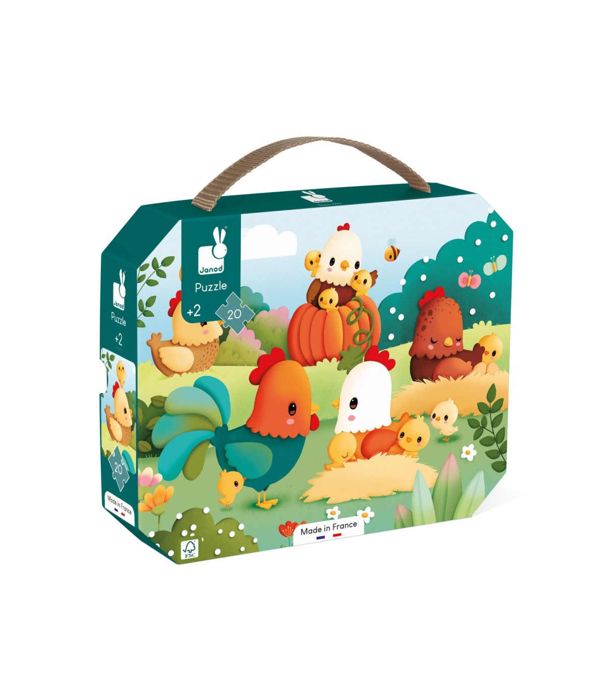 Una vez terminado el juego, se guardan todas las piezas en el bonito maletín que también tiene las preciosas ilustraciones. Además, no nos olvidemos de las estrellas de este puzzle de cartón: ¡las gallinas! Por supuesto, el gallo es el centro de atención y los traviesos pollitos divierten al bebé. ¡Podéis contarlos, describir lo que hacen y enseñarle al pequeño los nombres de estos animales únicos del corral! Este puzle fabricado en Francia está hecho de cartón con certificado FSC™ y pintado con tintas vegetales.