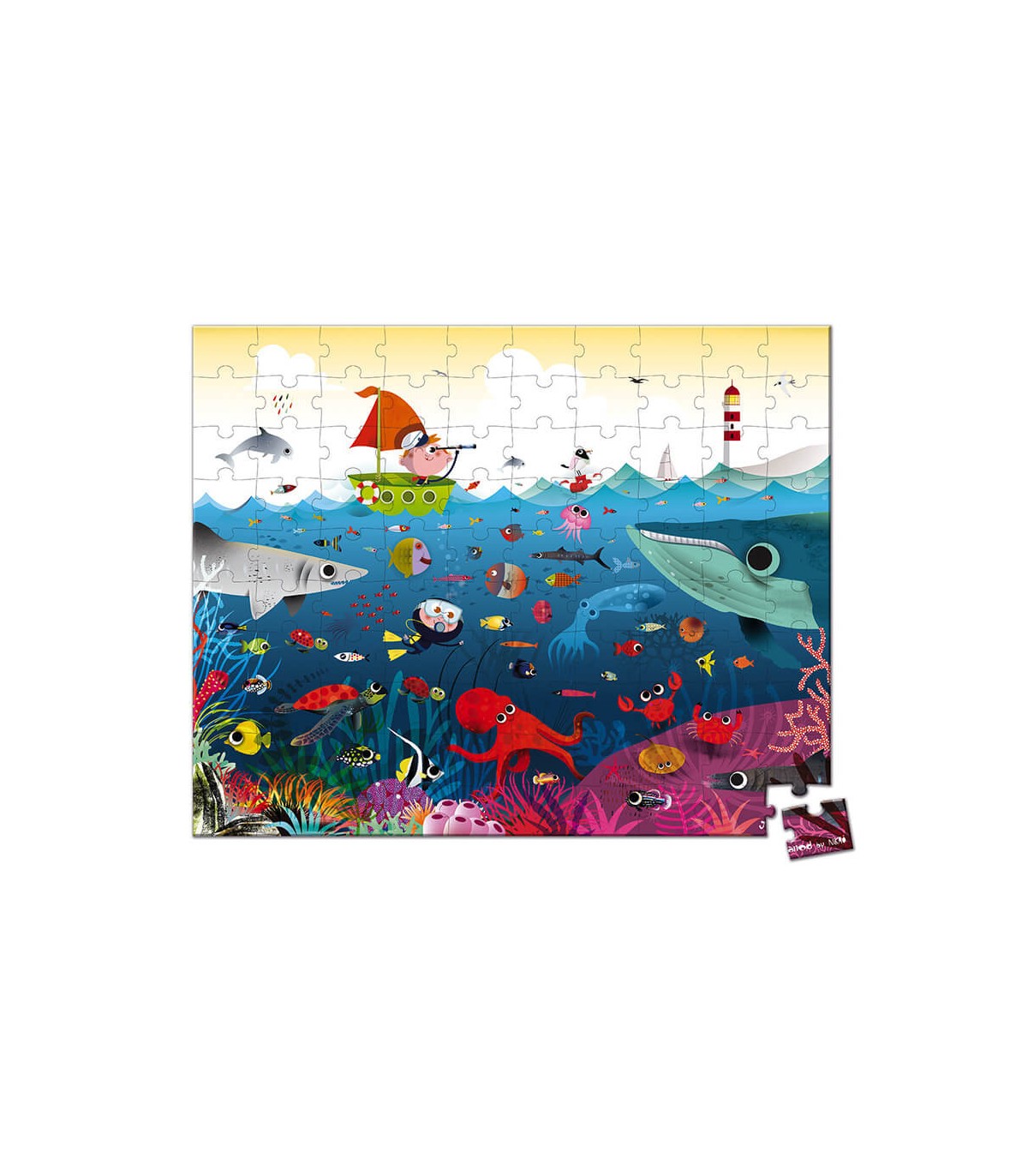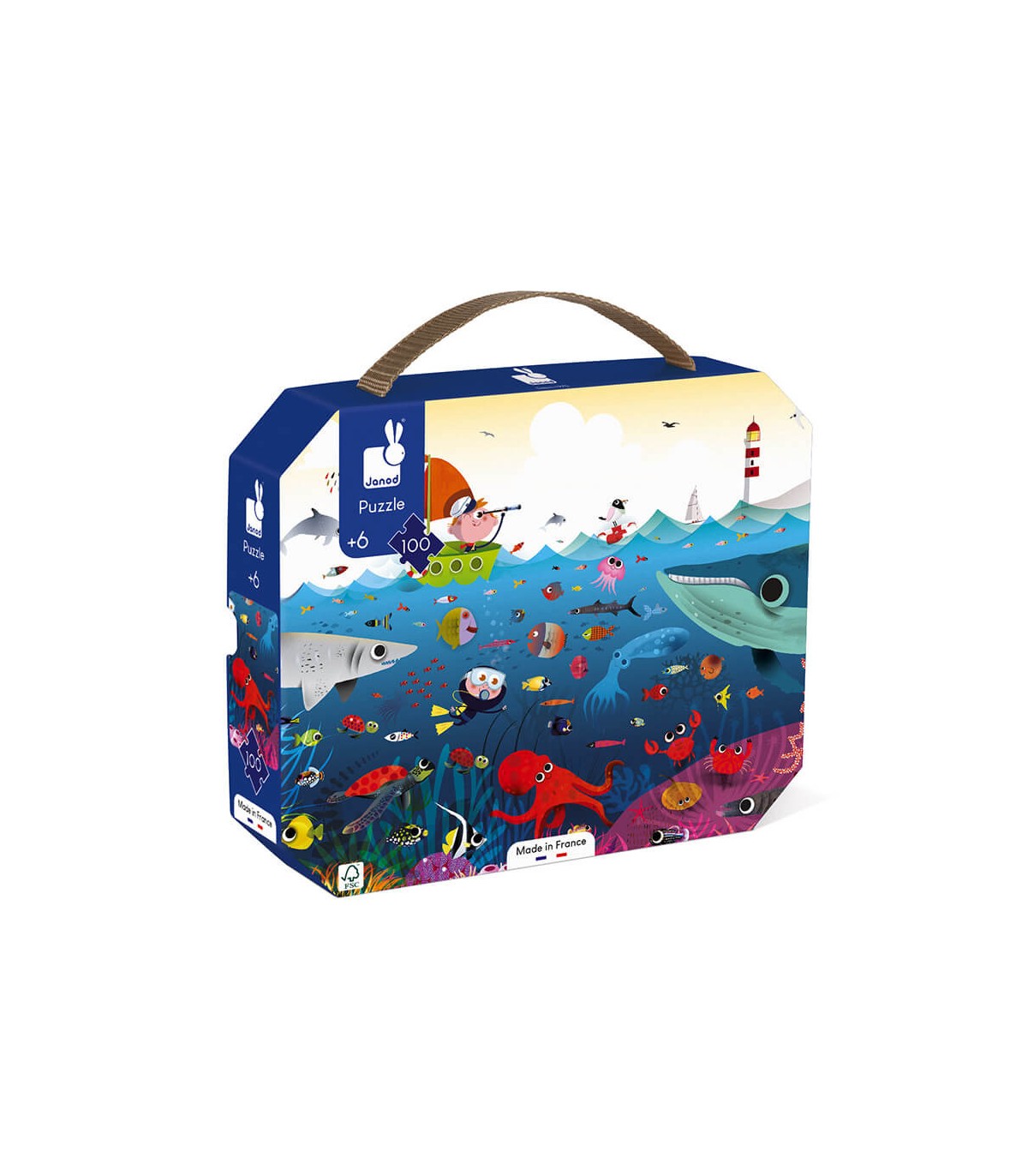 ¡Visita 20.000 lugares bajo los mares para explorar las profundidades y sus criaturas! ¡Un chaval sobre su barca corre el riesgo de enfrentarse a sorpresas! Estos bonitos dibujos apasionarán a los niños a partir de 5 años. Una vez terminado, el puzle mide 50 x 40 cm. Contiene un póster que sirve como modelo. Número de piezas: 100. Fabricado en Francia. El material de base forestal en este producto es reciclado.