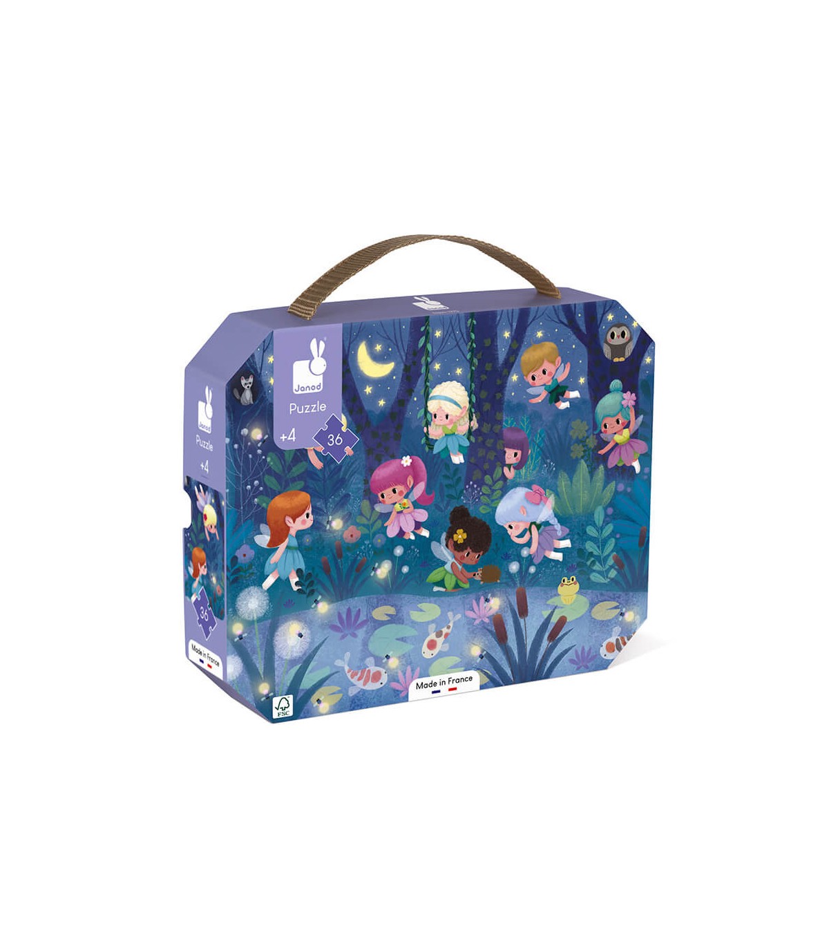 He aquí un bonito puzle de cartón de 36 piezas para descubrir este pequeño mundo mágico y desarrollar la memoria y la habilidad. Este puzle se transporta fácilmente gracias a su bonito maletín y a su asa de tela. Contiene un póster que sirve como modelo para los principiantes. Los más avezados podrán a continuación realizar el puzle con total autonomía. Fabricado en Francia. El material de base forestal en este producto es mix FSC®.