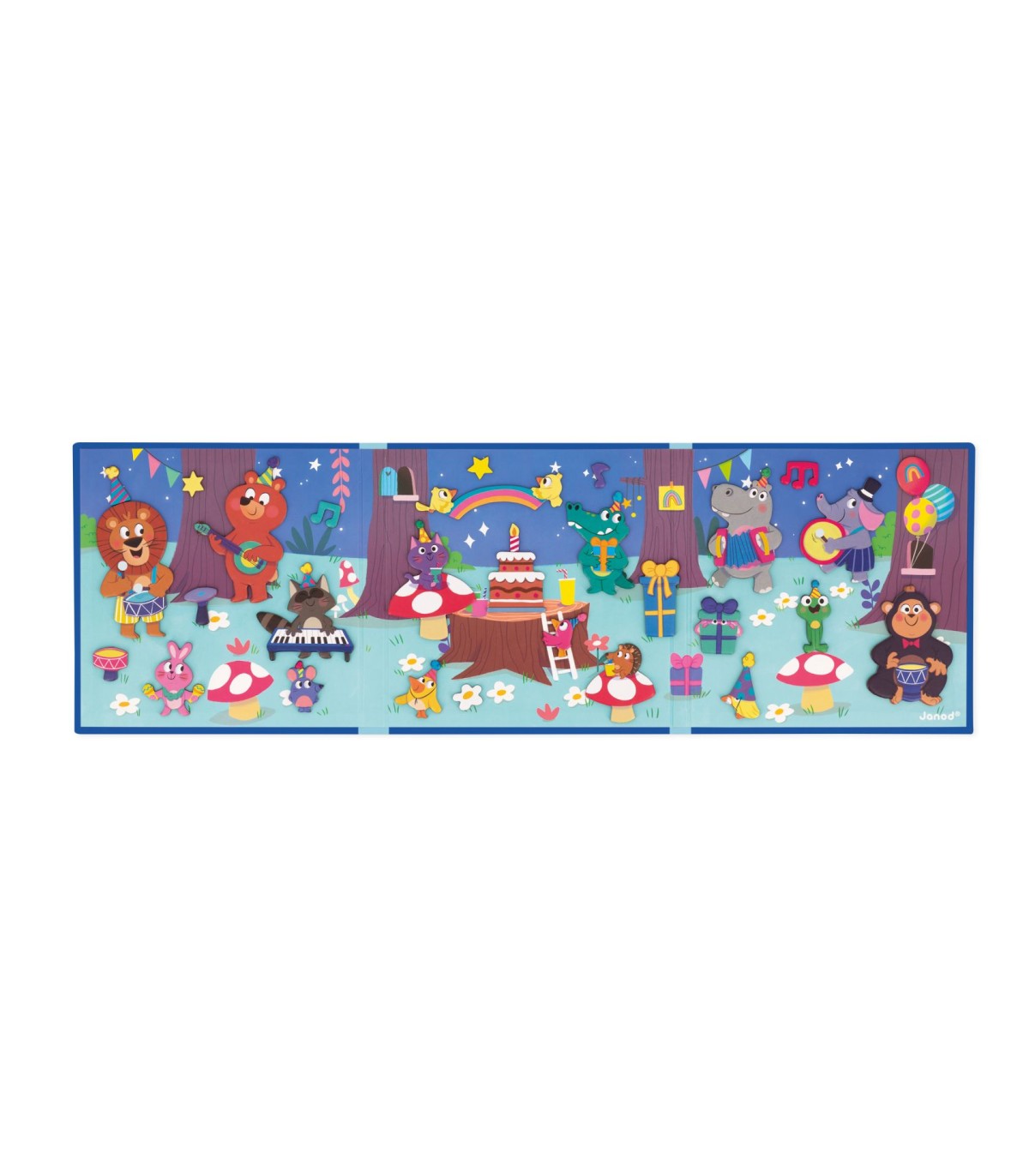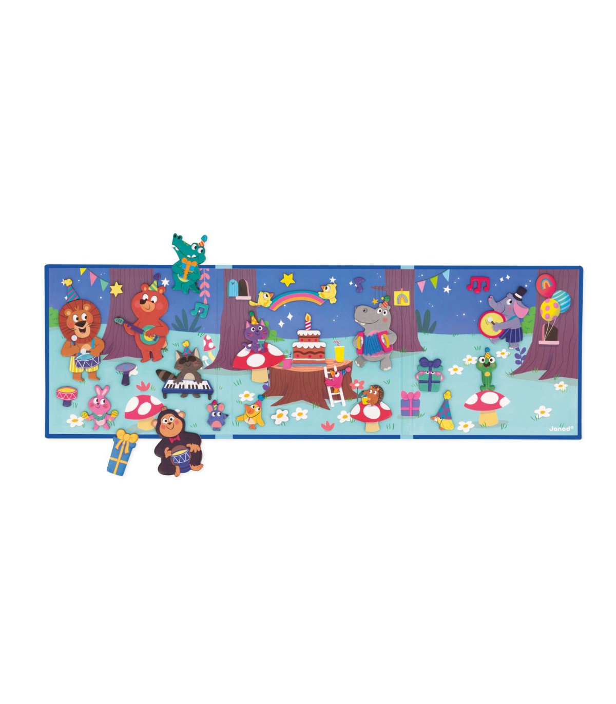 ¡Ven, corre! Acaba de caer la noche en el bosque y hay una gran sorpresa. Este juego magnético sorprenderá a los niños a partir de 3 años. Este decorado ilustrado estimulará la imaginación y la motricidad fina del pequeño. Este juego magnético consta de un tablero decorado grande y 30 imanes. ¡Los imanes, una vez colocados en el festivo panorama, serán el punto de partida de un montón de maravillosas historias! ¡Han venido los animales y hay una tarta con una vela en el centro cuando empieza a sonar la música! Pero, a todo esto, ¿de quién es el cumpleaños? Será el niño quien lo decida.