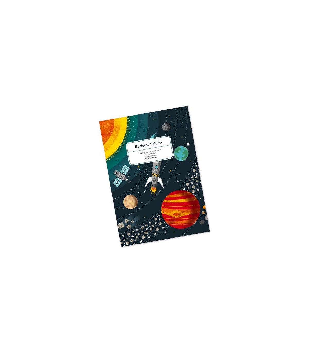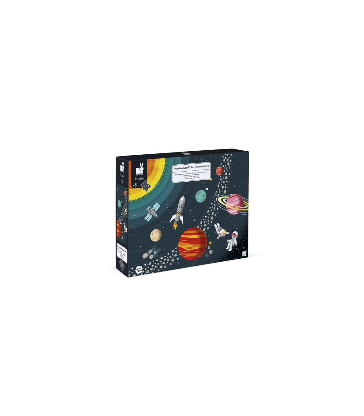 El puzle incluye un cuadernillo educativo para aprender a conocer mejor nuestro Sistema Solar y lo que lo compone. En cuanto al estilo, este puzle es mate, pero se ha aplicado un barniz a los planetas para que destaquen y sean fácilmente identificables. En la caja también hay un póster ue sirve de modelo a los principiantes. A continuación, los más avezados podrán hacer el puzle con total autonomía. Este producto está hecho de material certificado FSC® y otro material controlado.