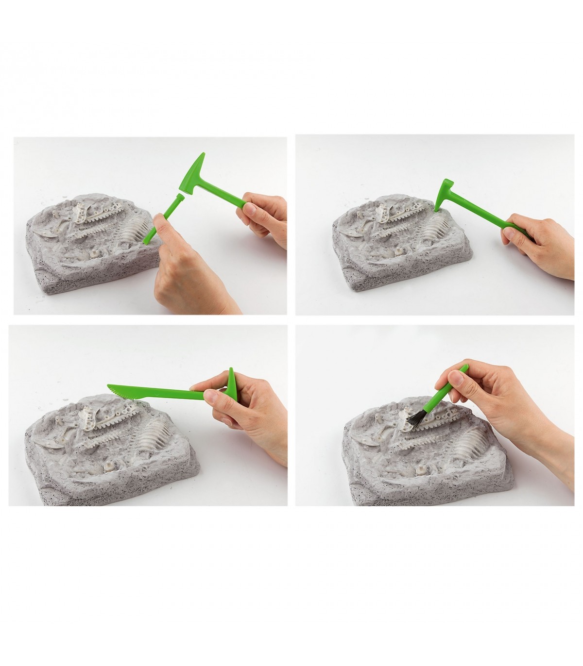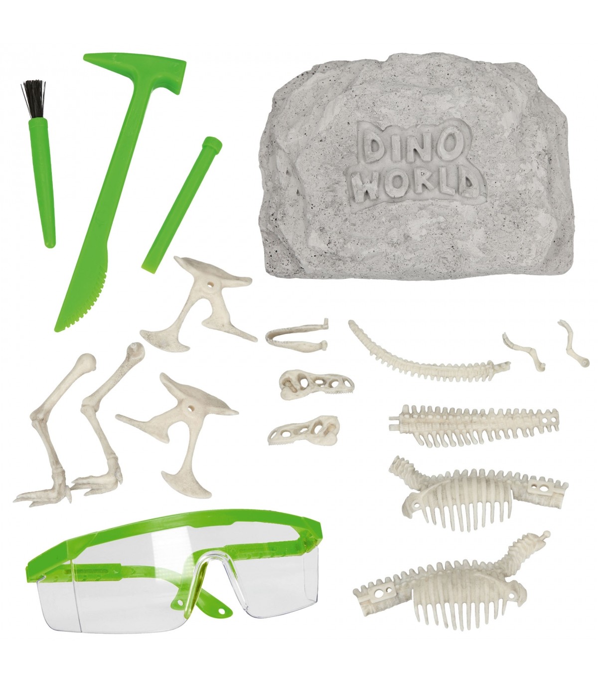 ¿Eres un auténtico paleontólogo en potencia? Perfecto, porque este bloque de yeso alberga el esqueleto de un dinosaurio esperando a que excaves y lo descubras. El set incluye todo lo que necesitas para hacerlo: picoleta, cincel, pincel y gafas de seguridad. Y con un poquito de paciencia, sacarás las 13 piezas del esqueleto con las que podrás recomponer tu propio escritoriosaurus rex.