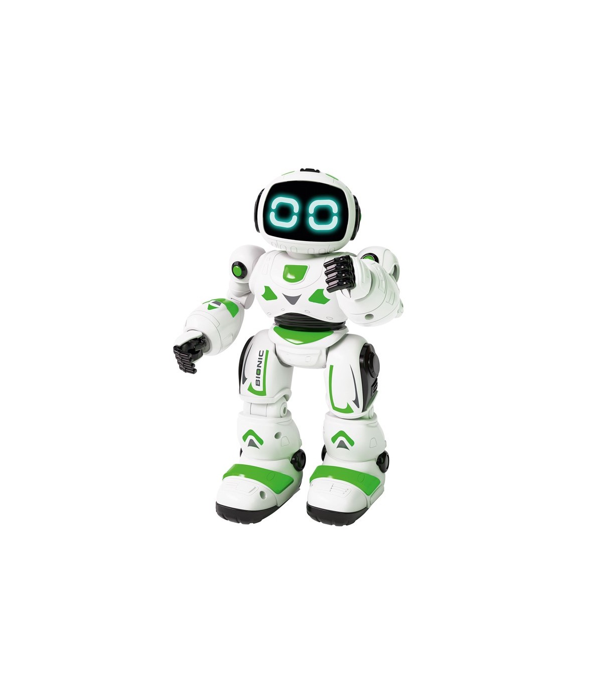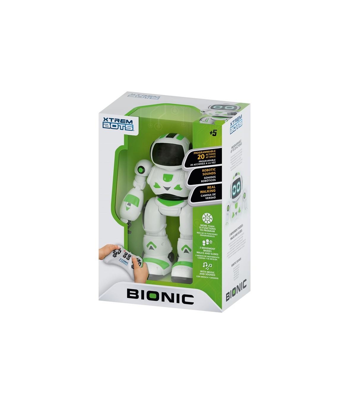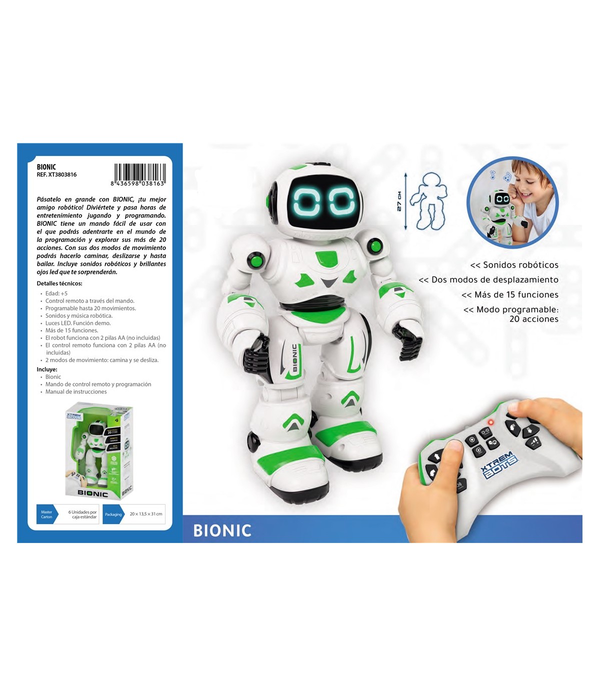 Pásatelo en grande con BIONIC, ¡tu mejor amigo robótico! Diviértete y pasa horas de entretenimiento jugando y programando. BIONIC tiene un mando fácil de usar con el que podrás adentrarte en el mundo de la programación y explorar sus más de 20 acciones. Con sus dos modos de movimiento podrás hacerlo caminar, deslizarse y hasta bailar. Incluye sonidos robóticos y brillantes ojos led que te sorprenderán.